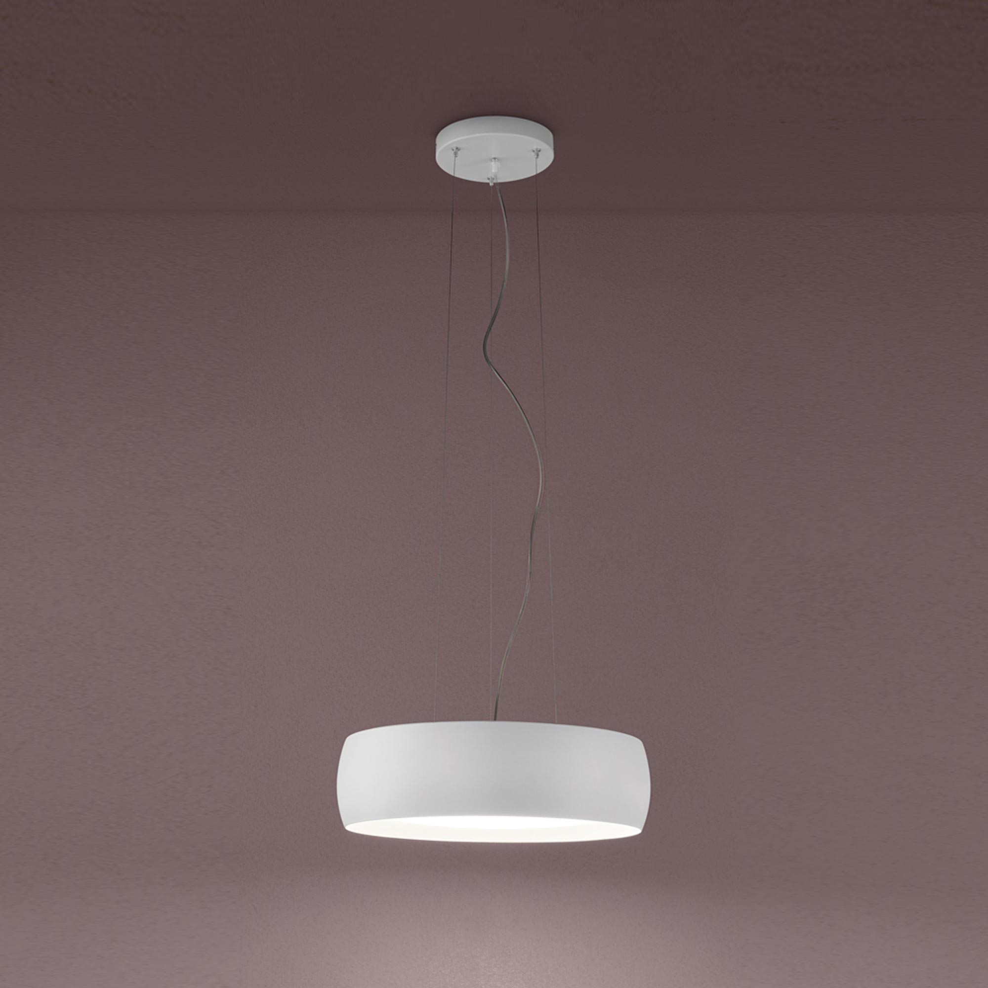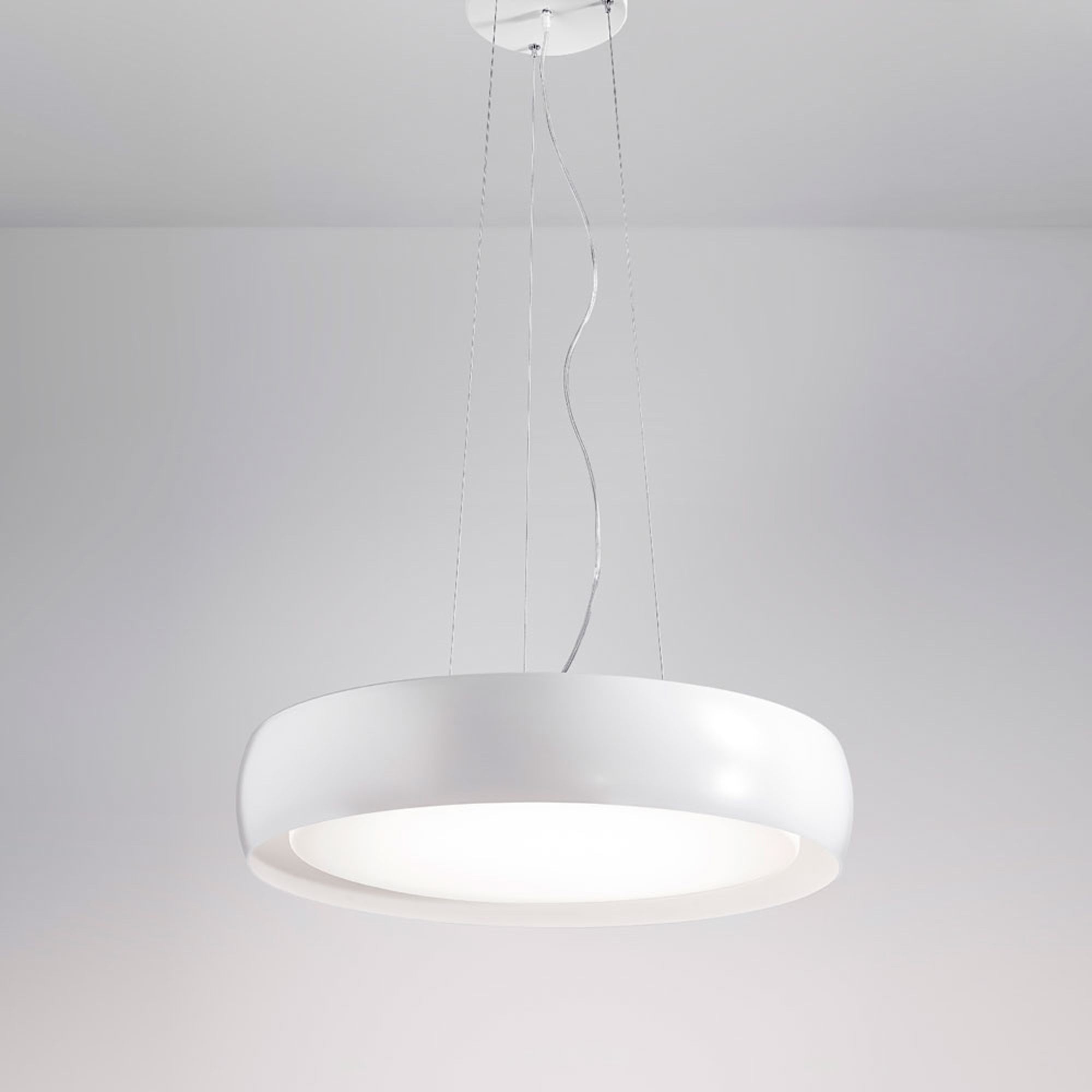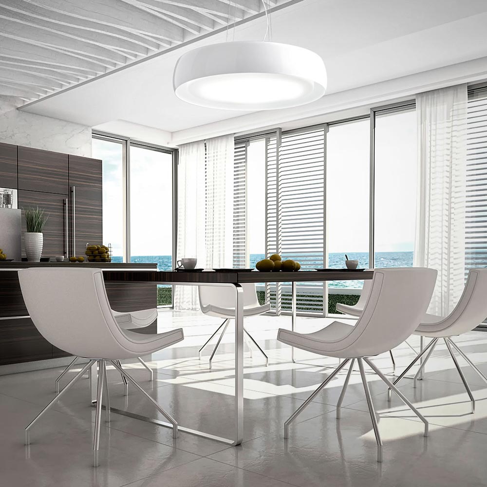 A chic disc silhouette meets the eye with elegance and simplicity blended together as the Treviso Pendant Light from Zafferano America suspends over a custom dining or living area. Direct and diffused light emits from a pendant with a gentle curving that adds to artistry and finesse. A blown glass diffuser delivers delicate beauty meshing with a slender metal trim ring.
