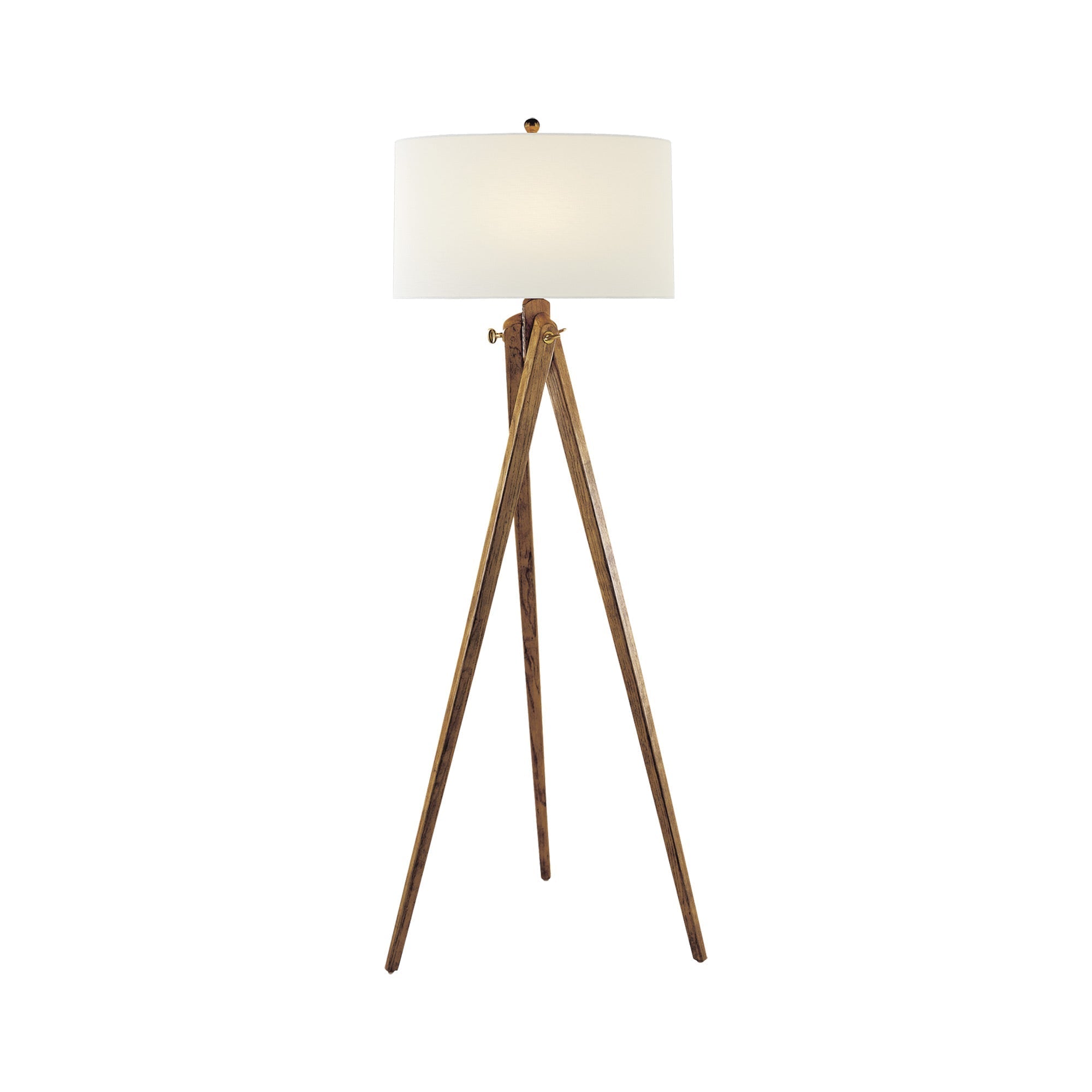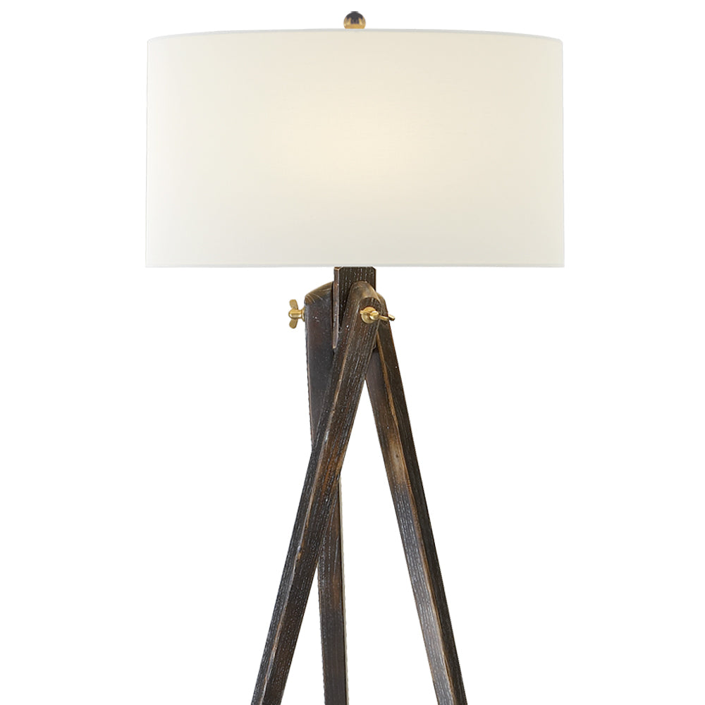 Hardware details emphasize the craftsmanship and character of the Tripod Floor Lamp from Visual Comfort Signature. Its tapering legs create a conical silhouette, the hallmark of a tripod configuration, catching the eye in a den or living room. The wood legs add a hint of rugged authenticity, while a drum shade on top delivers inviting illumination for tasks and ambiance.