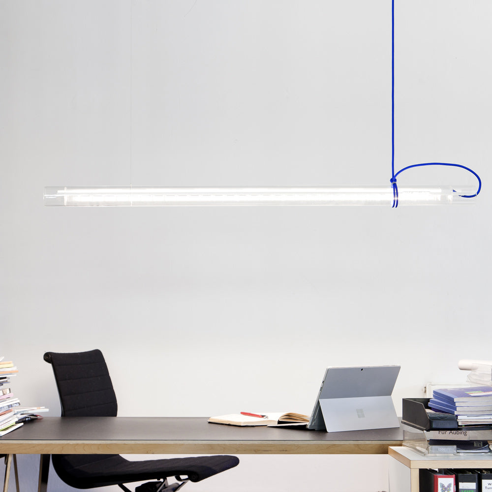 Travel into the future to appreciate the utilitarian design of a light fixture contributing superior performance and a crisp style. The Tubular LED Pendant Light from Ingo Maurer uses a rotating glass tube to customize lighting directionality while maintaining a low profile. Symmetry takes a back seat to suspension at the tube's edge through a pop of blue cable.