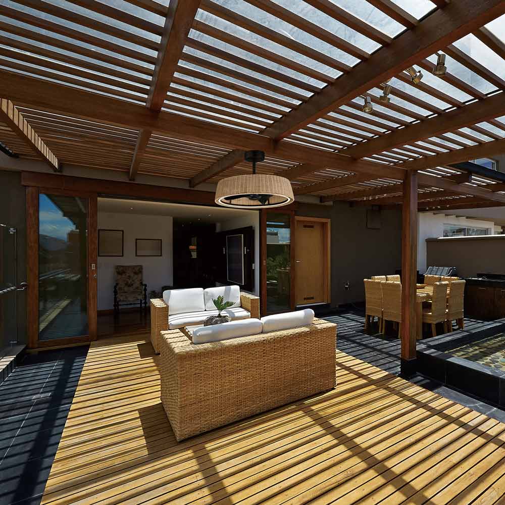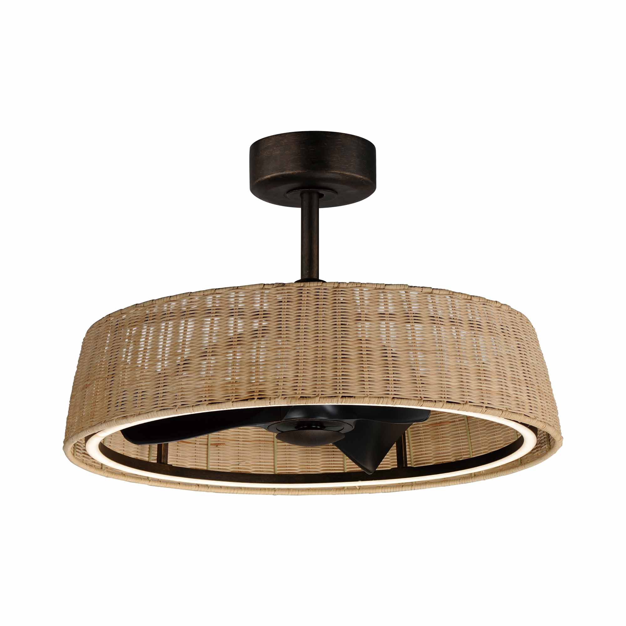 Easy organic style is dramatized by the use of bold dark bronze metal as the Tulum Outdoor LED Ceiling Fan from Maxim Lighting offers a casual island feel. Wrapped in coated rattan and encircled with an LED ring, the frame of this fan houses blades that rotate on command to offer a cooling effect. With coastal ambiance and a slender design, this fan light is ideal for use in an outdoor entertaining space.