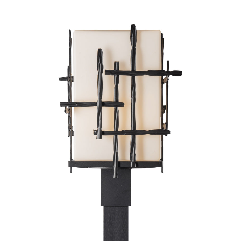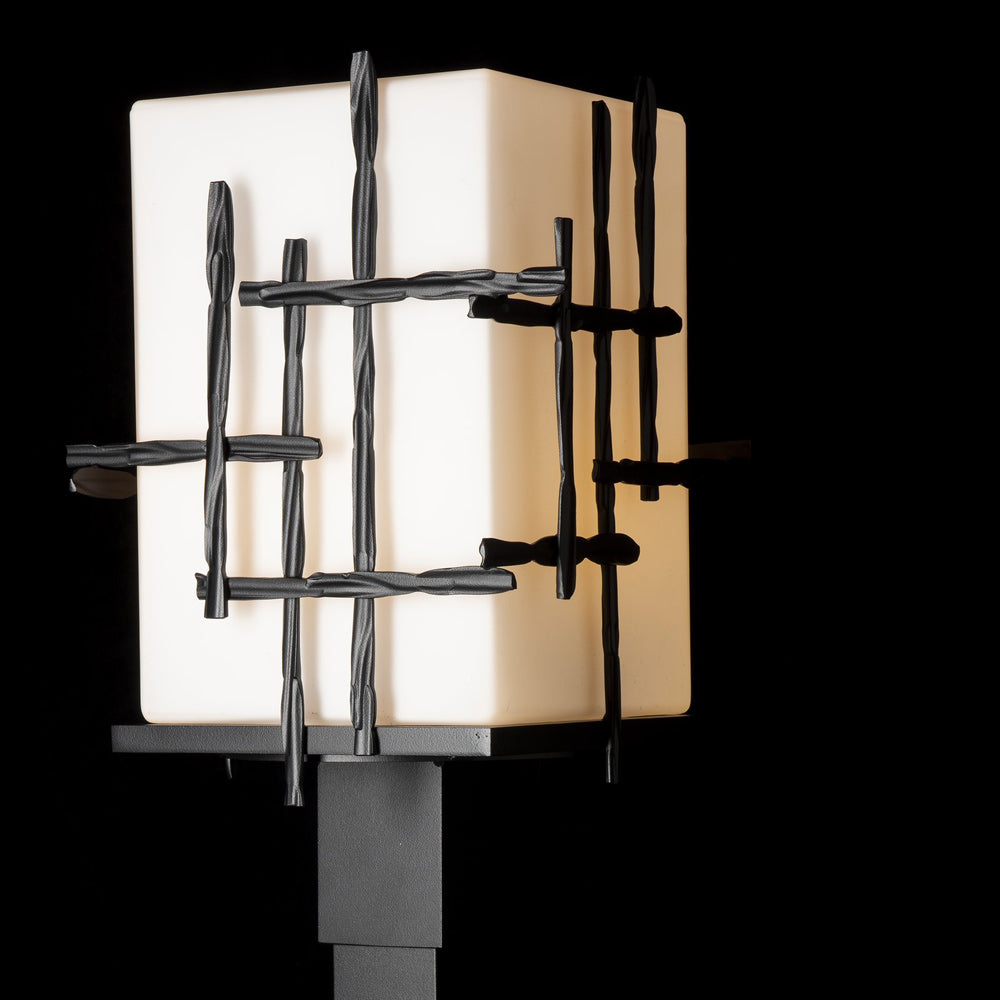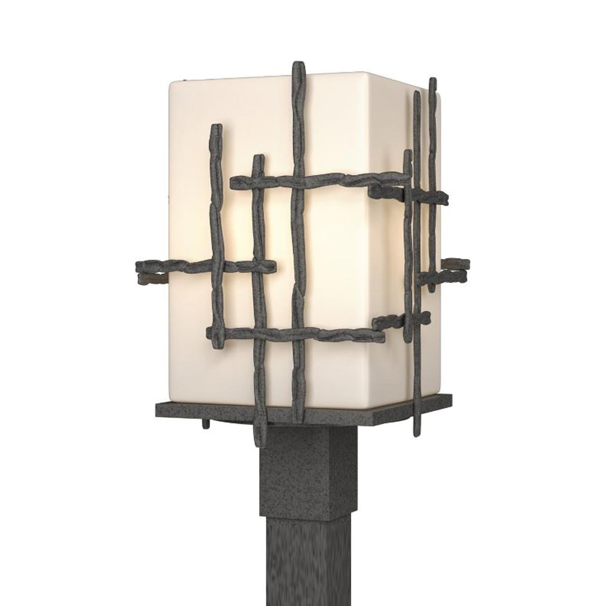 Perpendicular alignment creates a highlighting effect for wispy pieces of hammered aluminum, forming a light and open frame for an exterior post light. A hint of Asian influence merges with nature in the Tura Outdoor Post Light from Hubbardton Forge, emulating twig-like ambiance to pay homage to earthy elegance. Experience glowing light diffused through an opal glass shade that lends natural beauty to a garden space or custom yard area.