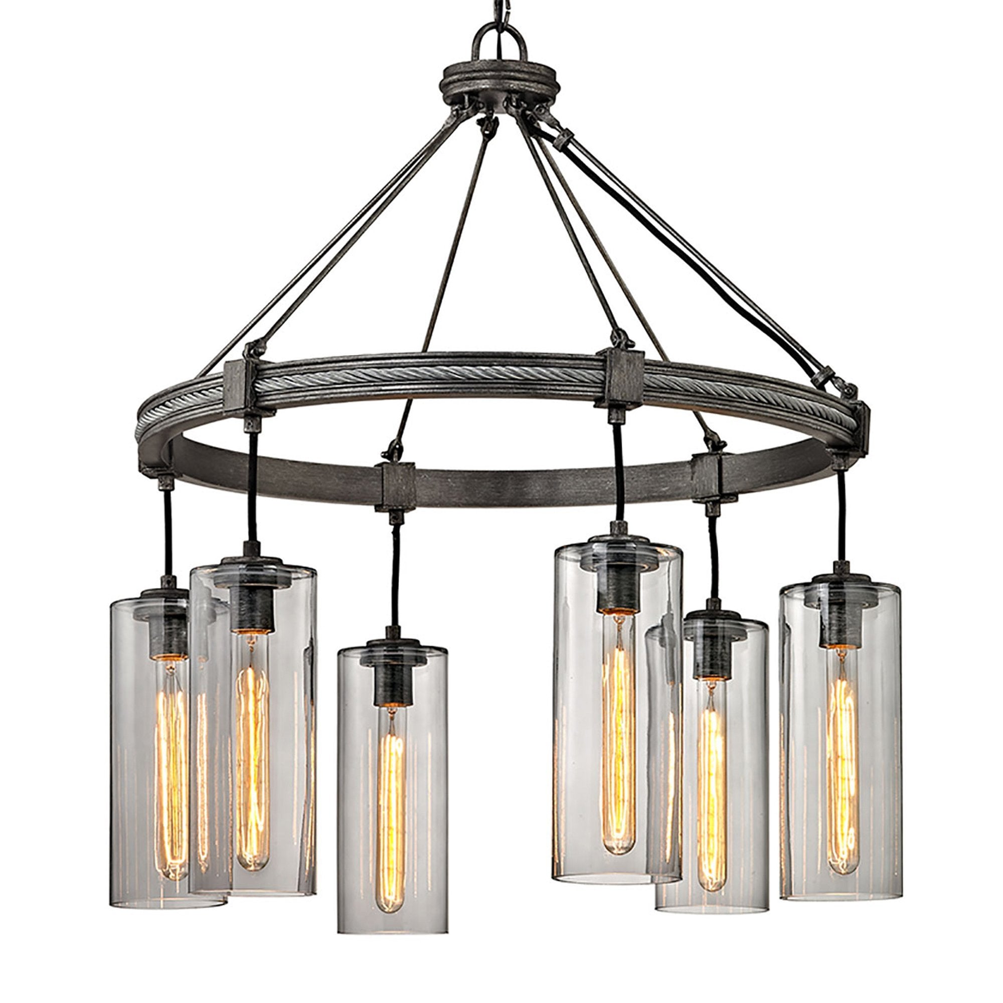 Tubular bulbs glow from within smoky glass hurricanes to emphasize the industrial underpinnings of this graphite finish Union Square Chandelier from Troy Lighting.