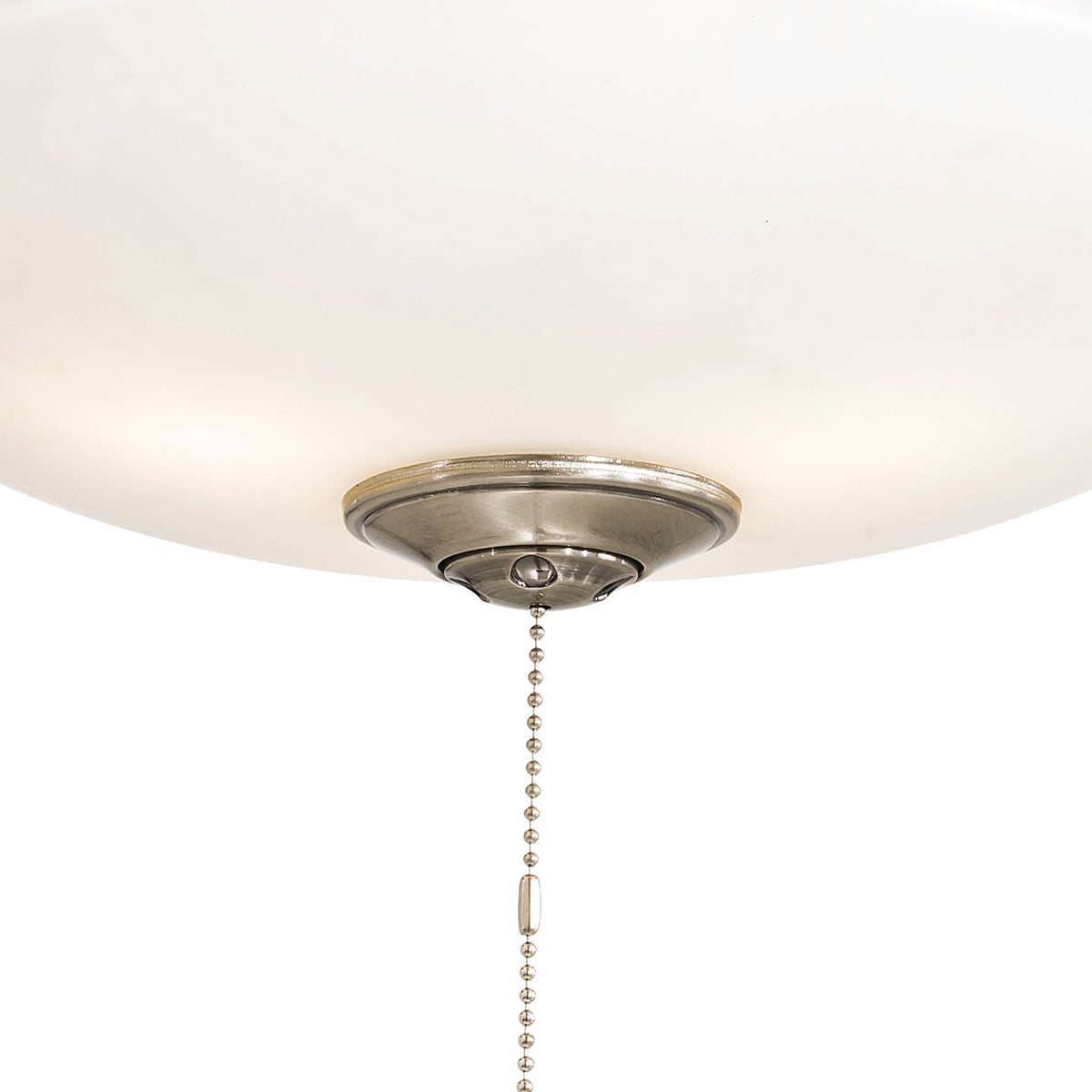 Elegant simplicity conforms to versatile design schemes, adding a tasteful look to ceiling fans in modern or transitional living spaces. The Universal K9120L LED Fan Light Kit from Minka Aire offers a classic saucer-shaped shade made of ethereal frosted white finish glass, as three lights infuse energy-efficient illumination in a living room, entryway, or bedroom. An ornate metal cap and pull chain wrap up a low-key yet sophisticated look.