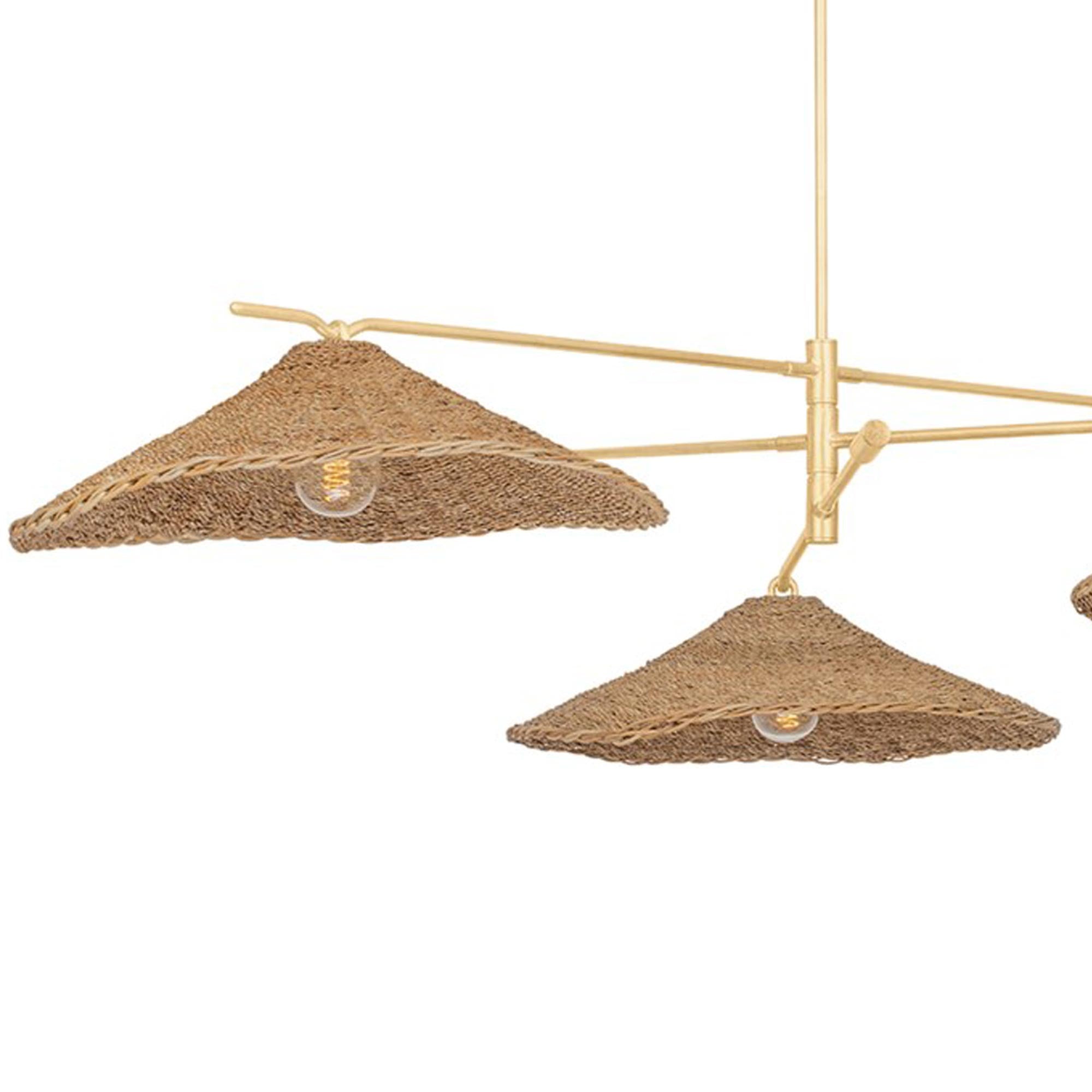 Indulge in the lightness of a tropical motif dressed up with tasteful glam character. The Valier Chandelier from Troy Lighting emphasizes a coastal aesthetic with a trio of imperfectly shaped woven Lampakanay grass shades attached to intersecting slender metal rods with a gleaming vintage gold leaf finish. The heightened expressive quality of mixed styles brings an intriguing and complementary look in a fixture with timeless appeal.
