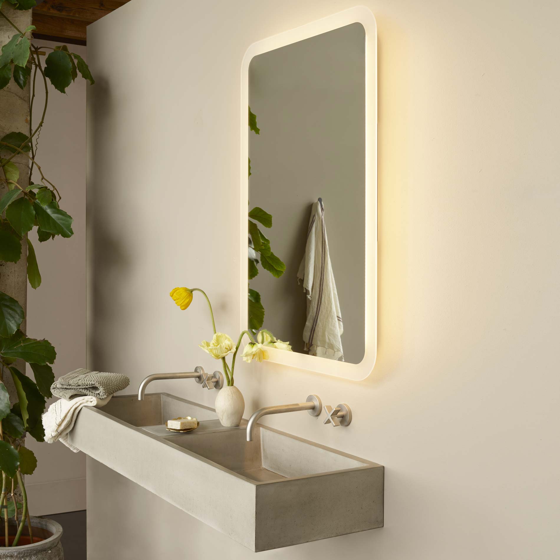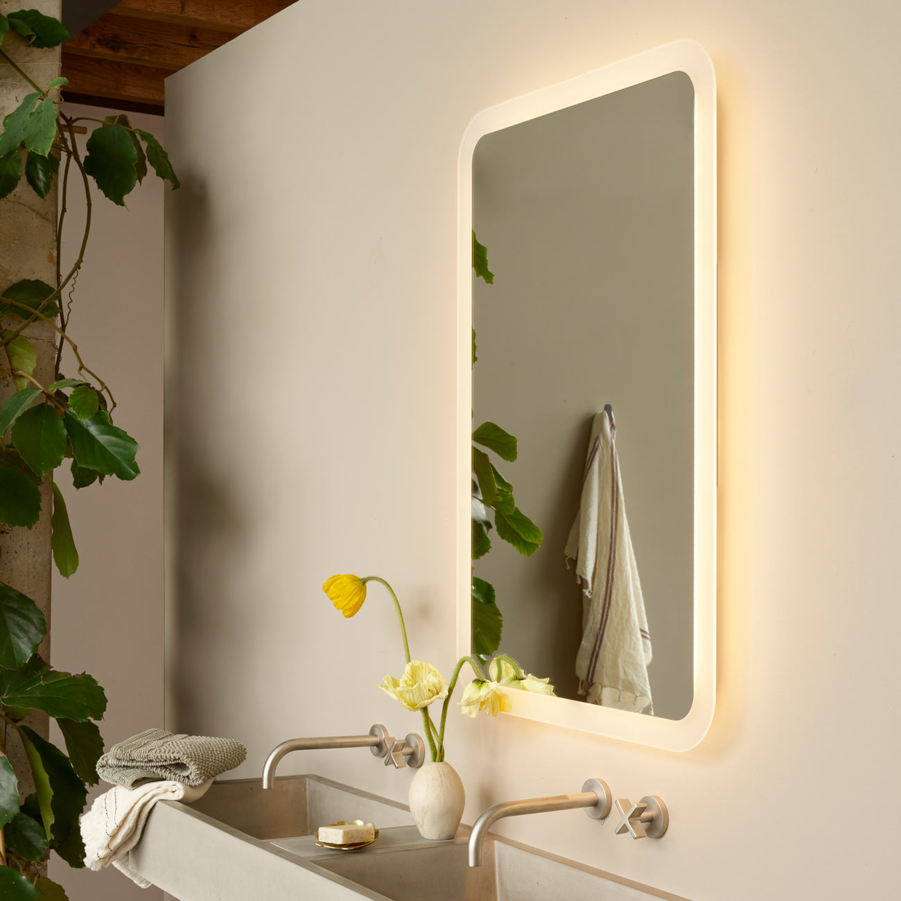 Retro sensibility returns in the design of a classic mirror with Mid-Century Modern influence and contemporary functionality. Choose the Varenna Rectangle LED Illuminated Mirror from Astro Lighting to achieve full benefits of lighted mirrored glass framed in sandblasted chamfered edges. Hidden LED modules infuse soft, glowing illumination in just the right levels for a bath or dressing space.
