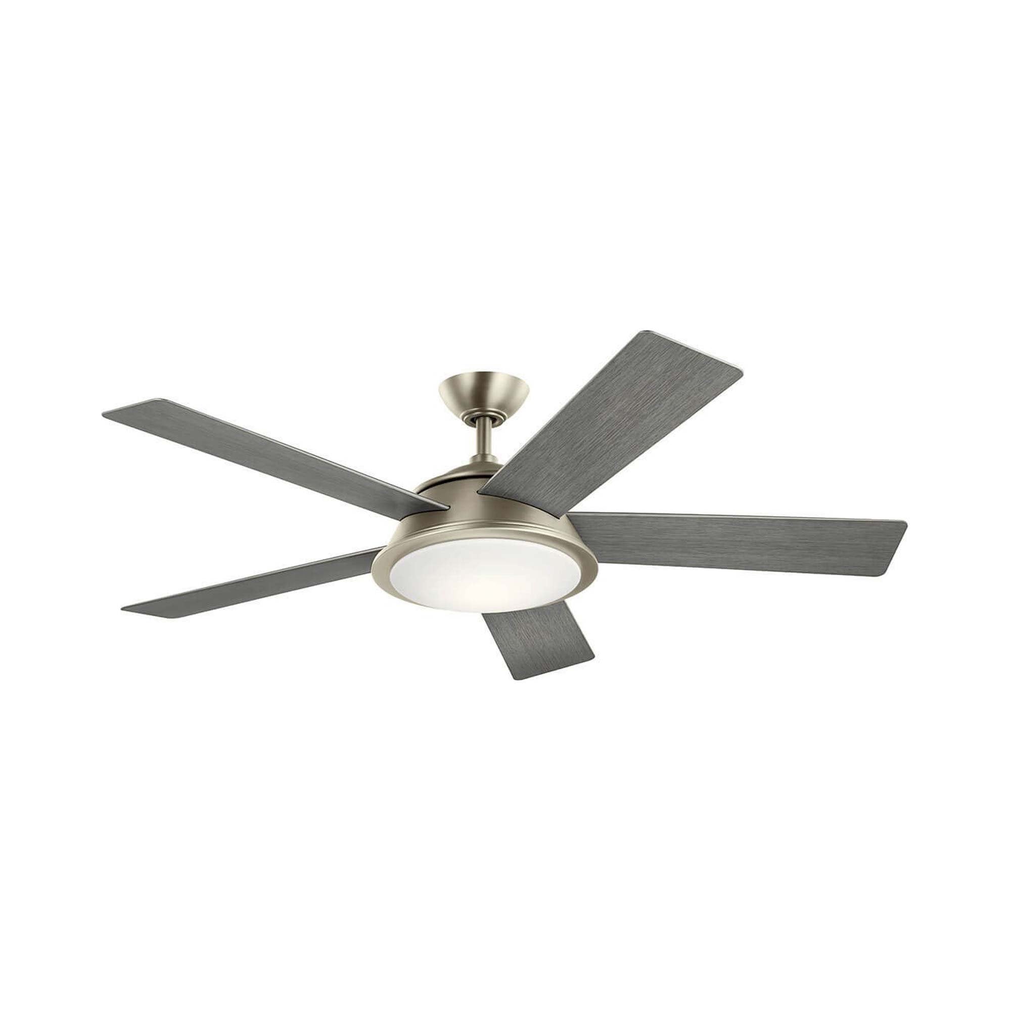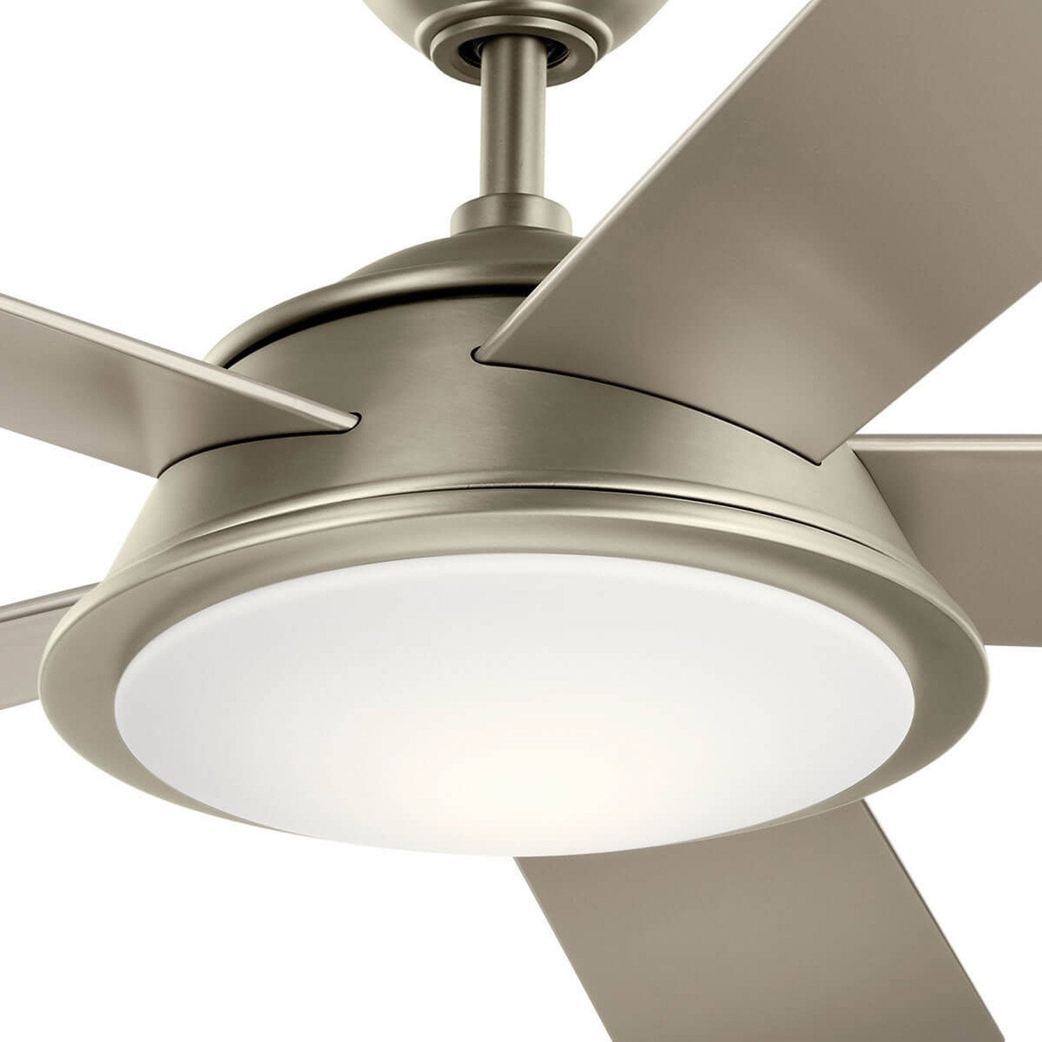 This 56" Verdi™ LED ceiling fan is vintage coastal at its finest. Its blades were inspired by vintage faucet handles and feature reversible finishes in Silver and Driftwood. Its body in Brushed Nickel beautifully anchors the fixture, and its integrated light shines through Etched Cased Opal Glass.