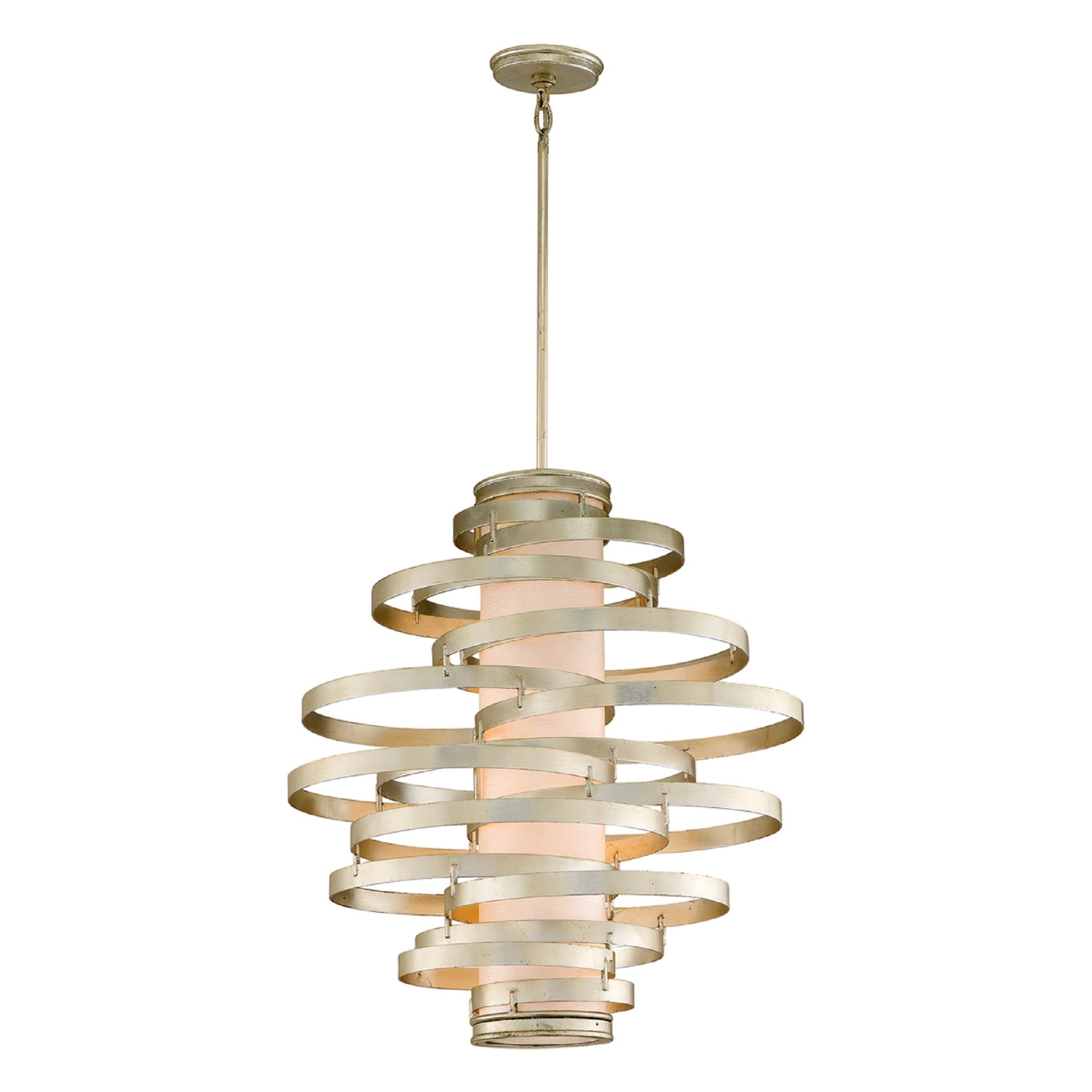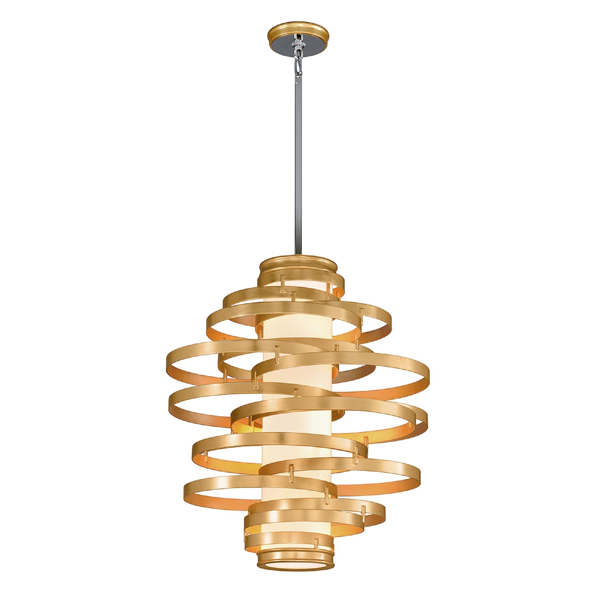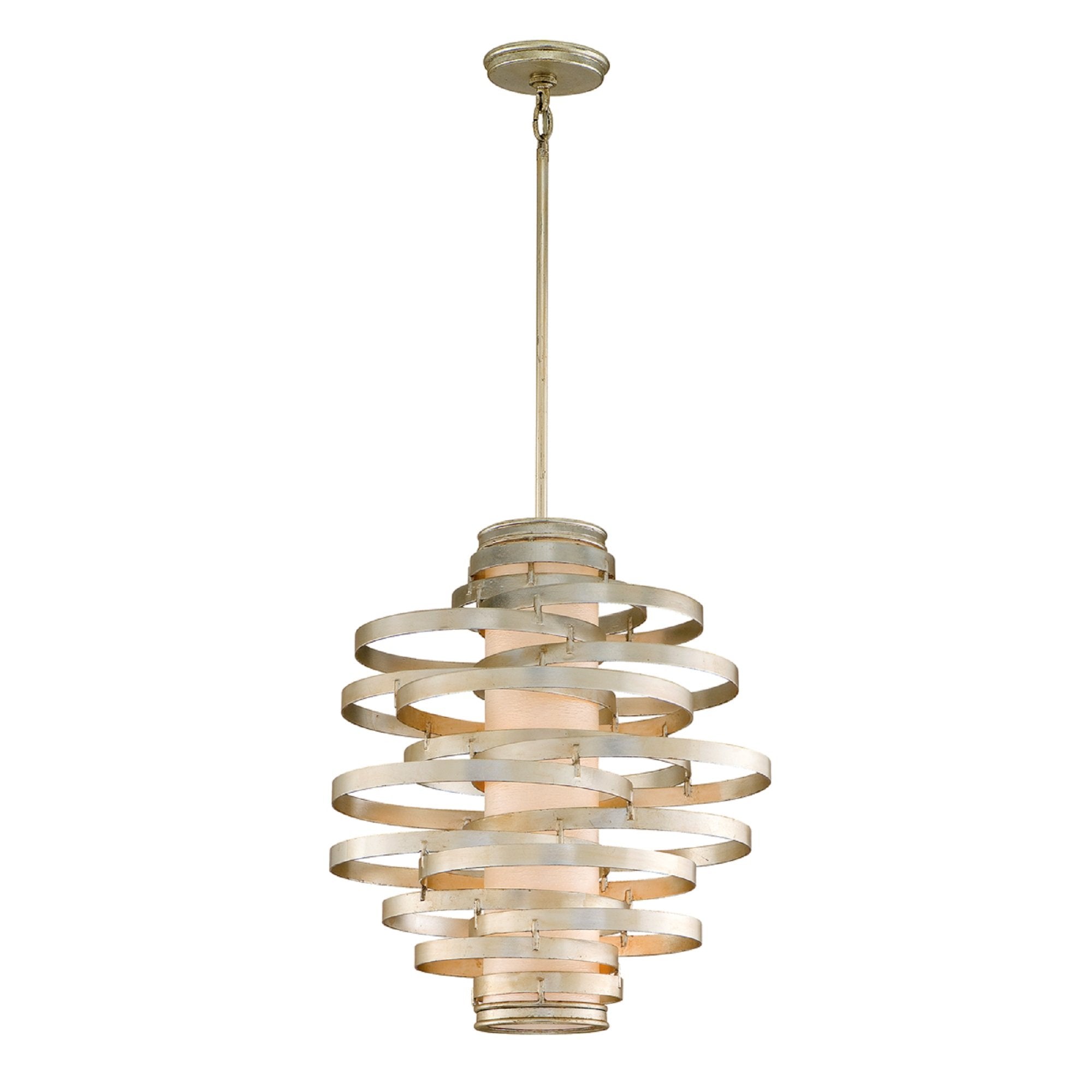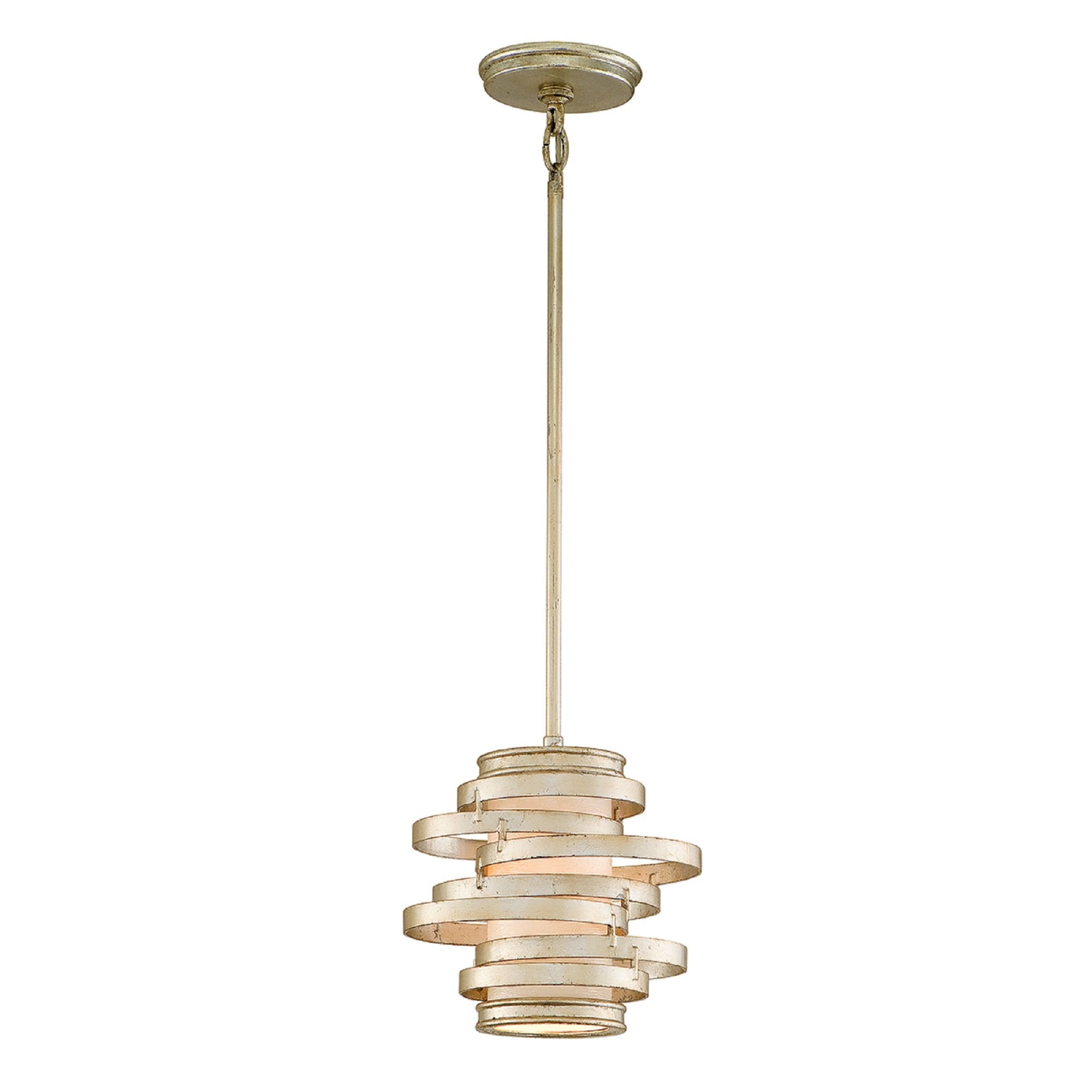 The Vertigo Pendant Light from Corbett Lighting employs a bold and busy design to keep things interesting, showcasing a festive ring motif formed from fused circles that surround a glass cylinder diffuser.