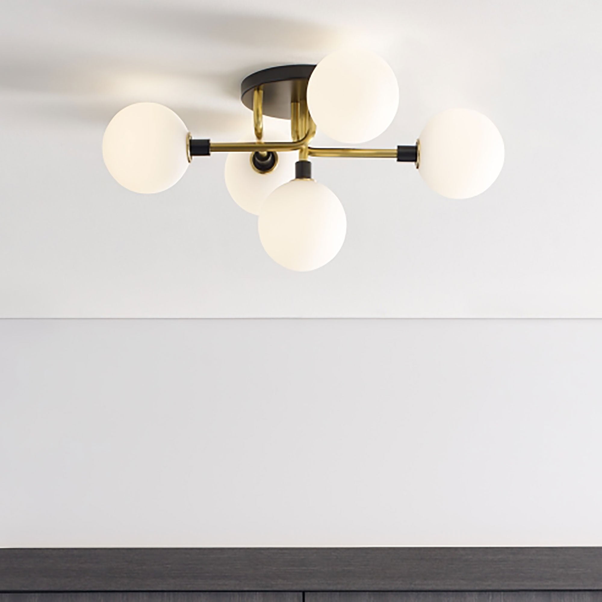 The Viaggio Flush Mount Ceiling Light by Sean Lavin for Visual Comfort Modern features an artistic cluster of glass orbs for a sense of celestial travel within a room. A sleek black body contrast against either solid brass arms with white glass globes or polished nickel arms with mirrored smoke globes for a rich and stunning finish, either choice creates a comfortable glare-free wash of illumination onto surfaces below. The Viaggio Flush Mount Ceiling Light is ideal for dining room lighting, living room lighting and bedroom lighting. The Viaggio can carry into other areas of your space as this collection is available as a linear suspension, wall sconce and chandelier. Available lamping options include fully-dimmable energy efficient LEDs or no-lamp, leaving you the option to light the Viaggio with your preferred lamping.