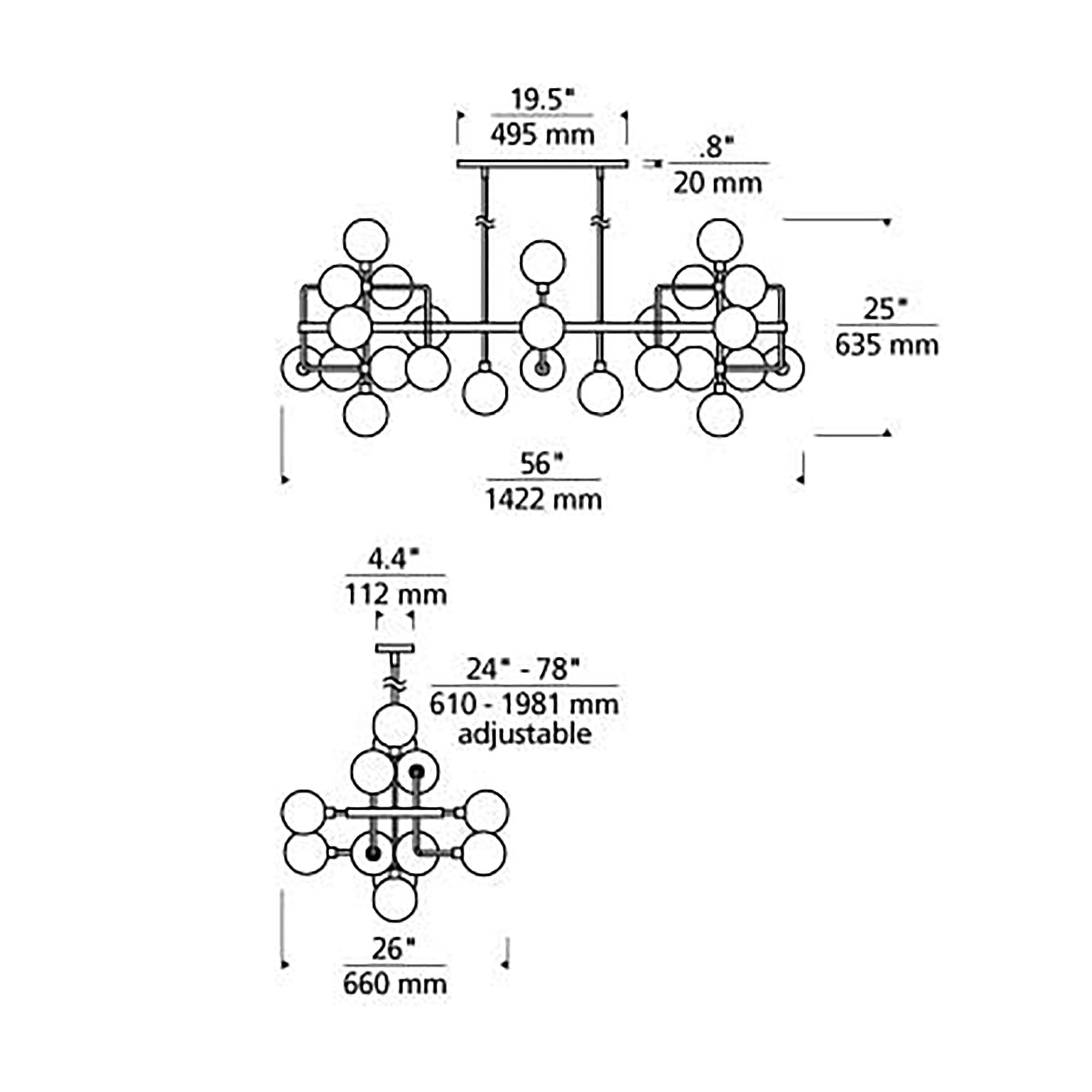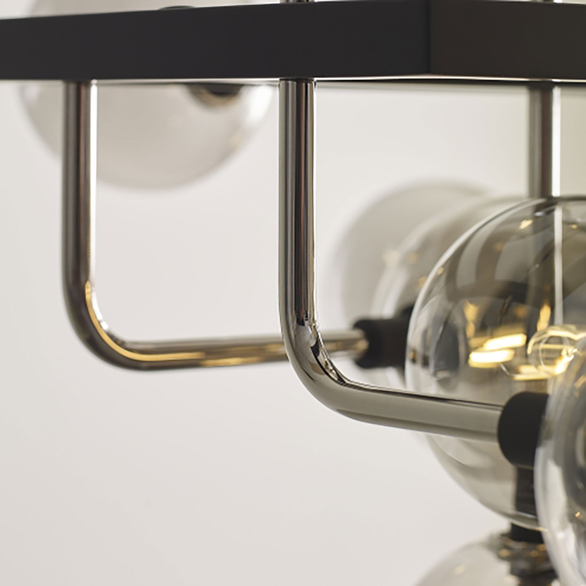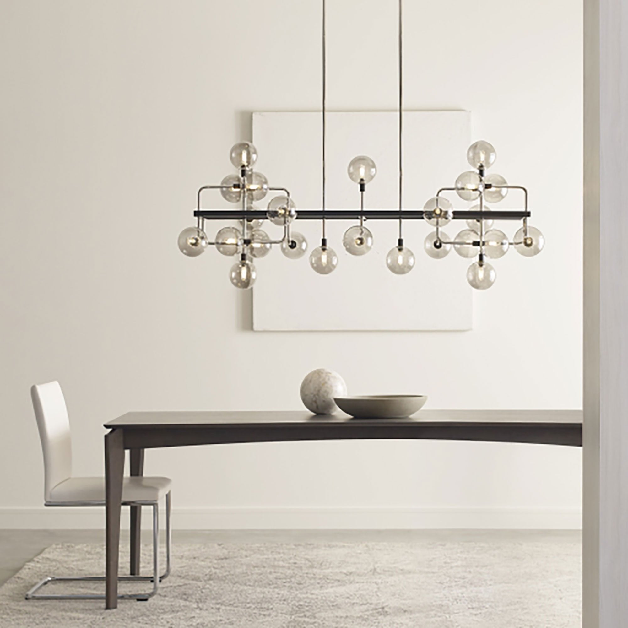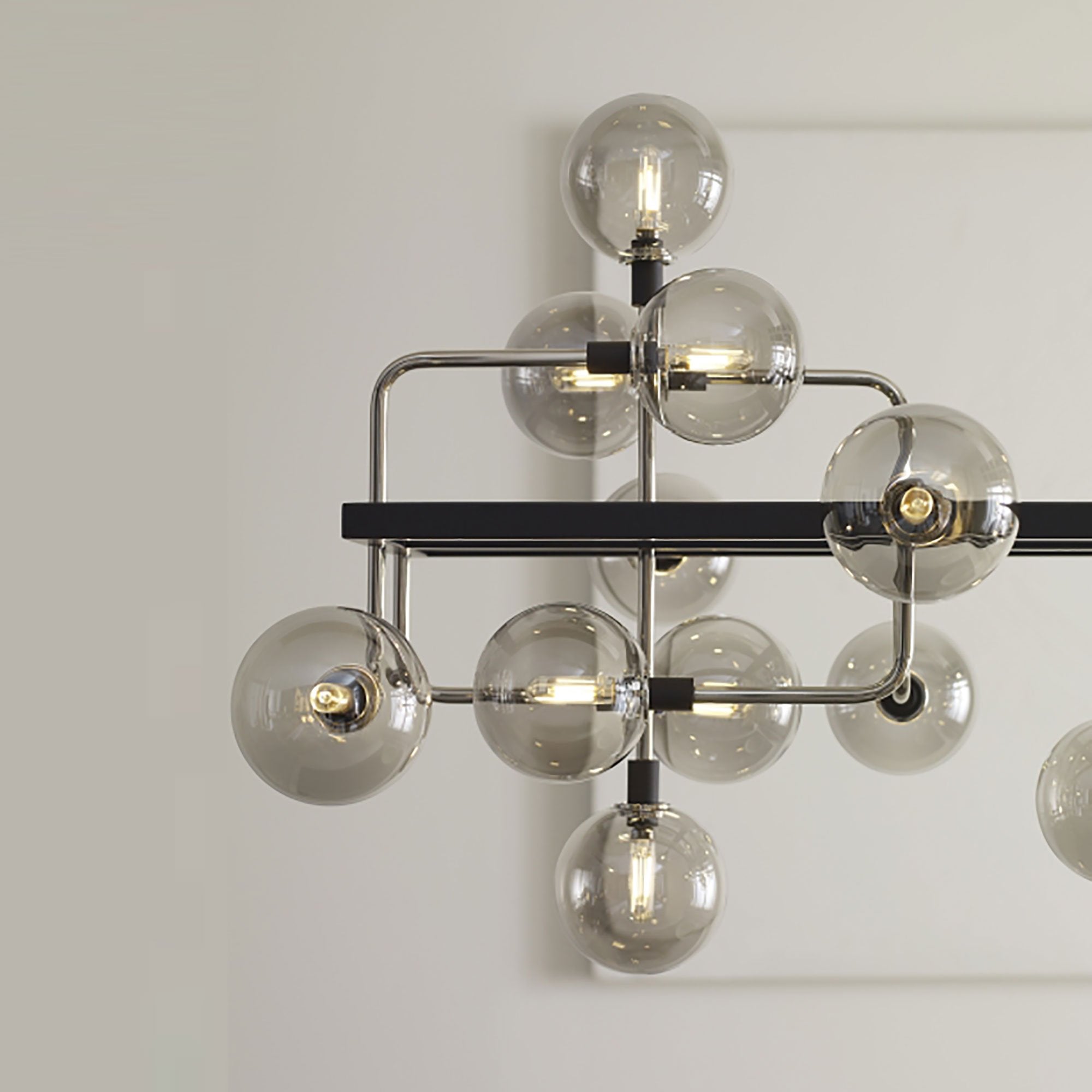 The Viaggio Linear Pendant Light by Sean Lavin for Visual Comfort Modern features an artistic cluster of glass orbs for a sense of celestial travel within a room. Your choice of two gorgeous finish options include a sleek black body contrasted against solid Brass arms with white glass globes or polished nickel arms with mirrored smoke glass globes, either option will create a comfortable glare-free wash of illumination onto surfaces below. The Viaggio Linear Pendant Light is ideal for dining room lighting, living room lighting and commercial lighting applications. The Viaggio can carry into other areas of your space as this collection is available as a chandelier, flush mount and wall sconce. Available lamping options include fully-dimmable energy efficient LEDs or no-lamp, leaving you the option to light the Viaggio with your preferred lamping.