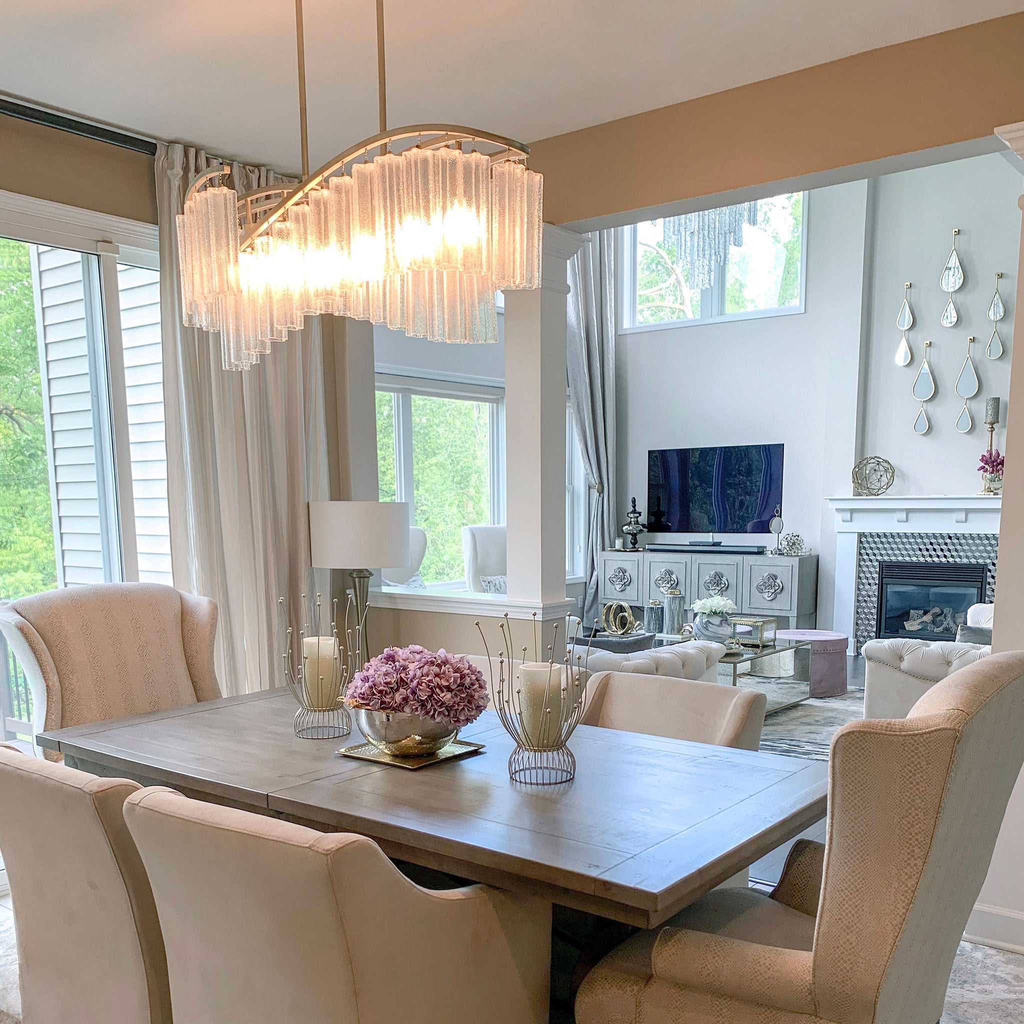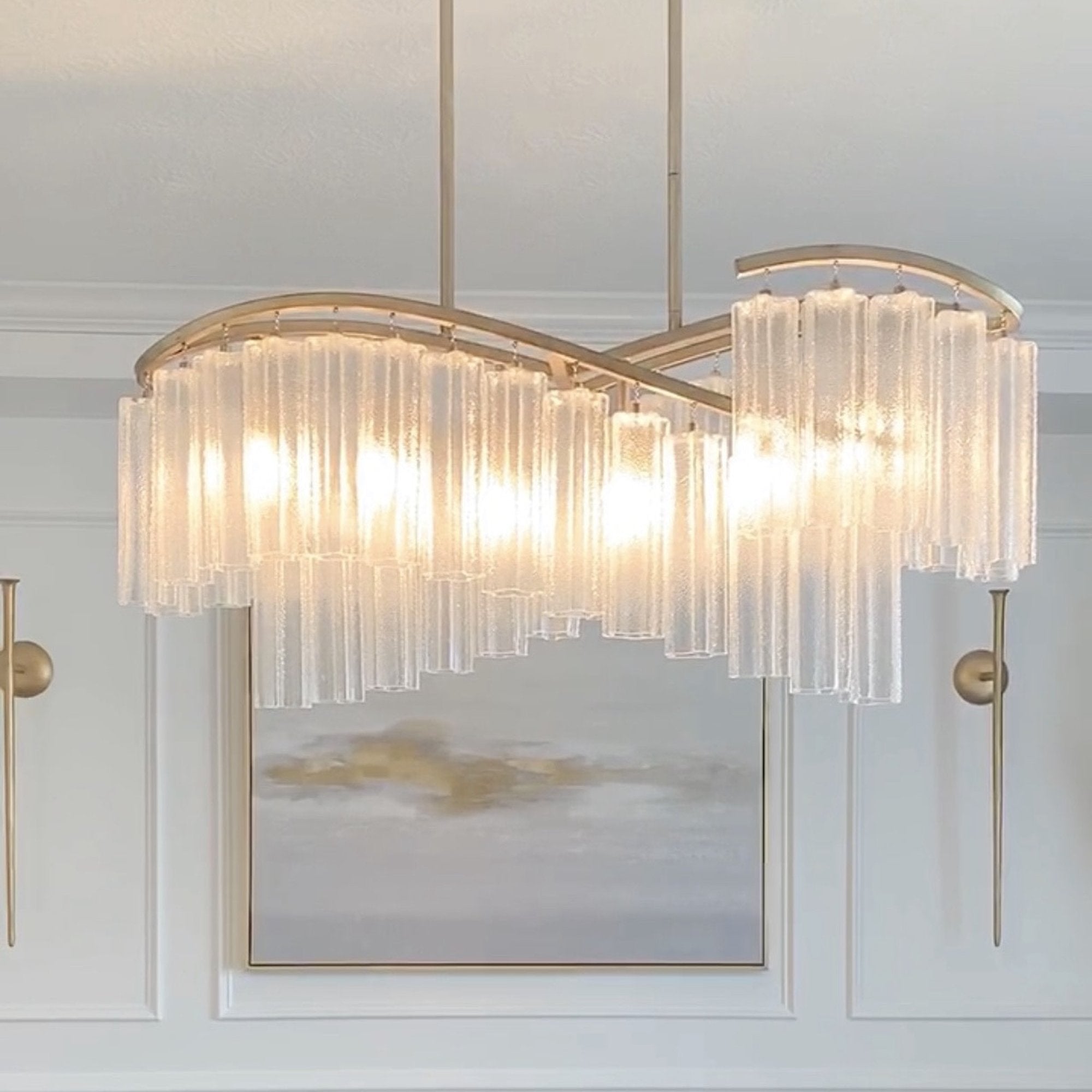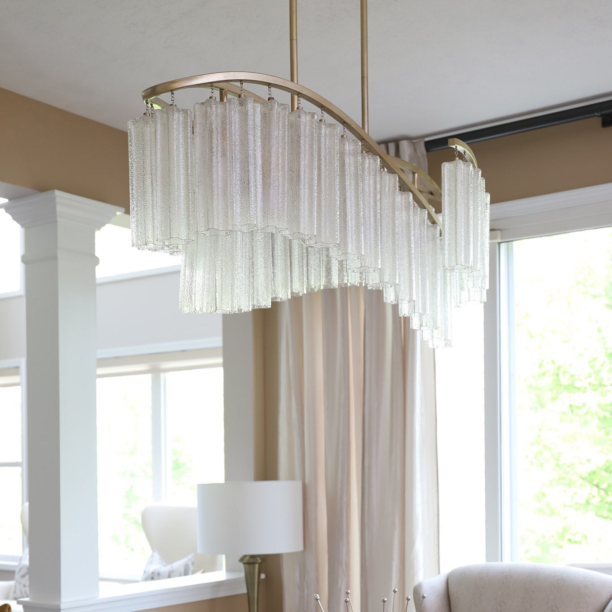 Perfectly suited for accenting elegant dining tables, the Victoria Linear Suspension Light from Maxim Lighting lends a dramatic flair with its undulating, dripping glass exterior and metallic finishes.