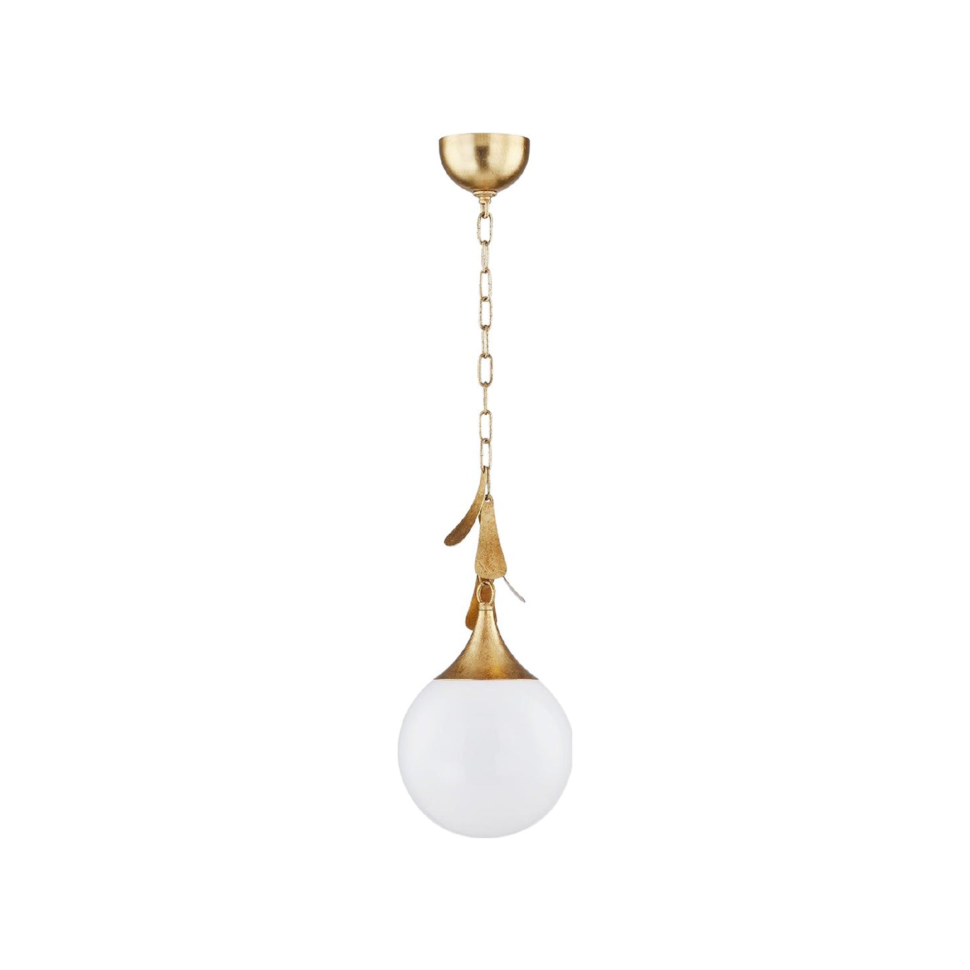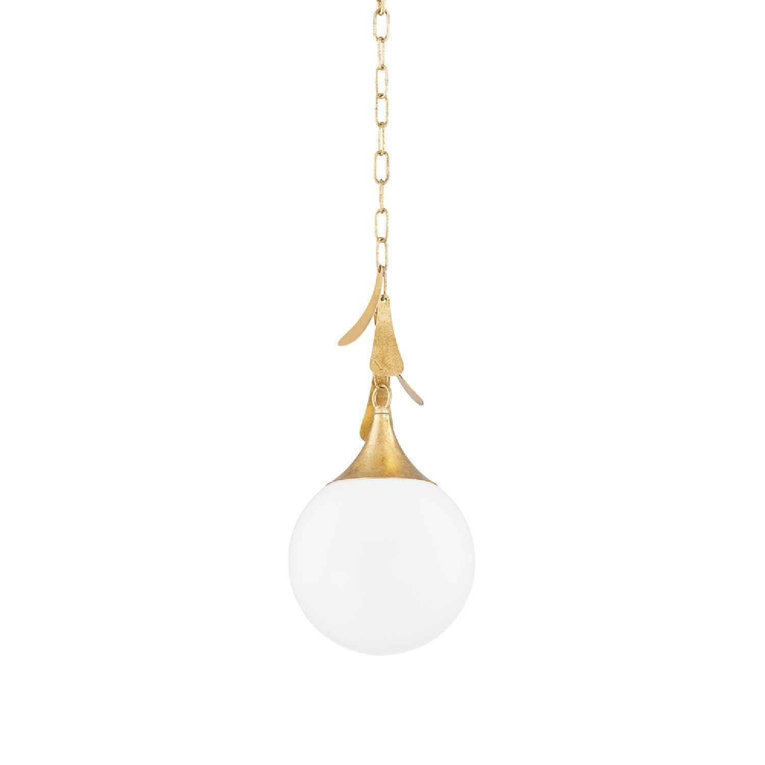 Delicate petals bring fresh, organic energy to the Victoria Pendant Light from Mitzi. A timeless silhouette pairs a conical cap and glossy opal glass sphere, enhanced with floral details that infuse charming character and artistry. Simply stunning alone or grouped to create a larger installation.