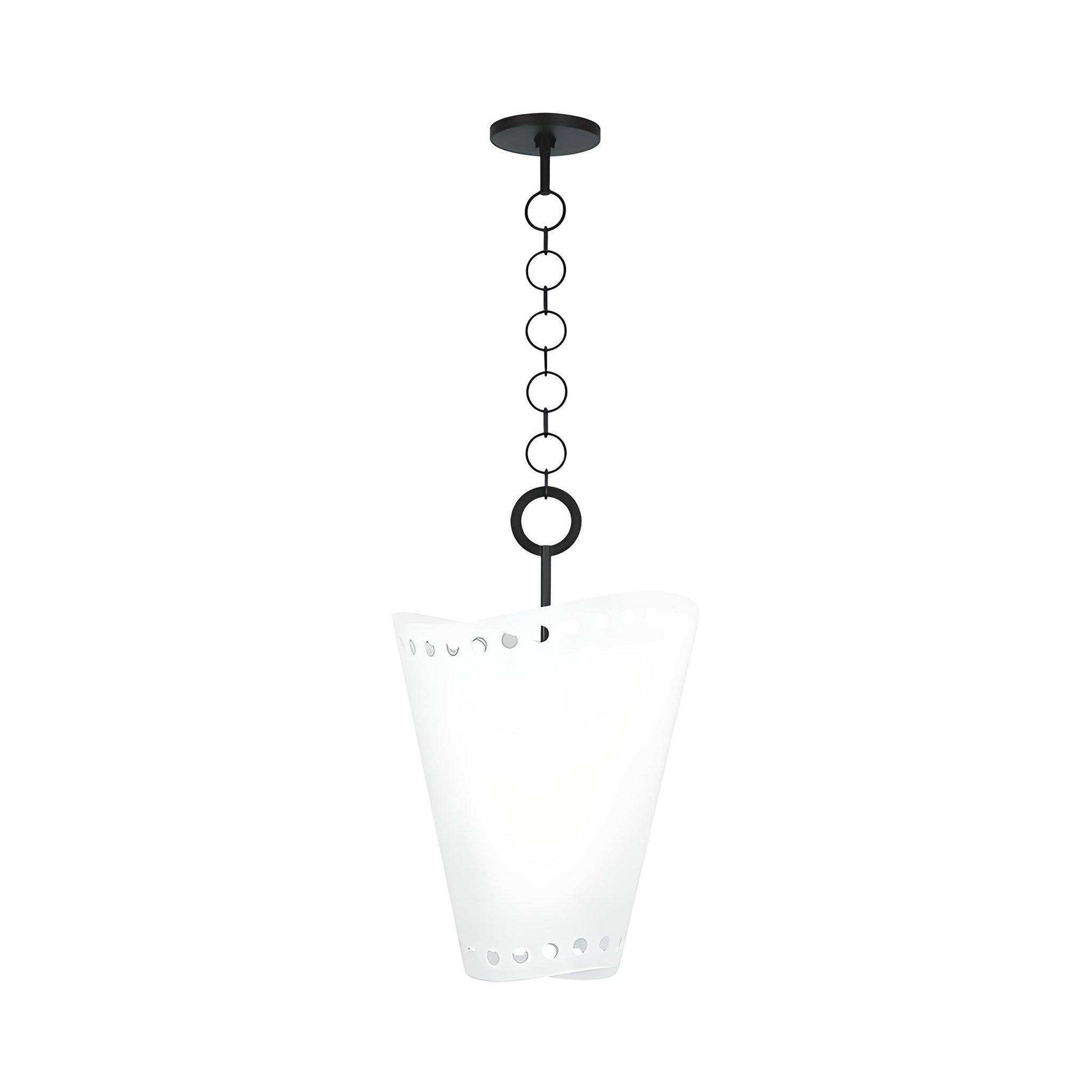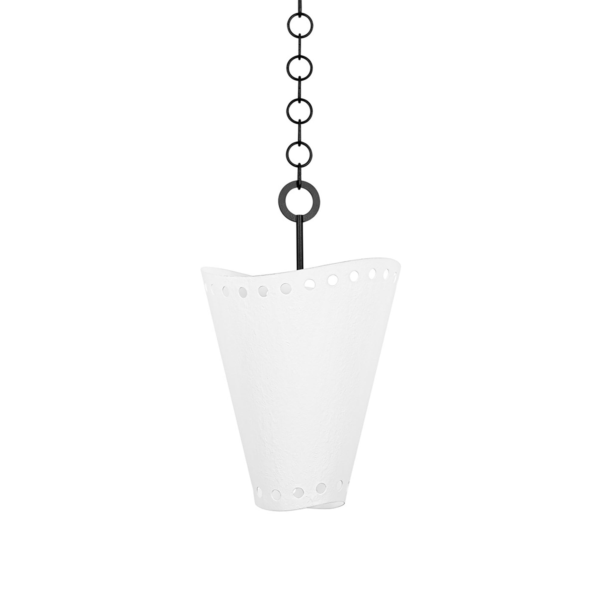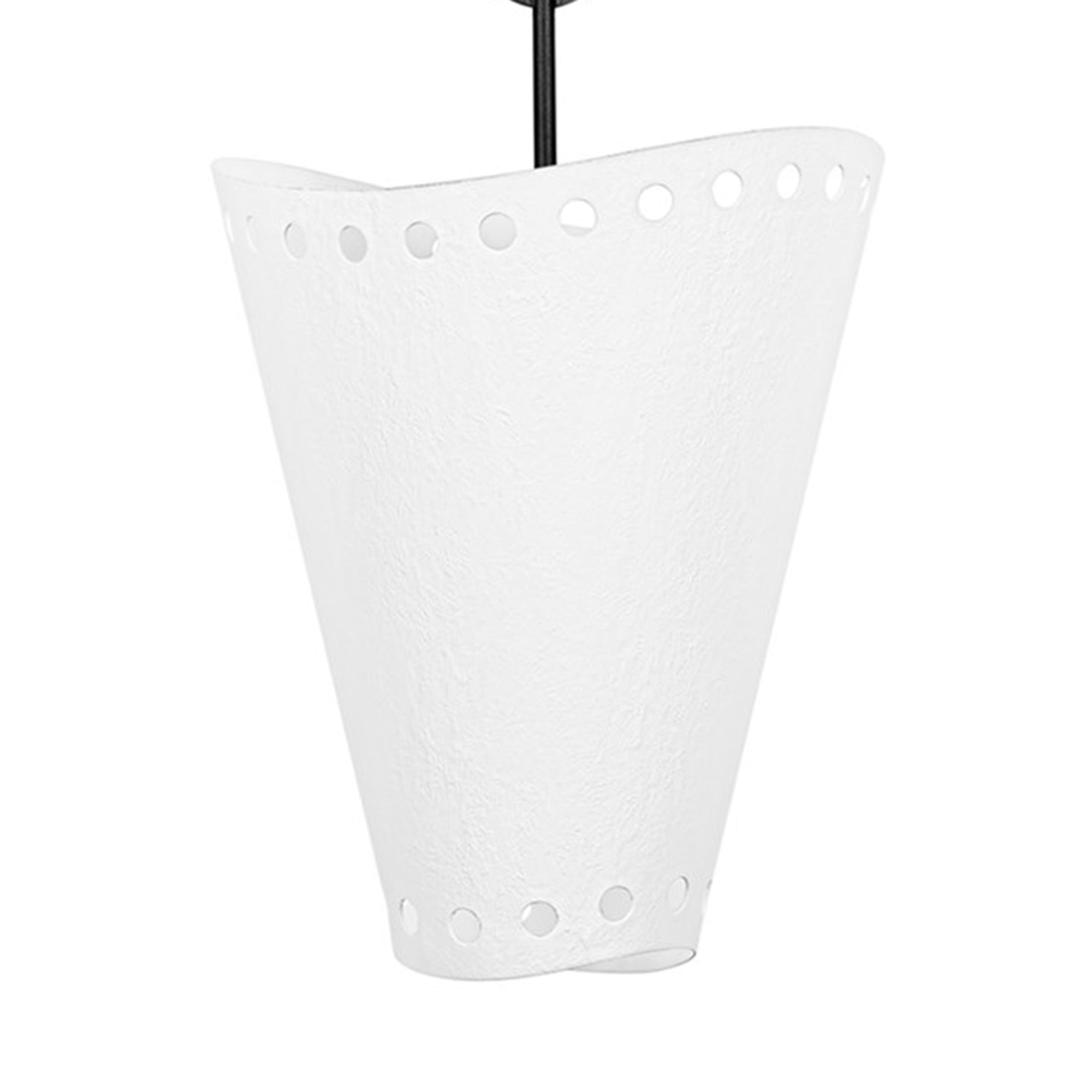 Embrace an artsy casual feel with a contrasting palette as add accent lighting to an informal space. The Visalia Pendant Light from Troy Lighting offers an inspired design featuring a conical metal shade accented with perforations and a swirling edge, calling out a contrasting finish palette of white gesso and bold forged iron. This fixture creates a festive mood in any setting.