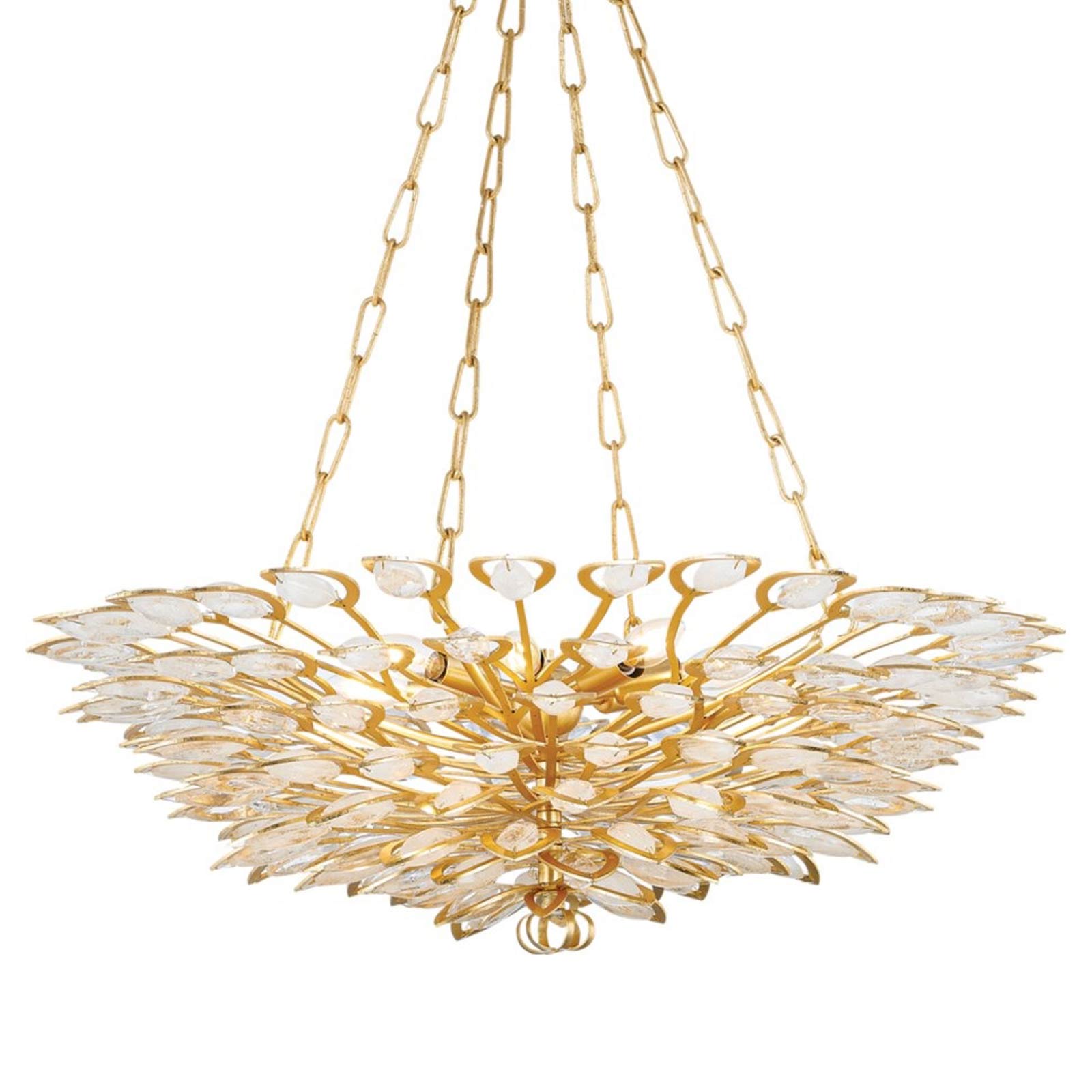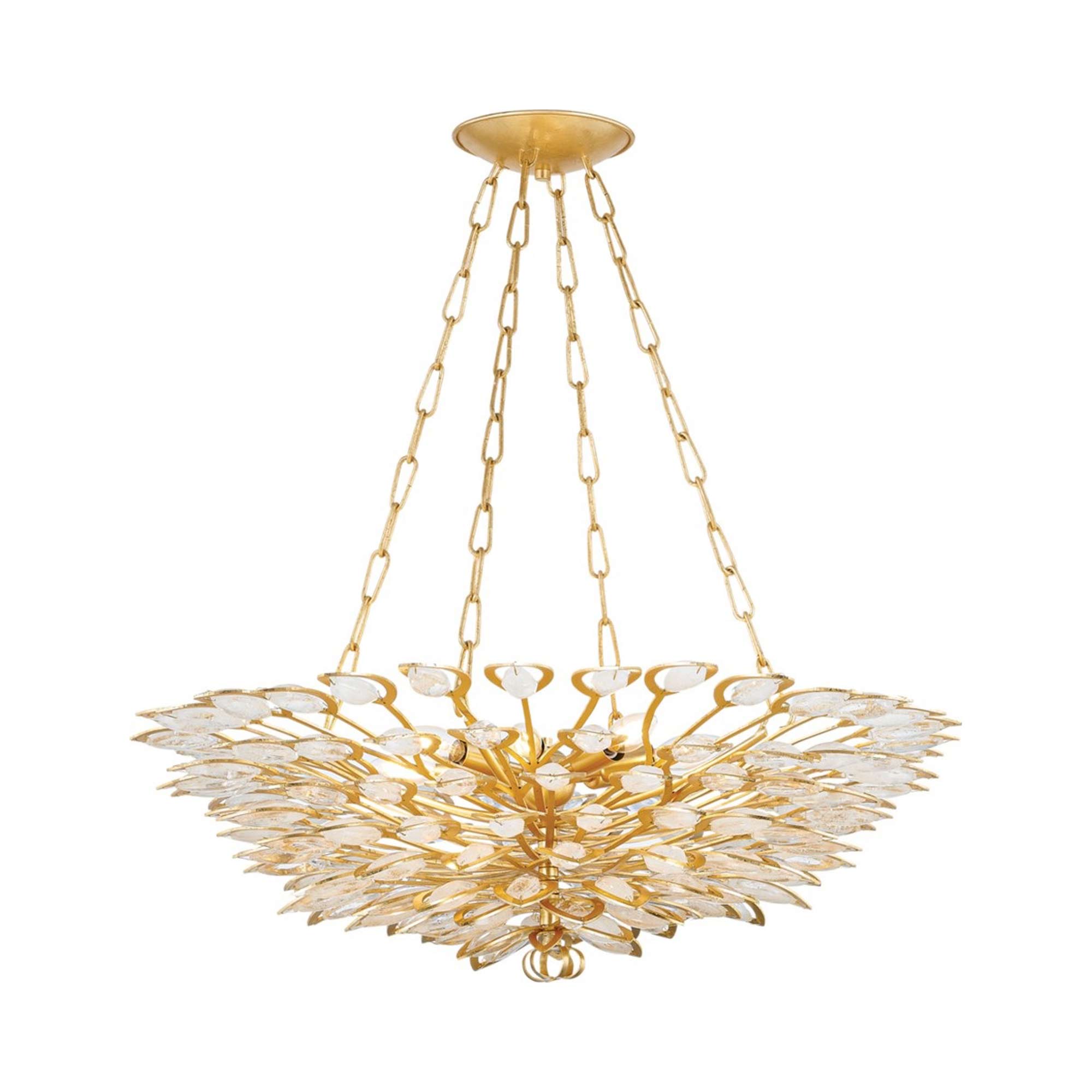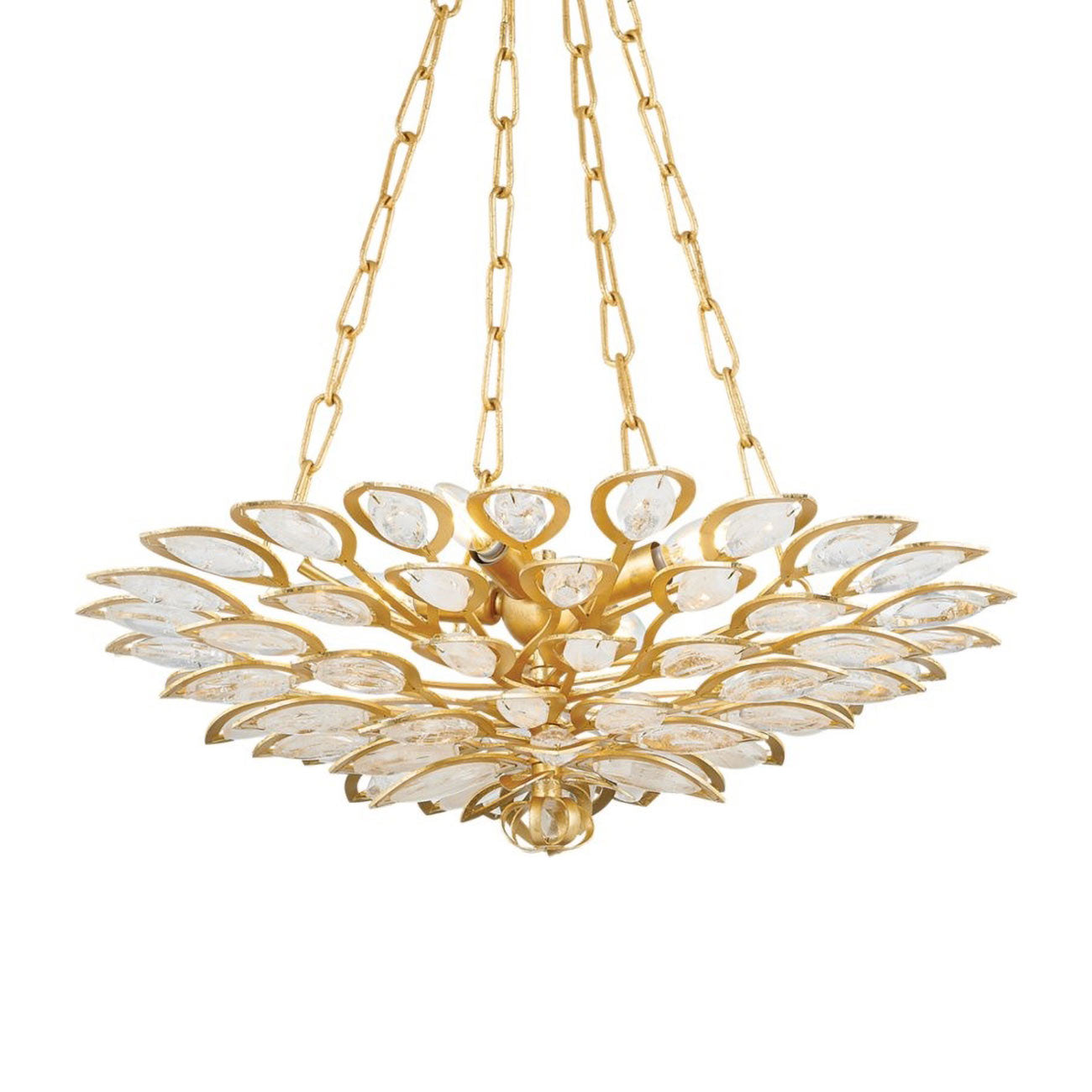 Inspire an ambiance of romance and luxury with the glittering, hand cut Craquelle crystals that highlight the Vittoria Chandelier from Corbett Lighting. Bold gold leaf frames each crystal, creating a layered, fan-like arrangement that evokes the regal feathers of a peacock on the hunt for a mate.