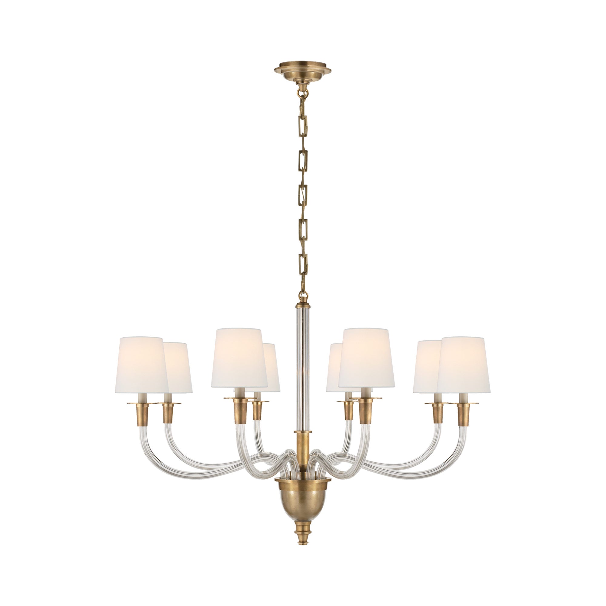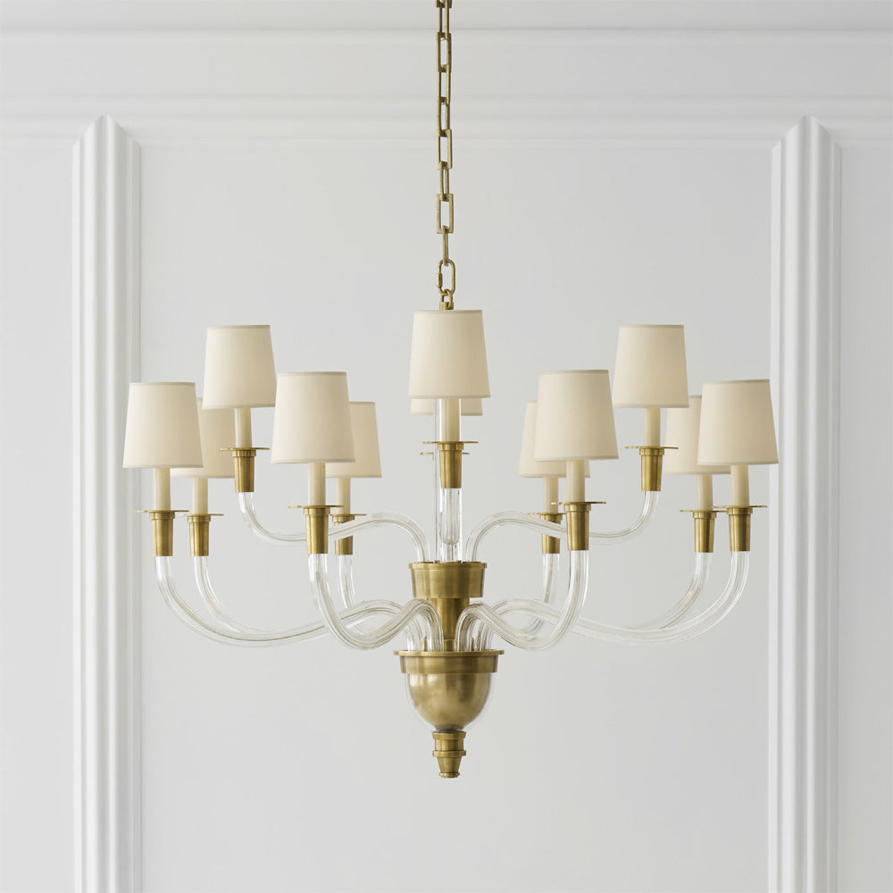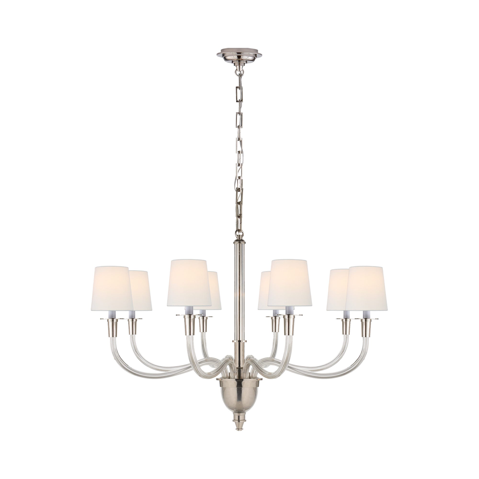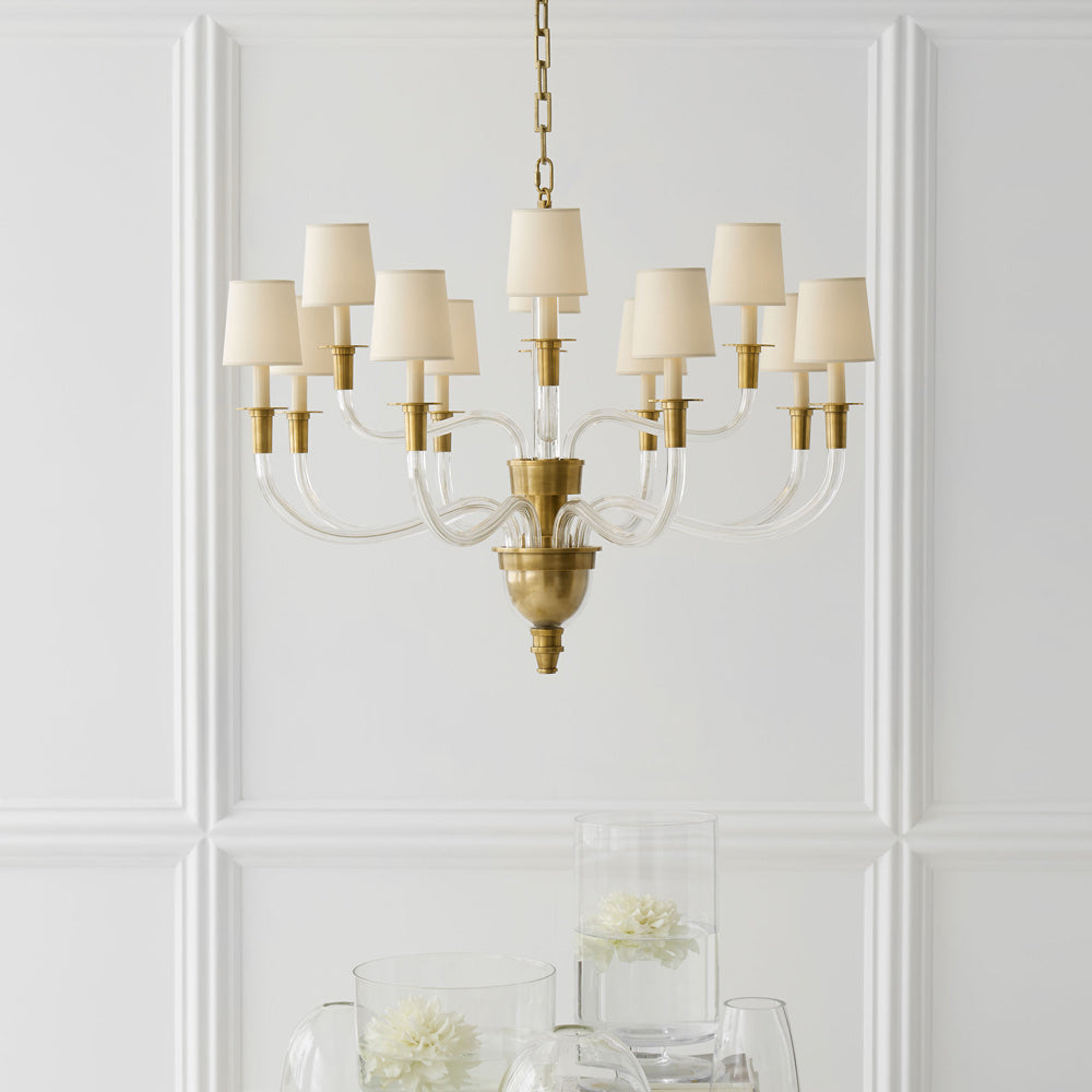 A petite, symmetrical silhouette offers graceful ambiance in a dining or living space as the Vivian Chandelier from Visual Comfort Signature affords a glimpse into updated Euro artistic style. Graceful curves and ornate details turn metal into a canvas for distributing illumination evenly and beautifully. Candelabra bases are topped with diminutive classic shades, adding a sense of romance.