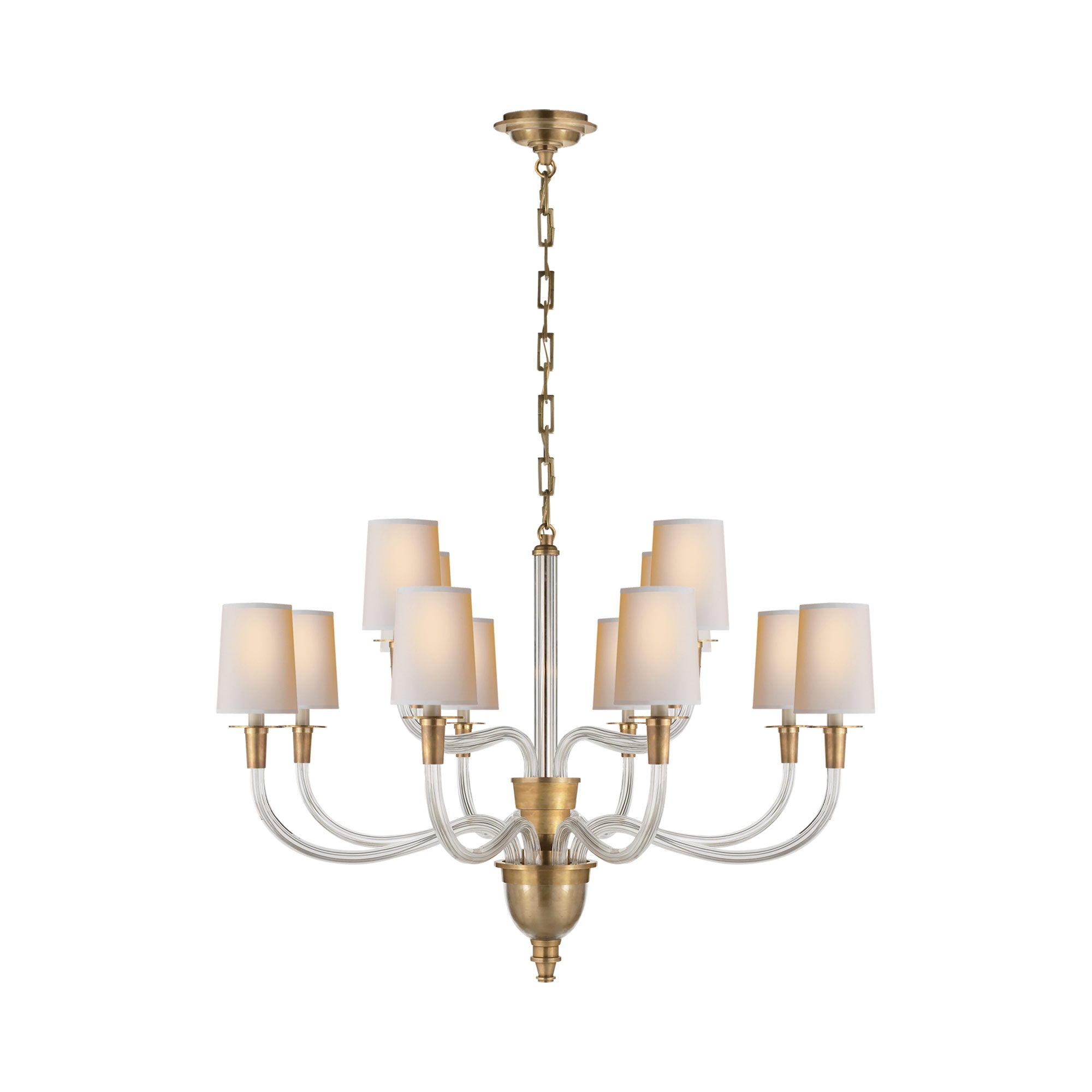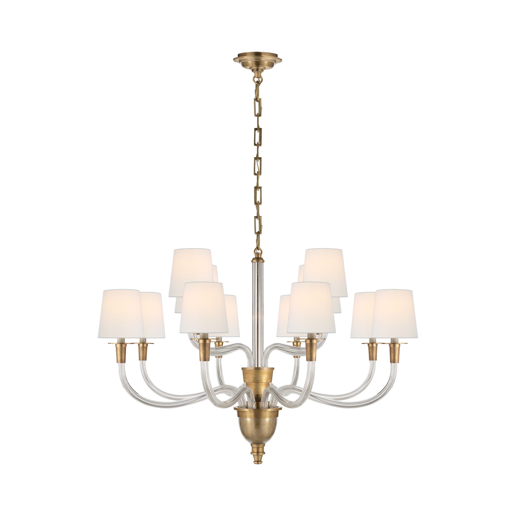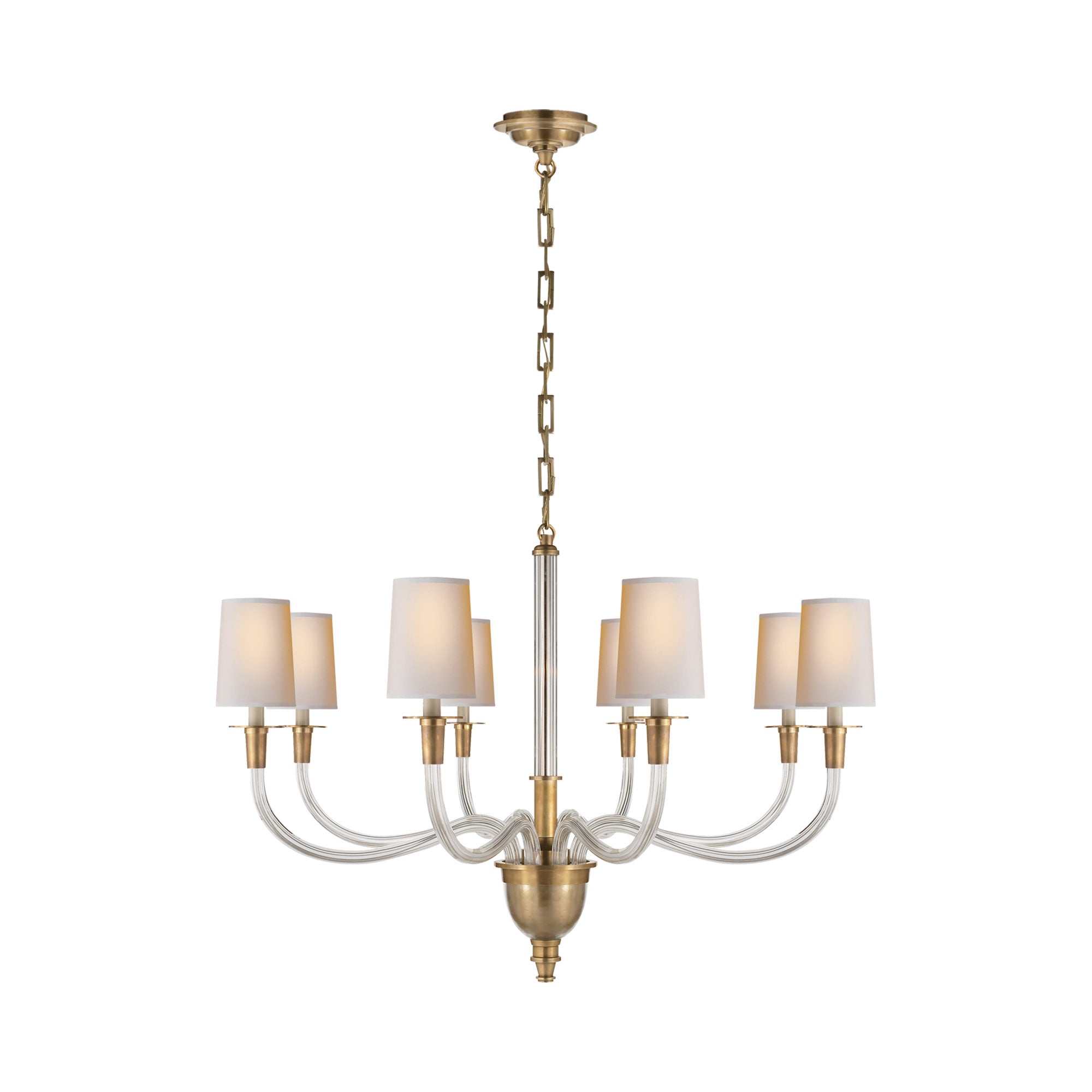 A petite, symmetrical silhouette offers graceful ambiance in a dining or living space as the Vivian Chandelier from Visual Comfort Signature affords a glimpse into updated Euro artistic style. Graceful curves and ornate details turn metal into a canvas for distributing illumination evenly and beautifully. Candelabra bases are topped with diminutive classic shades, adding a sense of romance.