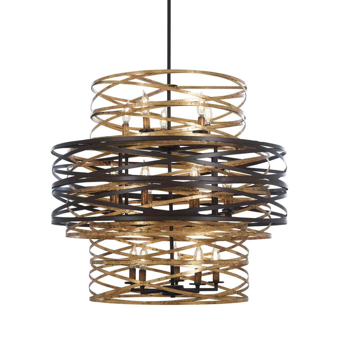Elevate dining rooms into a glam contemporary interior with the mesmerizing Vortic Flow Chandelier from Minka Lavery. Dark bronze and mosaic gold strips weave around one another in an elegant, multidimensional silhouette, defined by tiered edges. A single chandelier tucked within the nest-inspired tiered drum shape outs out a dramatic glow and presents a breathtaking illumination.