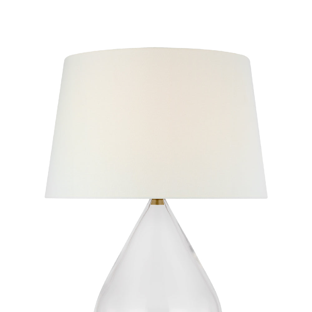 With an elegant teardrop shape and chic hand-rubbed antique brass base, the Vosges Table Lamp from Visual Comfort Signature adds a clean, sparkling look with versatility and yet a customized flavor. Graceful clear glass brings shine to a modern space, magnifying the glow of illumination in a living room, bedroom, or foyer. This glass lamp is crowned with a creamy white linen shade continuing its low-key palette.