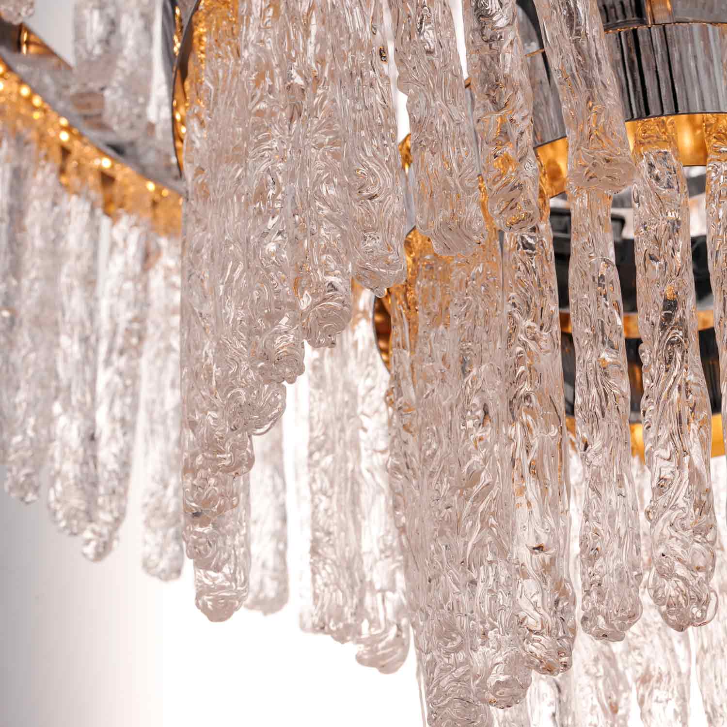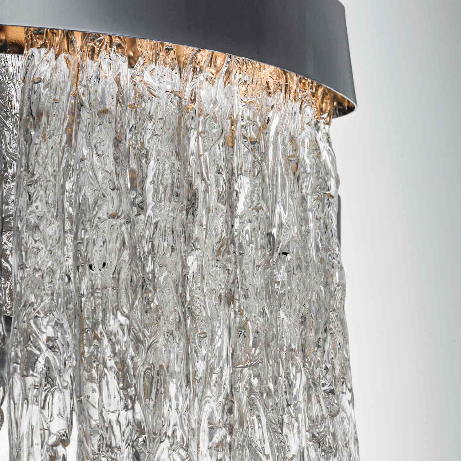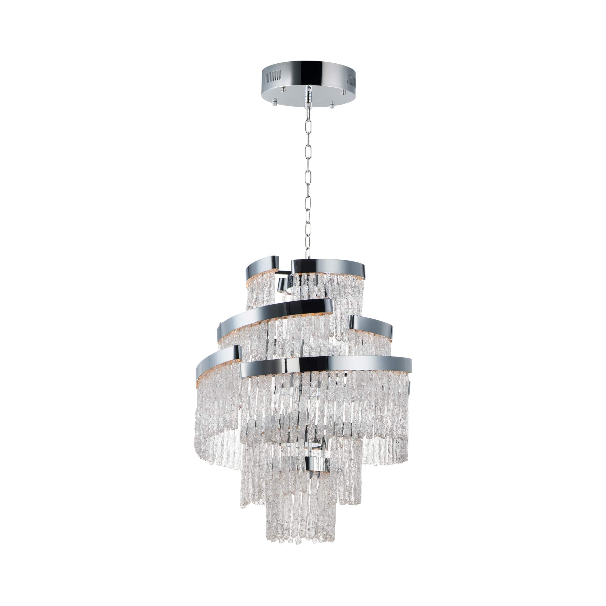 The cascading design of this waterfall-inspired modern glam Waldorf LED Chandelier from Studio M presents a luxurious expression and breathtaking interior addition. Hand crafted Piastra glass crystals lend an artisan quality, sparkling from the polished undulating framework of this energy-efficient tiered chandelier.