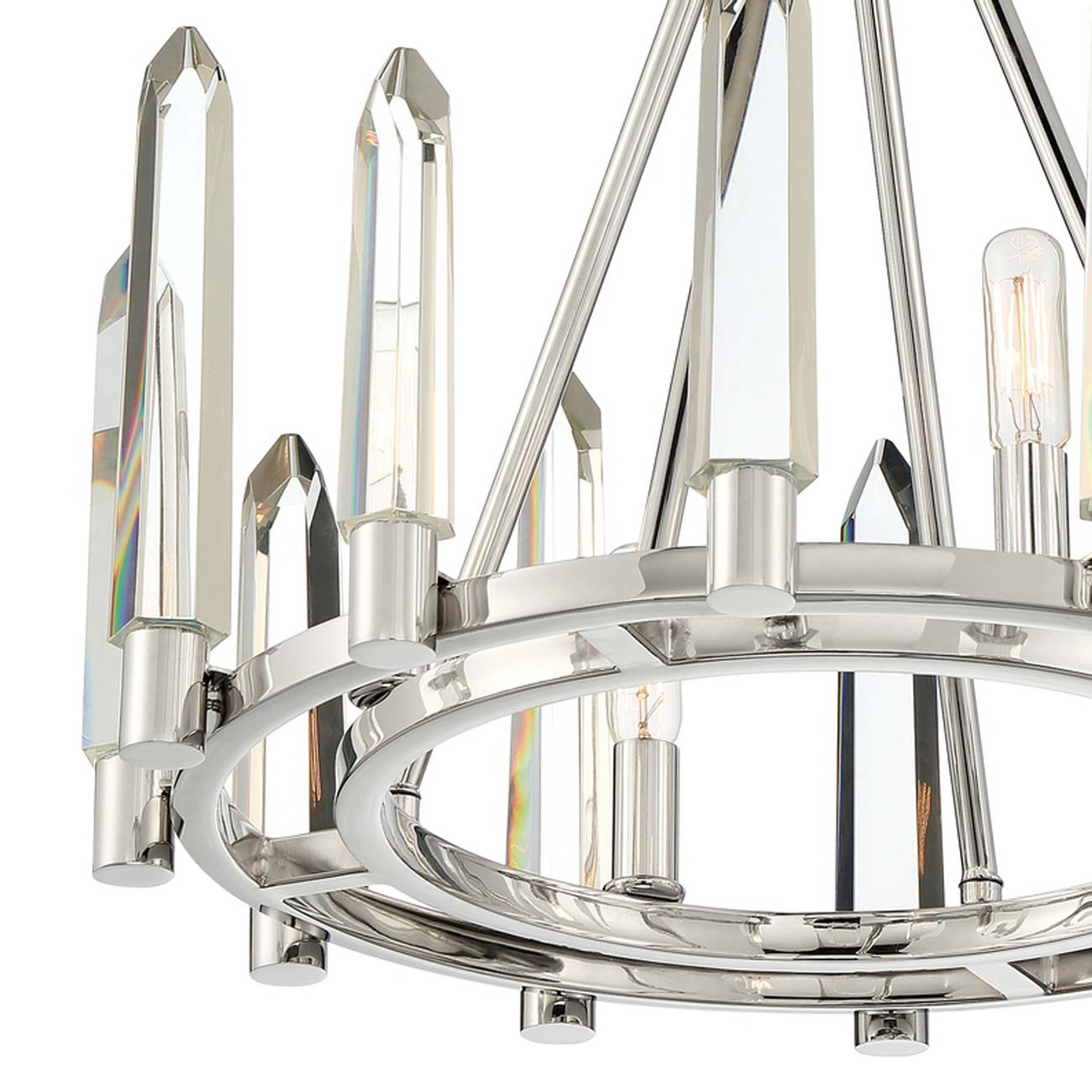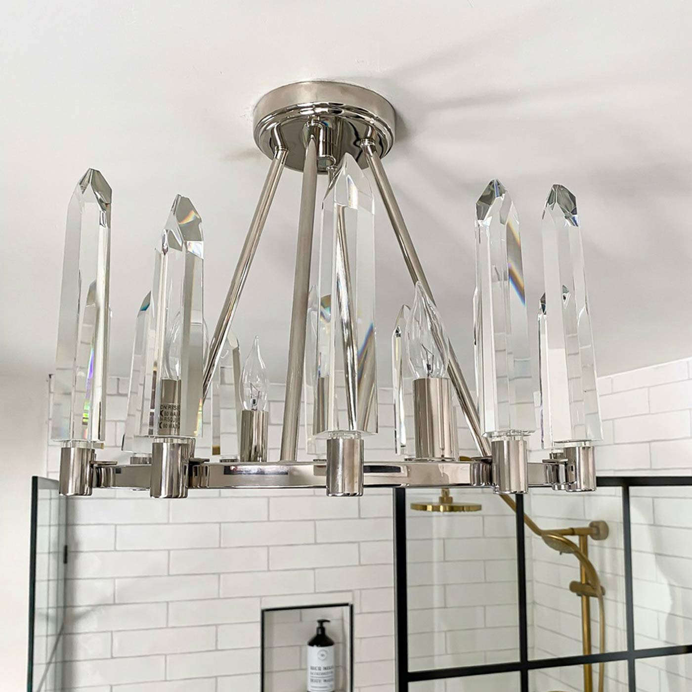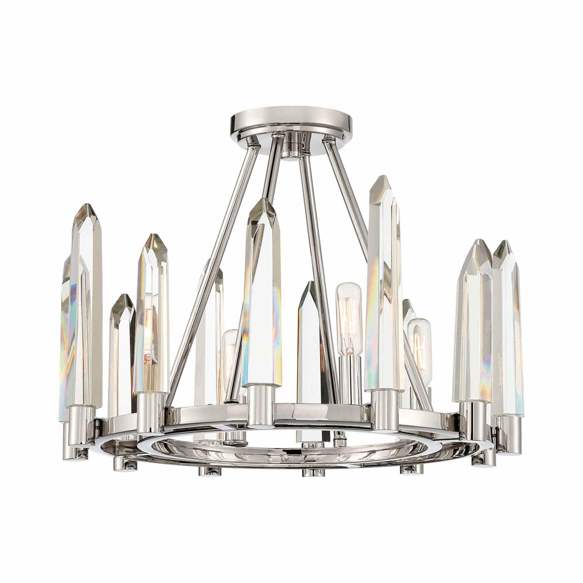 A ring of decadence and irresistible contemporary elegance awaits as the Watson Semi Flush Mount Ceiling Light from Crystorama delivers the sparkling, exquisite appeal you're seeking. Tasteful and somewhat subtle in its decadent look, this circular fixture mounts faceted hand-cut crystal towers onto a polished nickel metal frame, infusing unmatched modern style to lift the ambiance in a dining area or foyer.