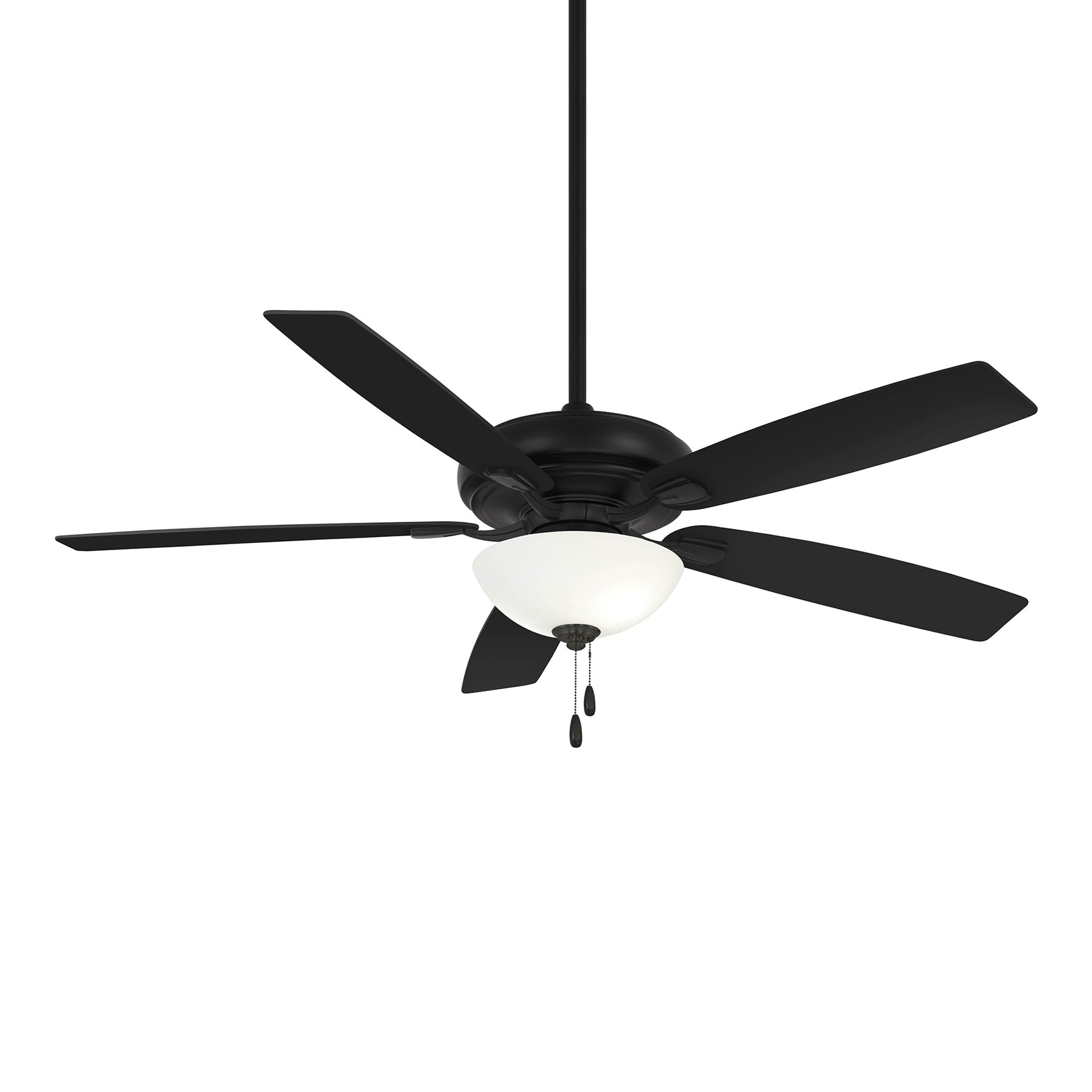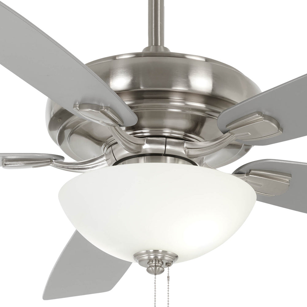 Floor-to-ceiling style reflects careful design elements that compose the Watt II LED Ceiling Fan from Minka Aire. A transitional motif is both simple and artisan, as five oar-shaped blades whirl at three individual speeds controlled by a single pull chain, with manual reverse functionality expanding its usage. This sleek metal and plywood fan is dressed up with a frosted glass shade that filters energy-efficient lighting for a soft glow.