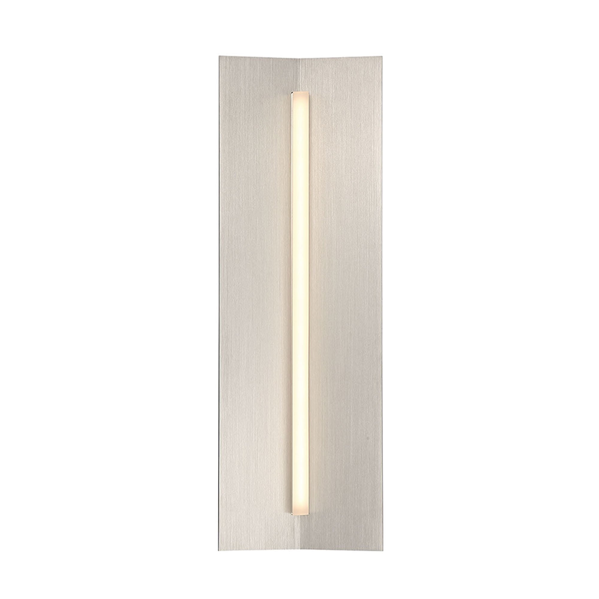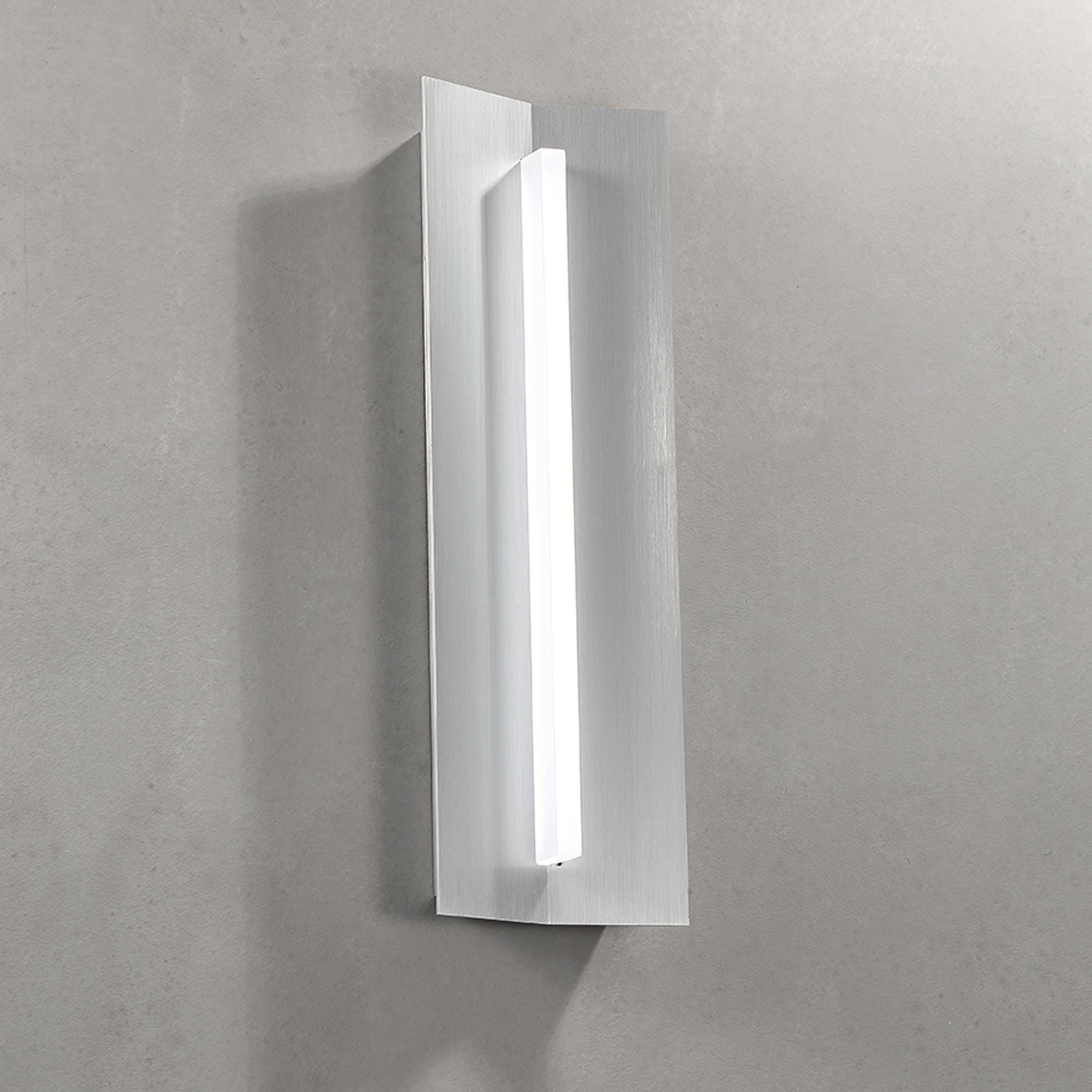 A brushed aluminum finish aluminum frame adapts an angular silhouette to create depth and definition in the Wedge LED Bath Vanity Wall Light from dweLED, with a frosted acrylic diffuser topping off a host of design-forward elegance.
