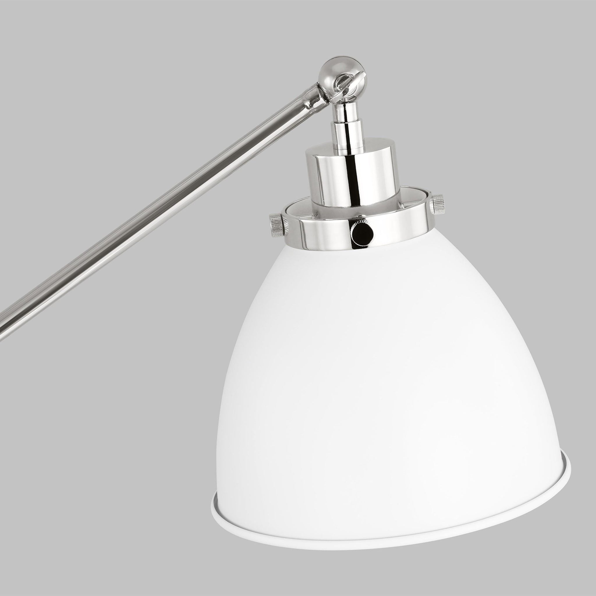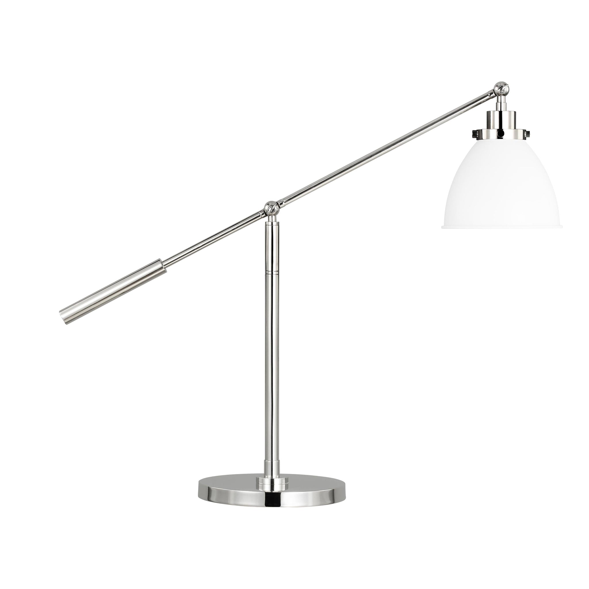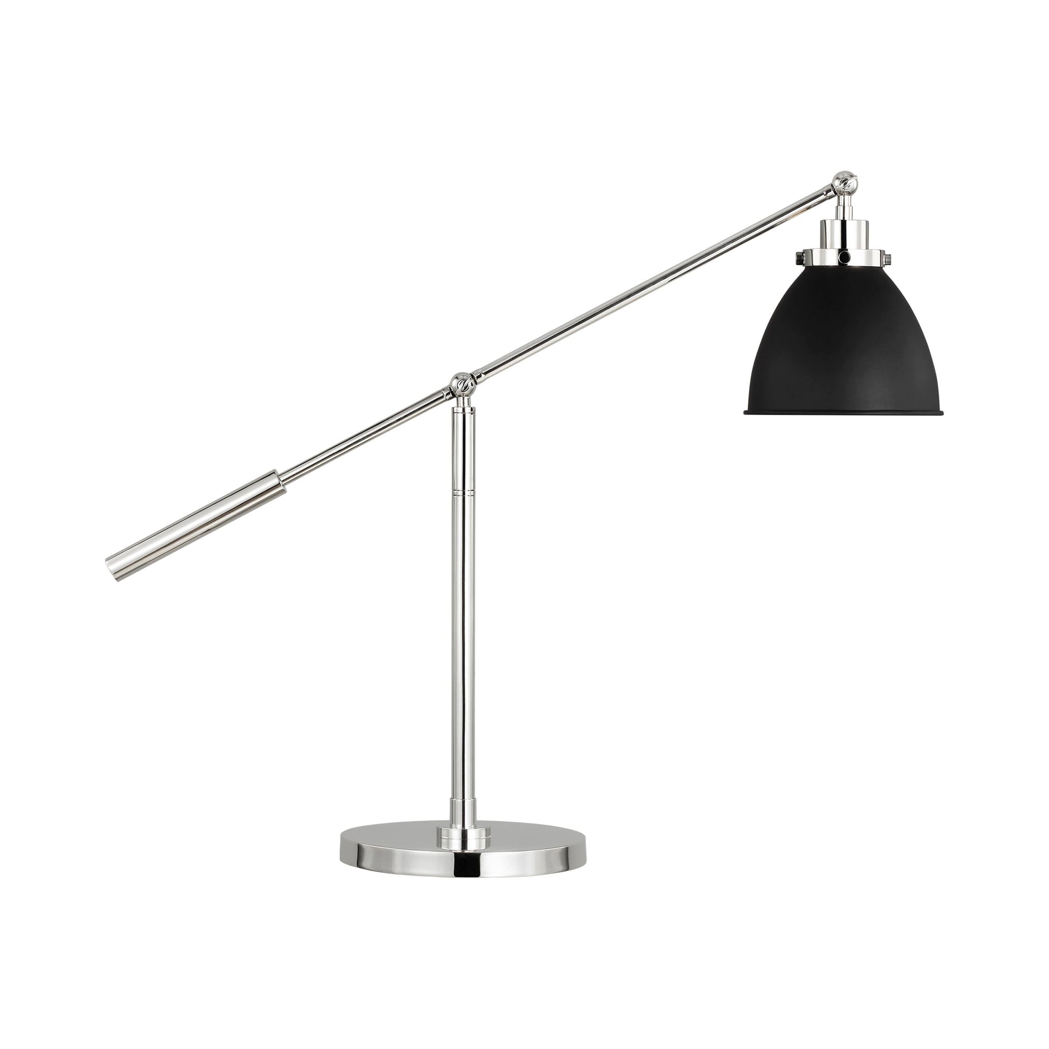 The Wellfleet Dome Desk Lamp by Chapman & Myers is inspired by various classic utility silhouette’s - from factory lighting to barn sconces - capped by contrasting metal hardware. Each shade of the Wellfleet collection is available multiple sizes of 3 versatile profiles; either a flat farm dome, a traditional factory dome, or tapered cone. The shades are available with either a black or white finish and are paired with either a burnished brass or polished nickel collar, chain and canopy.