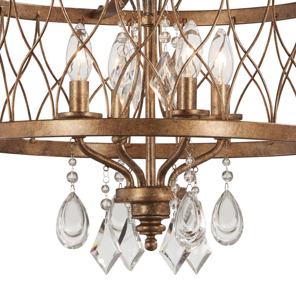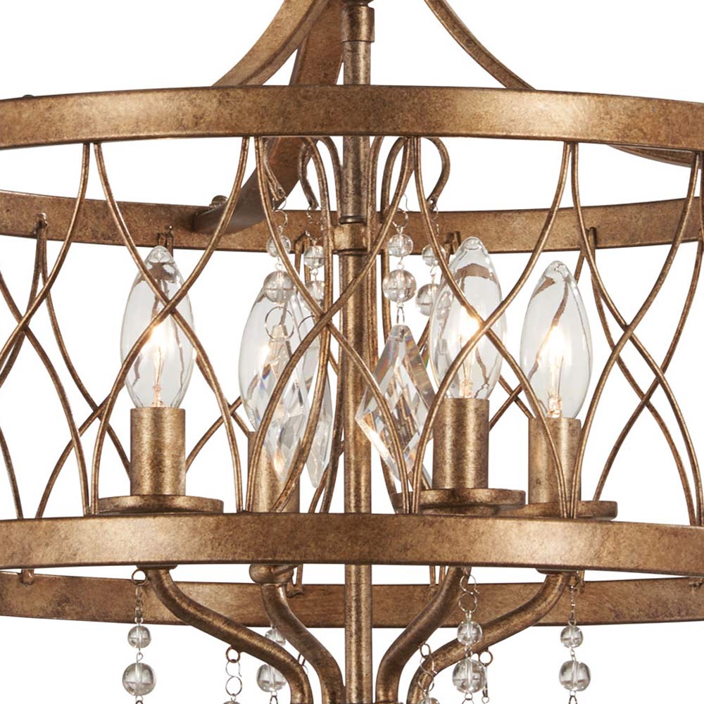 Glam and romance take a front seat to the convenient flexibility in presentation accompanying the West Liberty Convertible Semi Flush Mount Ceiling Light from Minka Lavery. Traditional luxury begins with a cylinder openwork metal shade with a lush gold finish and extends to candelabra-style mounts partially hidden behind a cage-like center. Sparkling faceted glass emblems reflect light to add a new dimension to this gorgeous fixture.