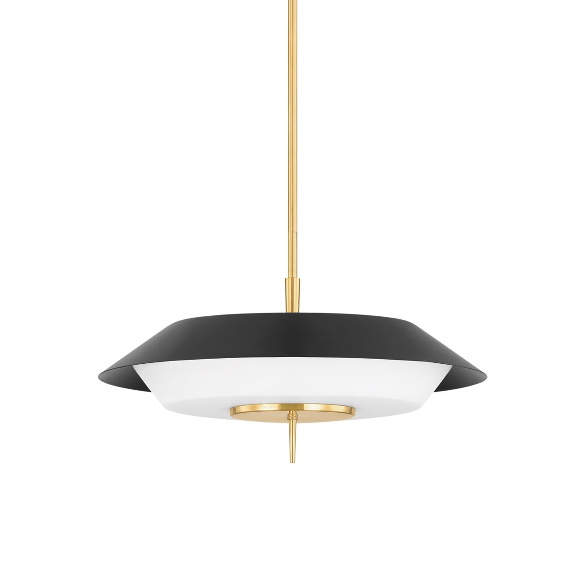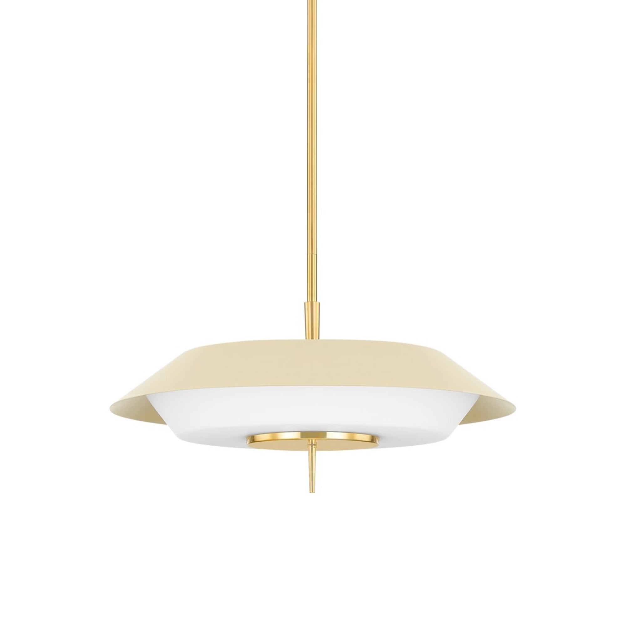 Euro inspiration reaches back to a Mid-Century point as the Westport Pendant Light from Hudson Valley Lighting pulls out all the stops to create a statement. Intriguing shaping joins a splendid materials mix to create a must-have fixture featuring a temptingly shallow shade over an opal glass diffuser. Metal accents and a slender lower stem form a balanced profile and add to a stylish aesthetic perfect for dining and living spaces.