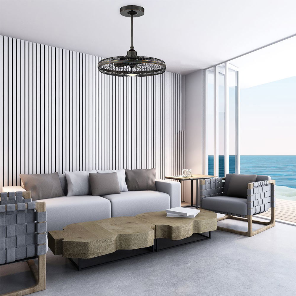 Embrace an industrial motif with clear timeless style in the Wetherby LED Fan D'Lier from Savoy House. Its no-nonsense design emulates authentic early 20th century fare with a slender cage design fashioned of dramatic bronze finish metal. Interior blades deliver breezy air for comfort, as dimmable bulbs emit energy-efficient lighting and a hand-held remote adds total convenience.