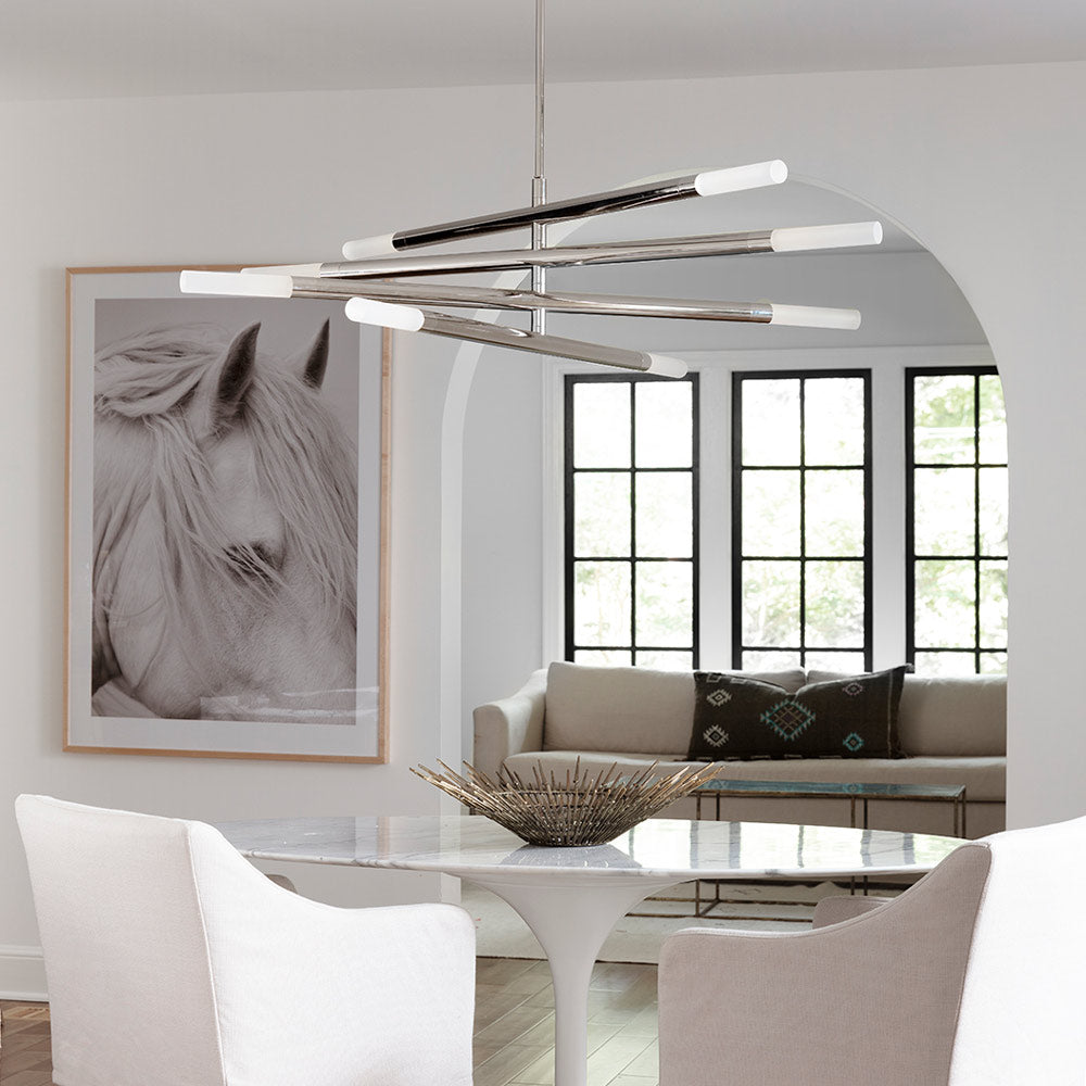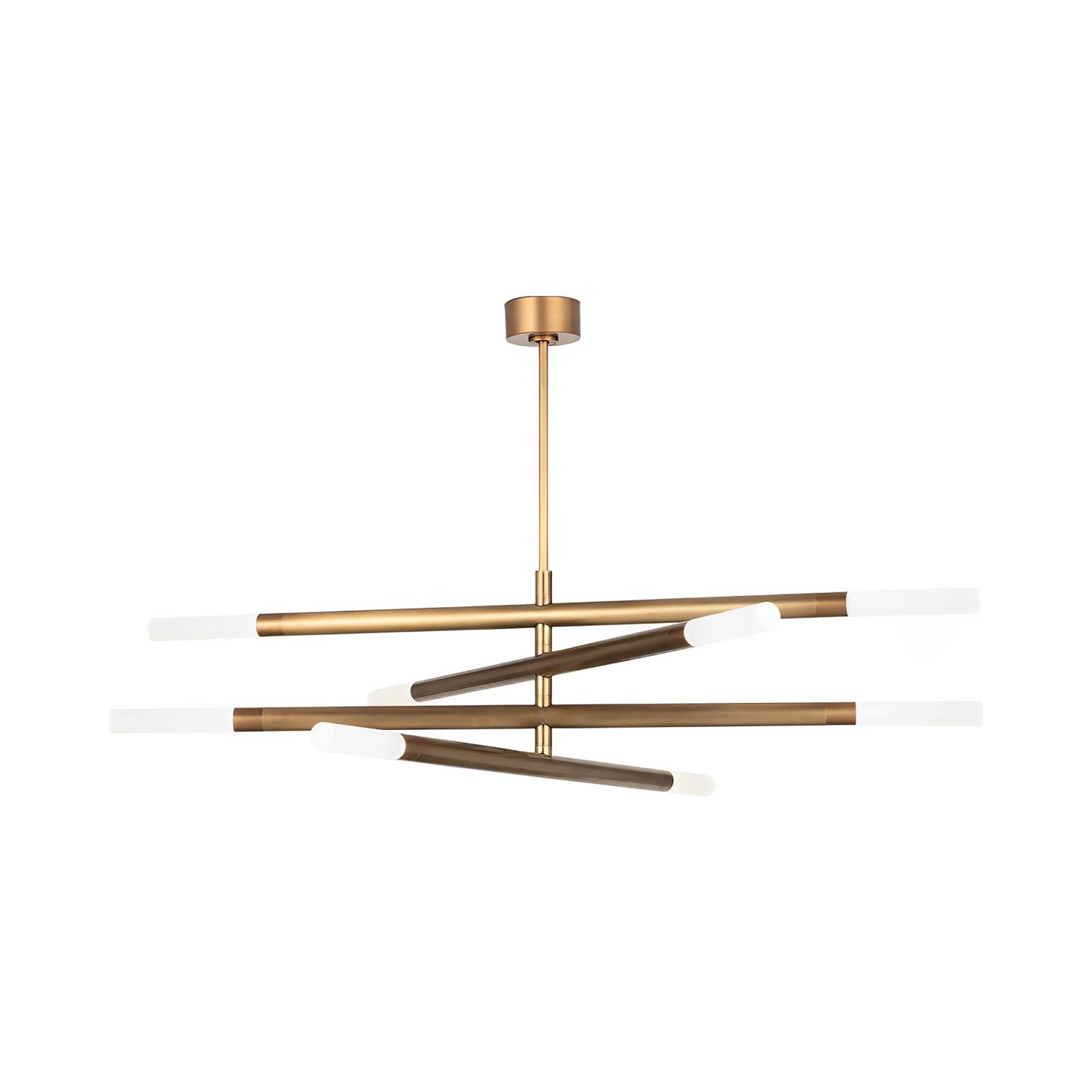 The Wick Chandelier from Regina Andrew places a premium on layering and linear visual design. Baton-like rods fashioned of gorgeous metal stack in a parallel manner, with glowing illumination coming from diffusers at each end. A candle-like style motif harkens back to the surprisingly romantic and traditional element of design in a mostly modern fixture.