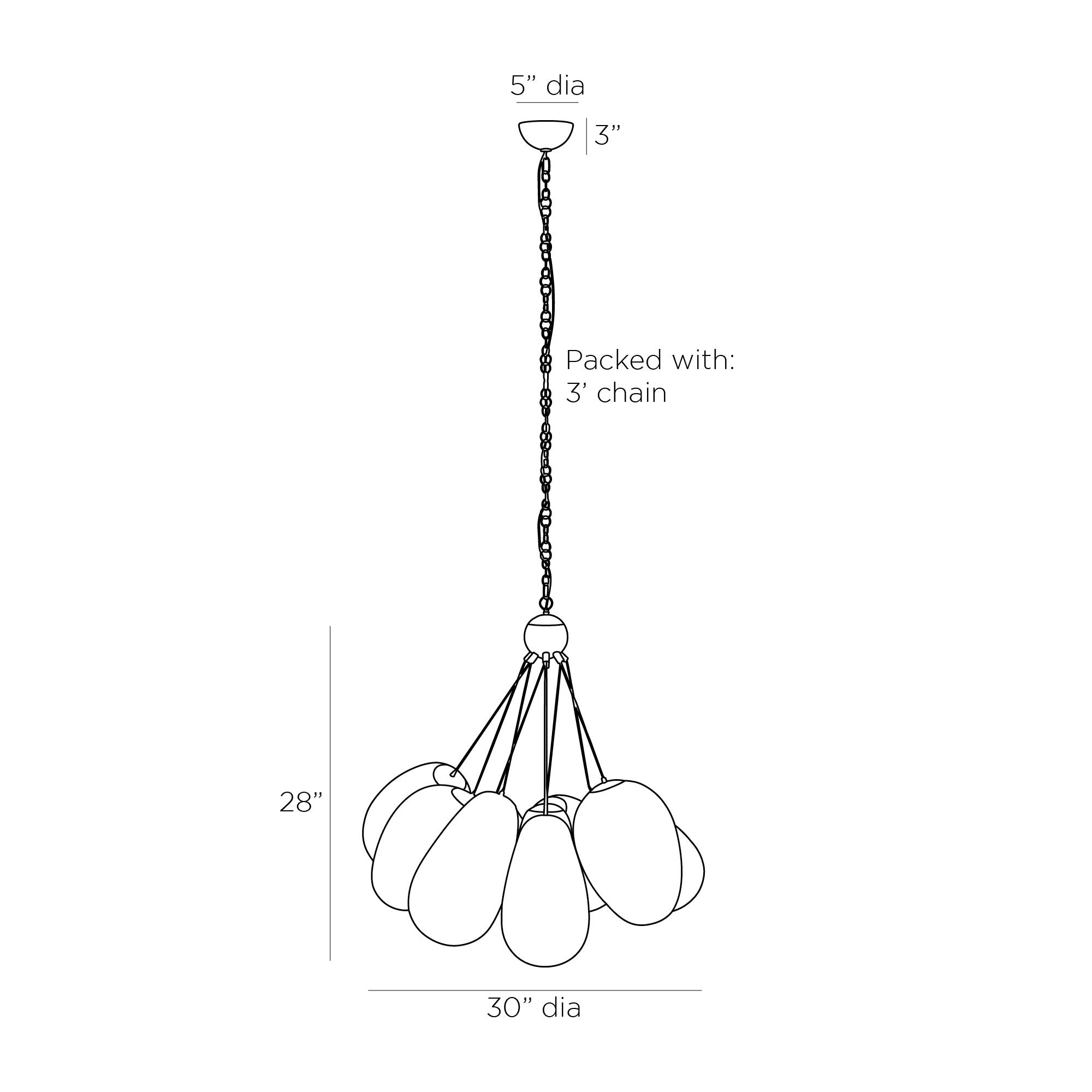 A collection of organic frosted amber seedy glass shapes serves as delicate shades clustered together, forming a somewhat asymmetrical shape in the Wilkes Chandelier from Arteriors. Natural ambiance mimics a look of chic bubbles dangling from slender English bronze finish steel arms as an artful sphere creates festive attitude. Chain link suspension repurposes an industrial look endemic in this mixed-motif fixture.