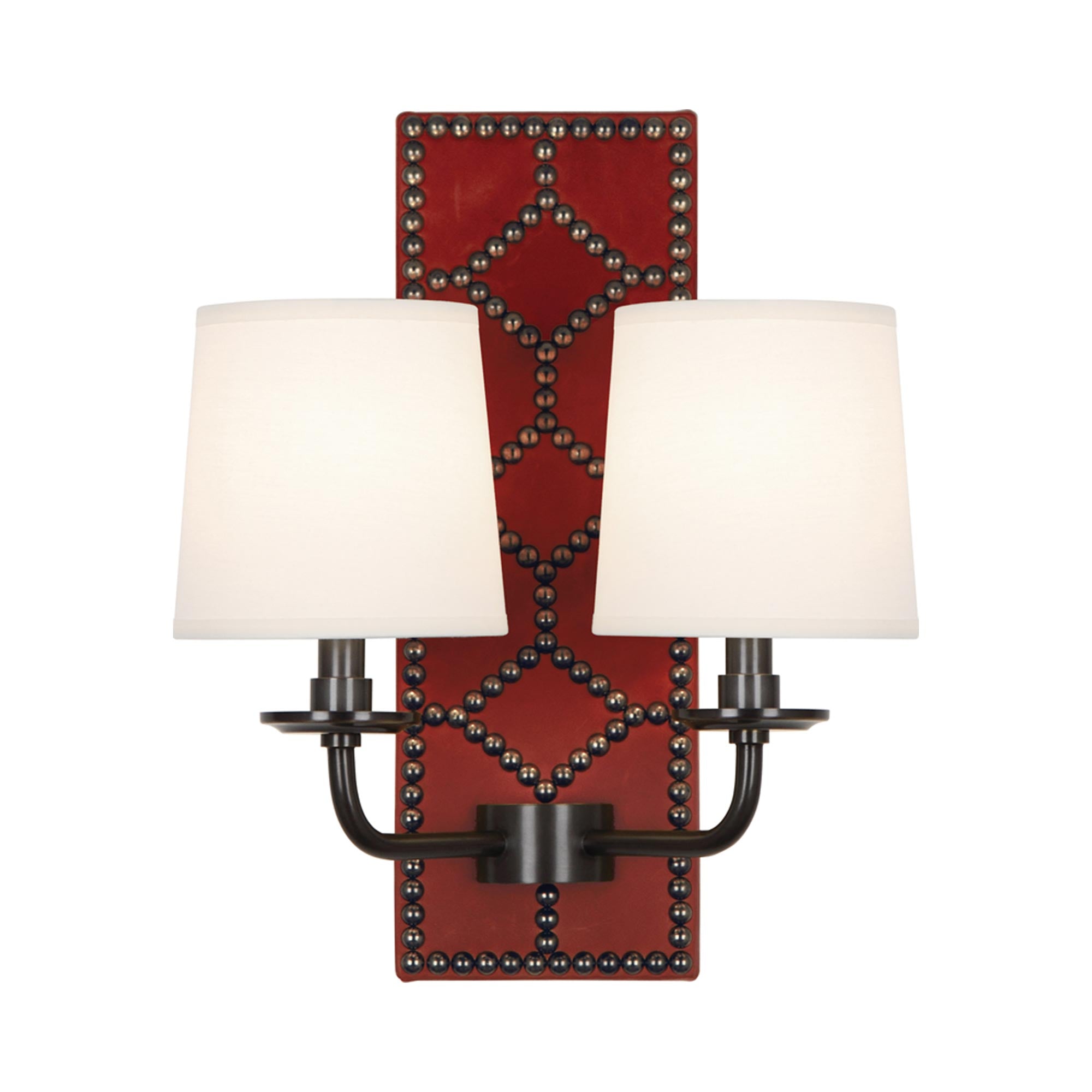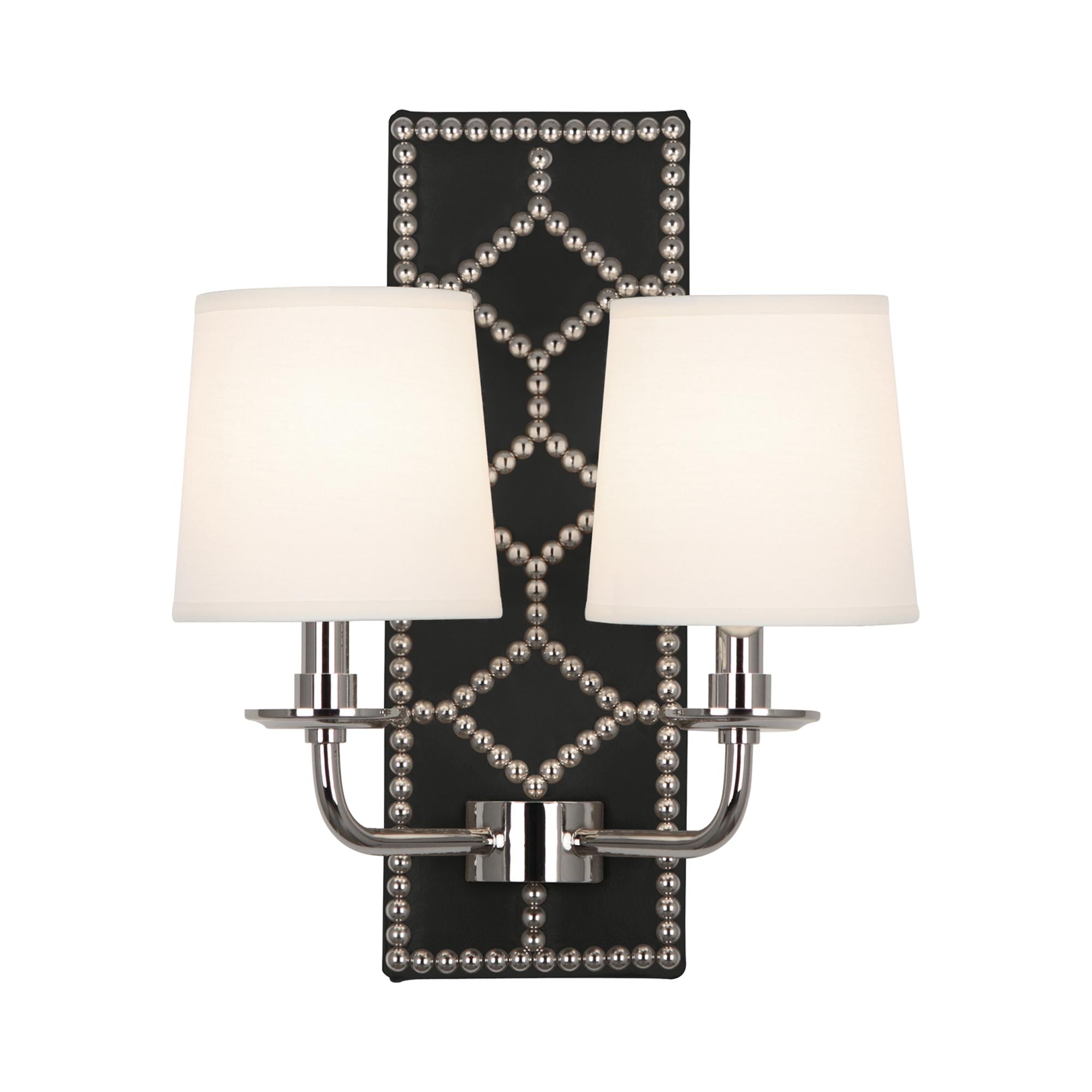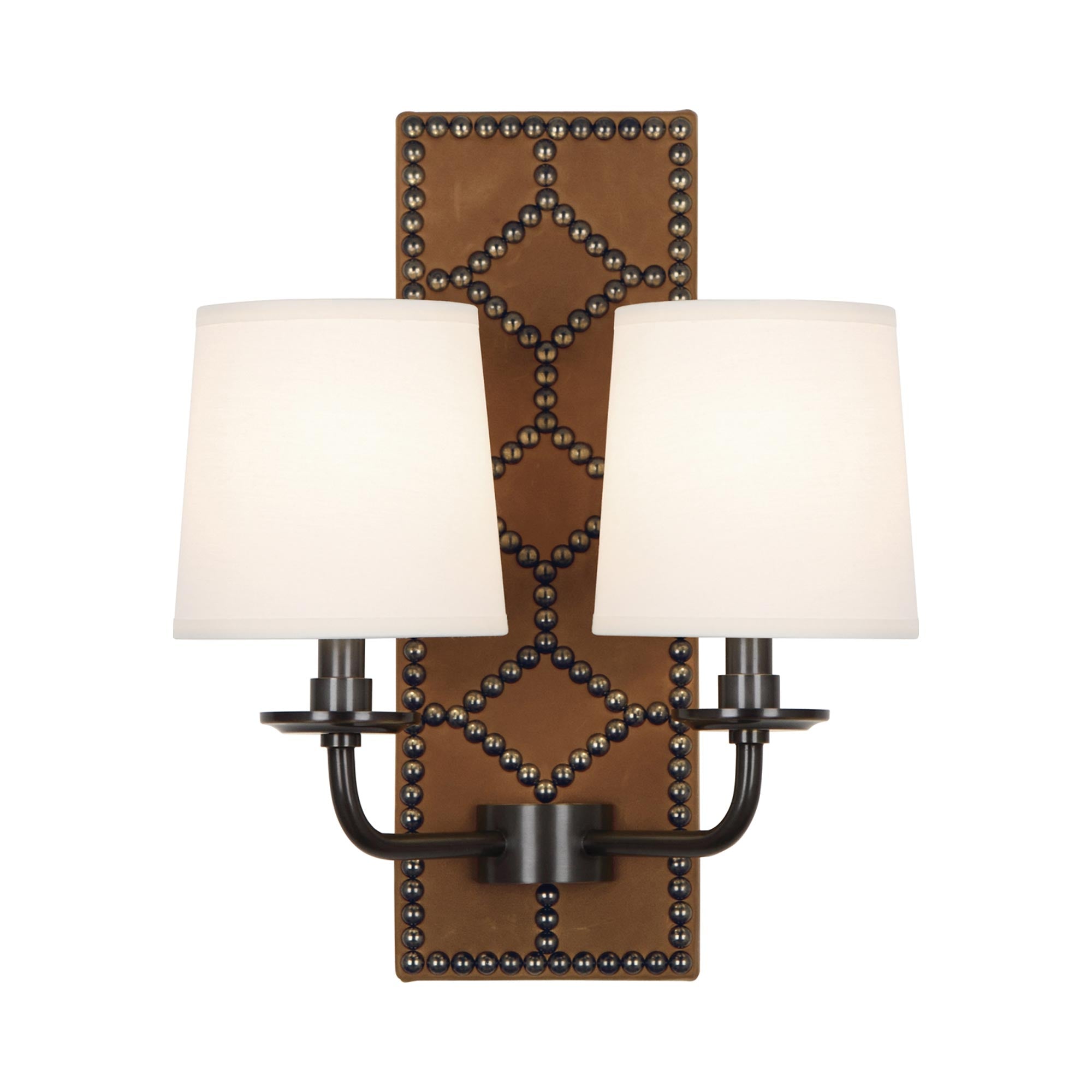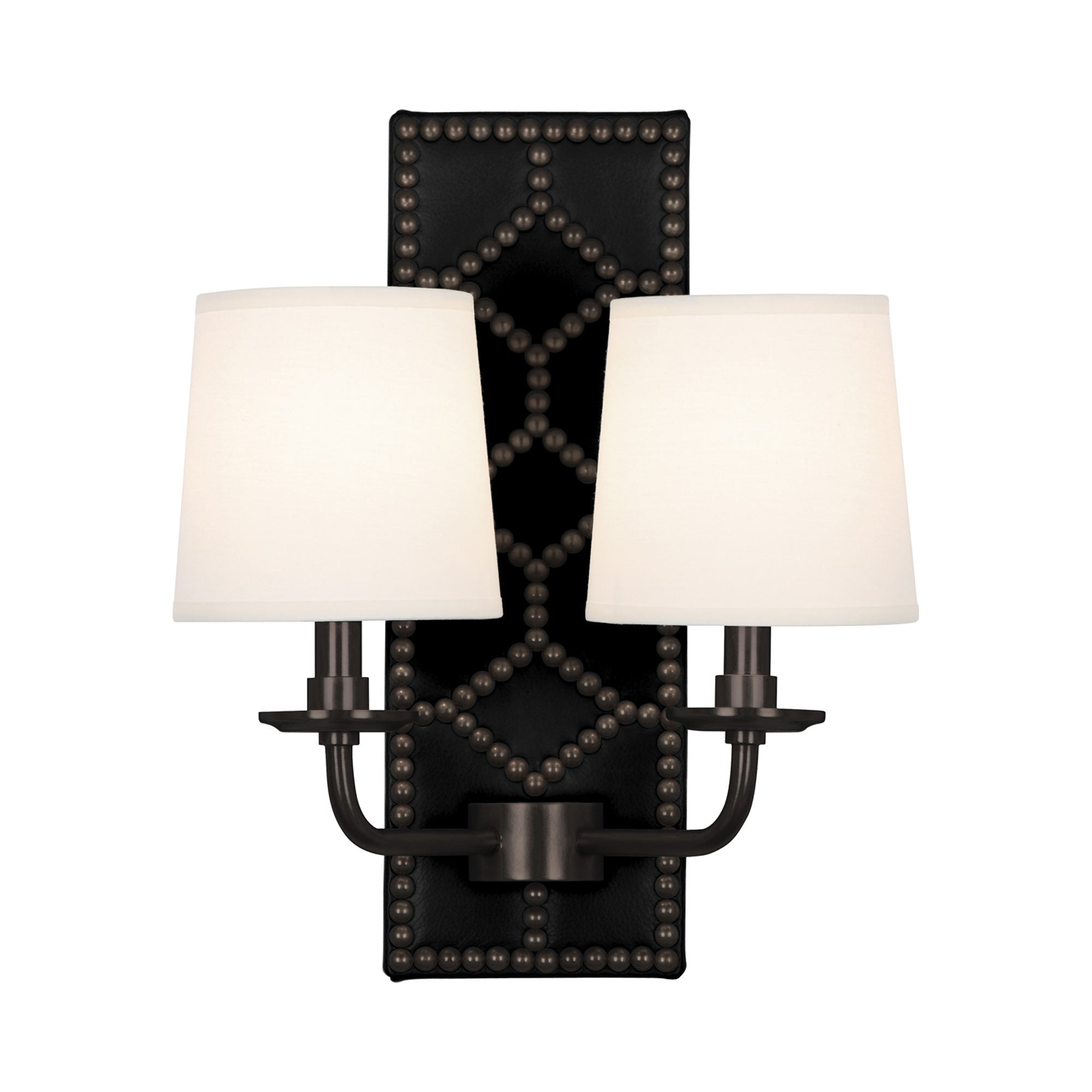 Theatrical ambiance heightens anticipation when the Williamsburg Lightfoot Wall Light from Robert Abbey offers ambient or accent lighting in a themed space. Its exquisite design pairs side-by-side conventional lamp lighting with the bold elegance of blacksmith black leather and nailhead detail joining captivating metal accents. Glam borrows from old world taste to contribute an enticing aesthetic ideal for a custom space.