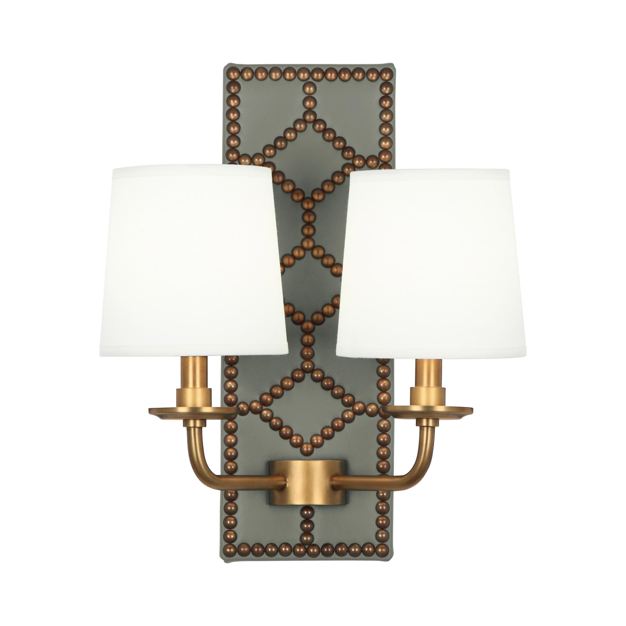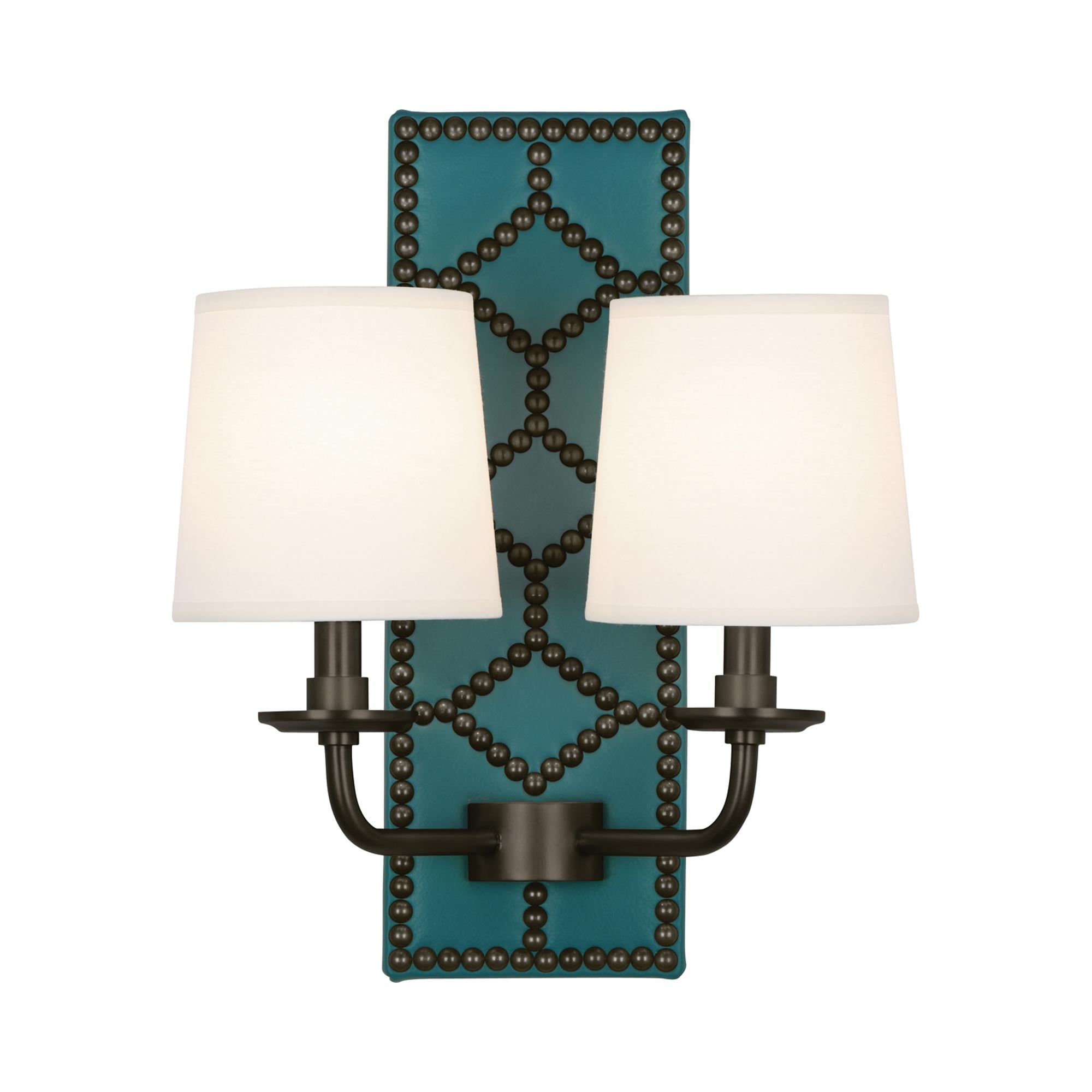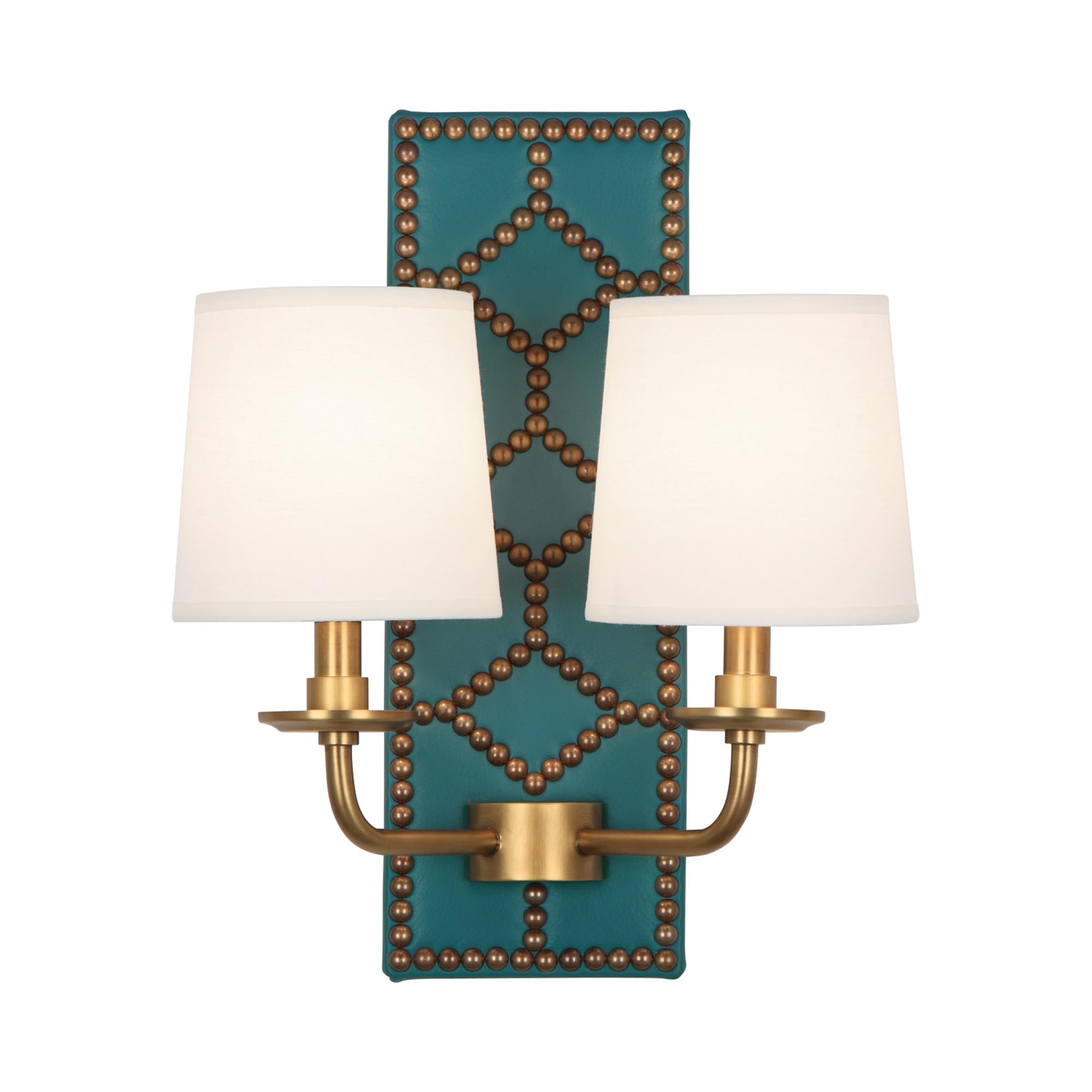 Theatrical ambiance heightens anticipation when the Williamsburg Lightfoot Wall Light from Robert Abbey offers ambient or accent lighting in a themed space. Its exquisite design pairs side-by-side conventional lamp lighting with the bold elegance of blacksmith black leather and nailhead detail joining captivating metal accents. Glam borrows from old world taste to contribute an enticing aesthetic ideal for a custom space.