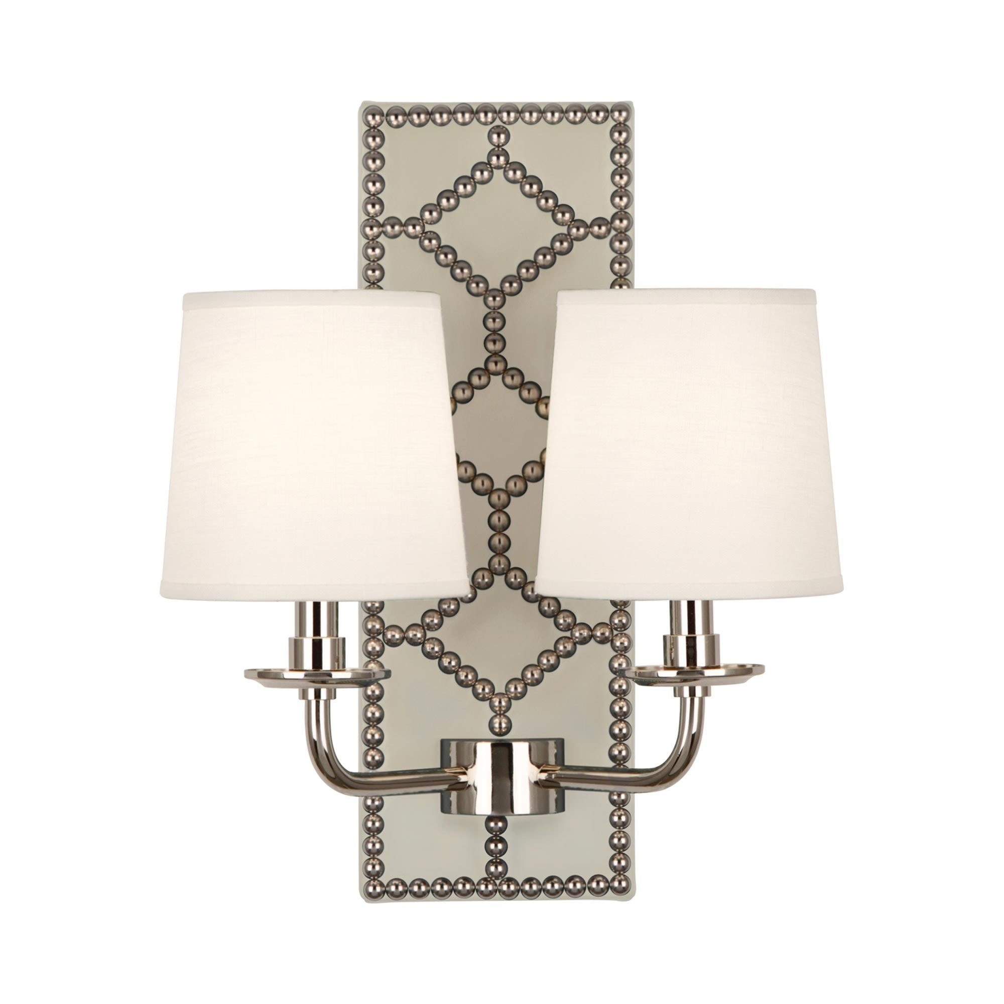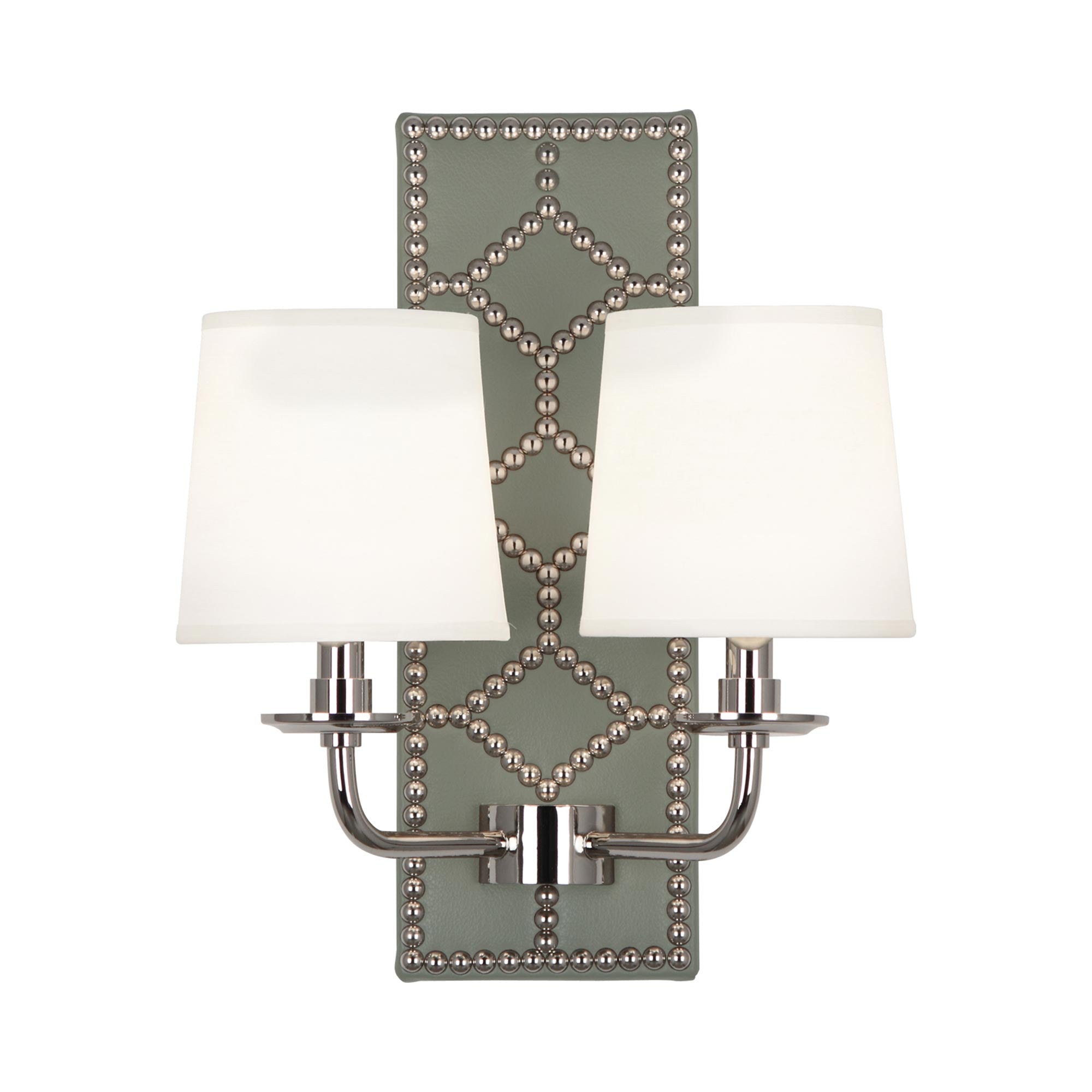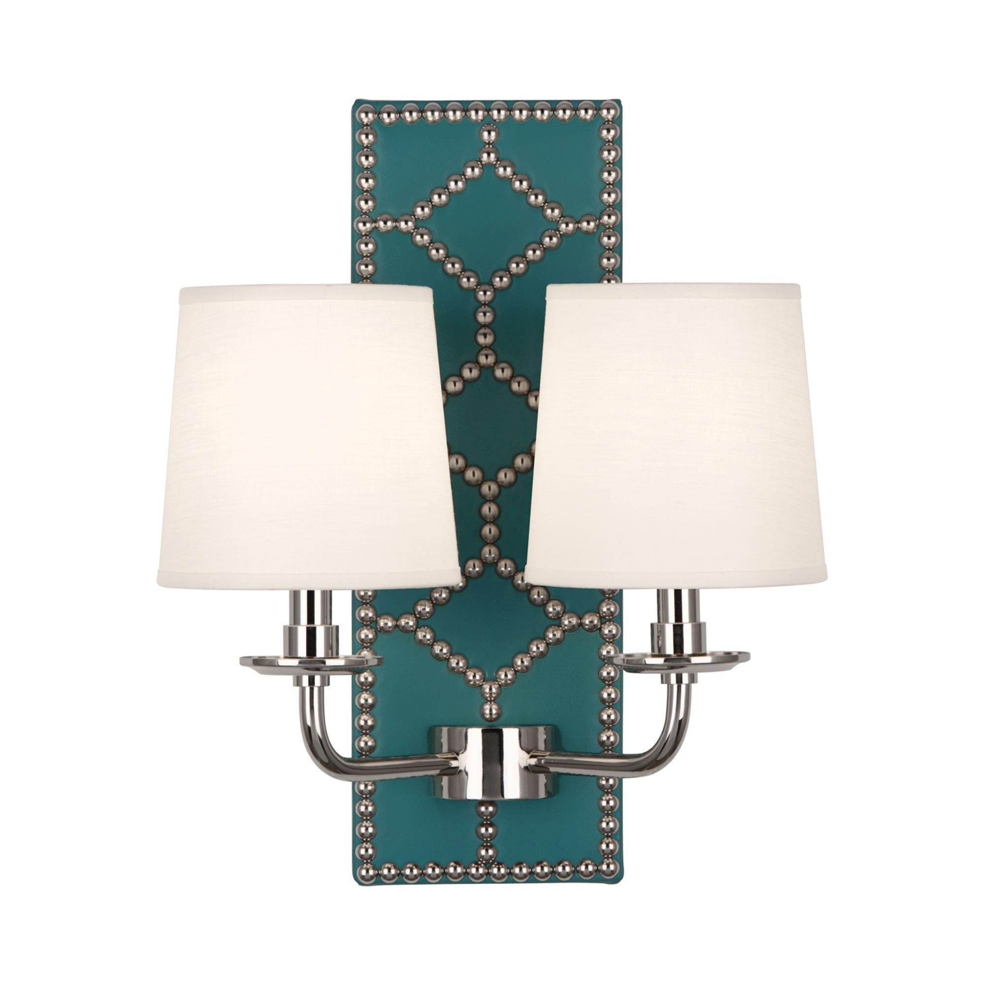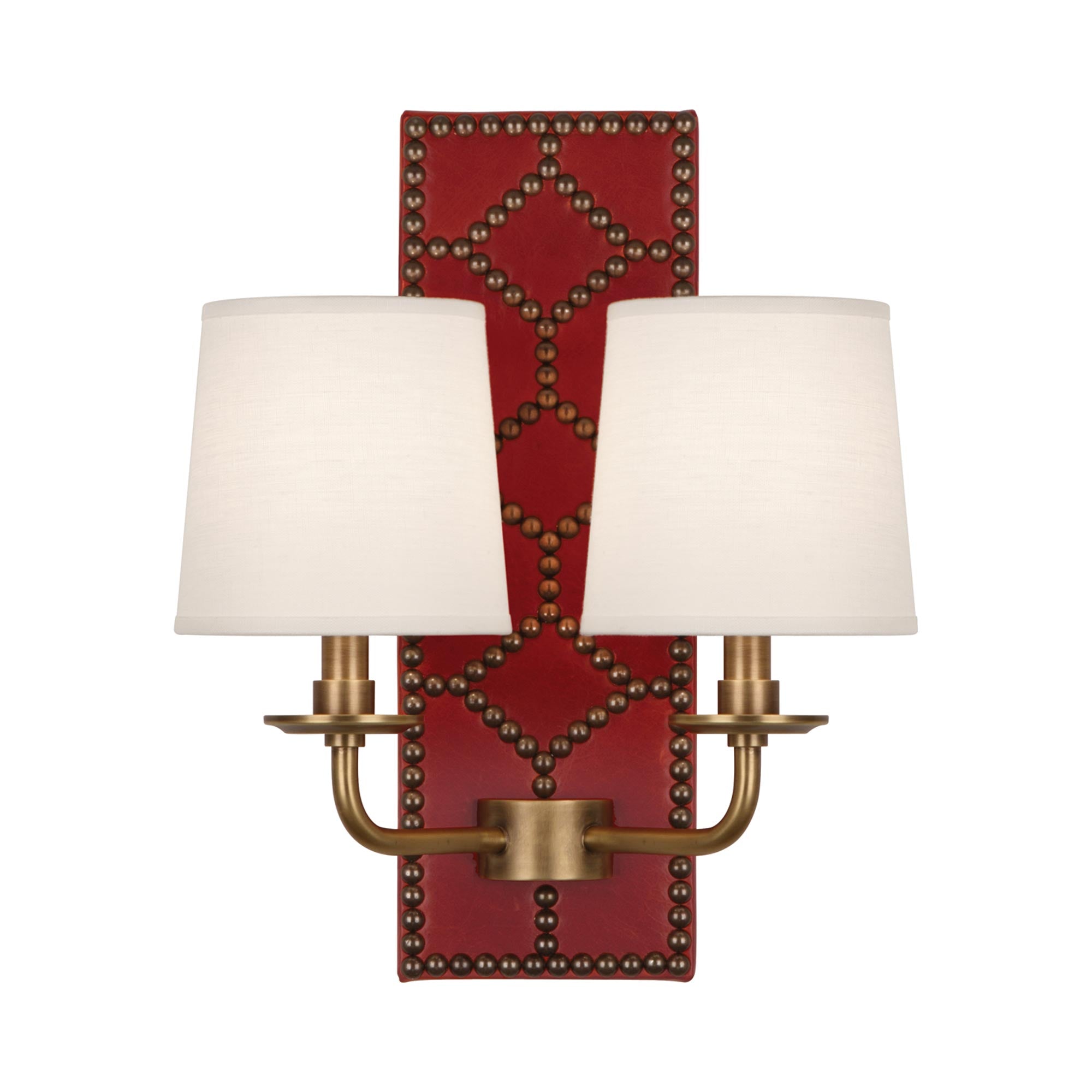 Theatrical ambiance heightens anticipation when the Williamsburg Lightfoot Wall Light from Robert Abbey offers ambient or accent lighting in a themed space. Its exquisite design pairs side-by-side conventional lamp lighting with the bold elegance of blacksmith black leather and nailhead detail joining captivating metal accents. Glam borrows from old world taste to contribute an enticing aesthetic ideal for a custom space.