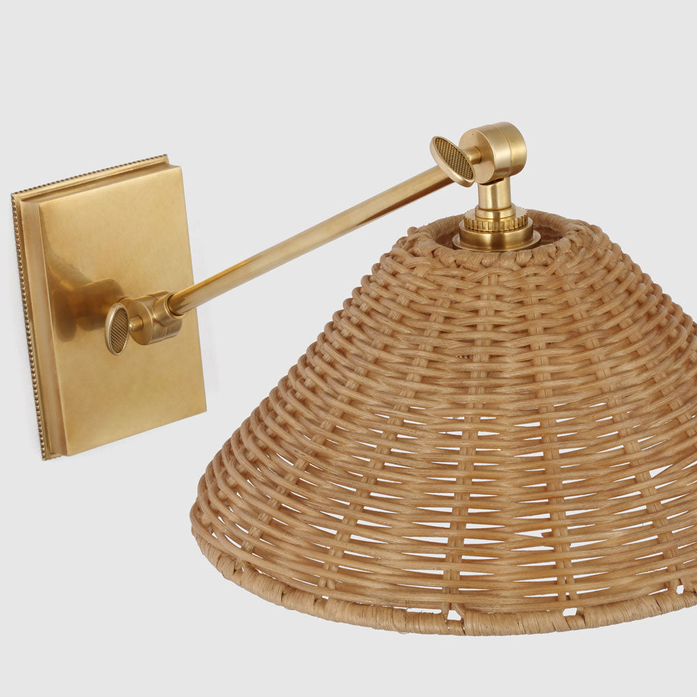 An adjustable arm adds easy functionality to the engaging style of the Wimberley Wall Light from Visual Comfort Signature. A woven wicker shade delivers casual energy while an elegant polished metallic finish gleams in stark contrast. The contrast is compelling and bold, offering exceptional character to your den or living room.