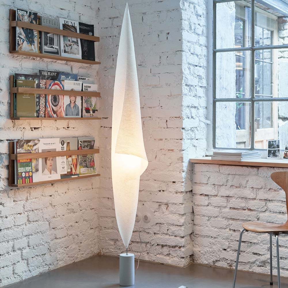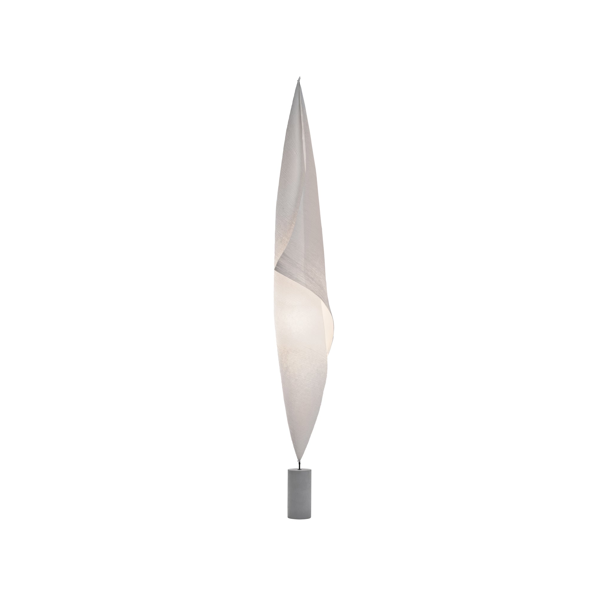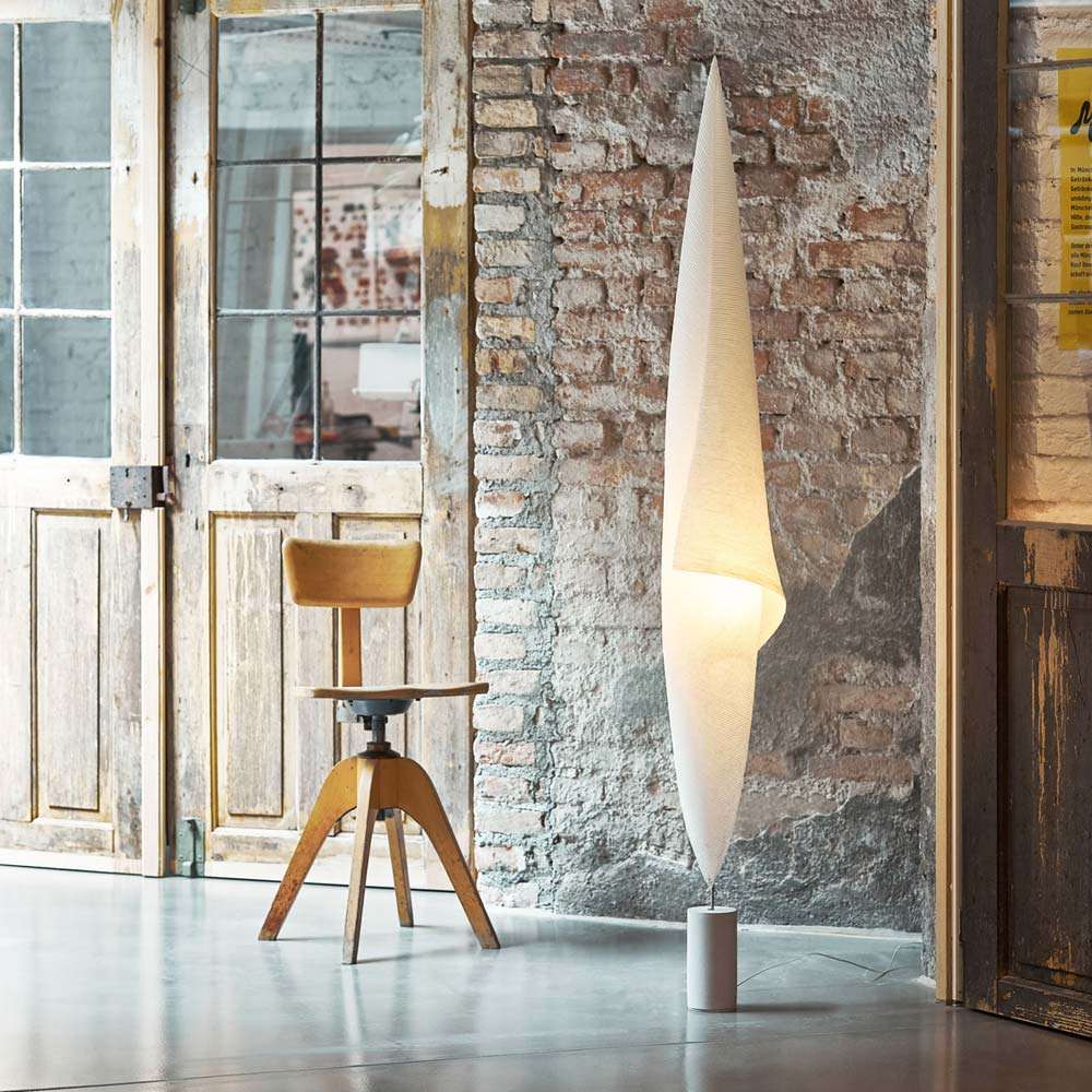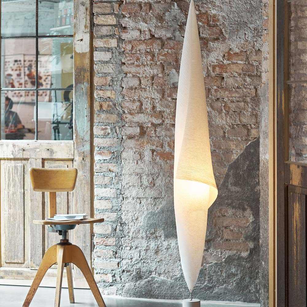Tempting with an eye toward delicacy, the Wo-Tum-Bu 1 Floor Lamp from Ingo Maurer delivers primo gallery style with an organic vibe. Japanese-produced paper offers texture and lightness as it wraps elegantly in an elliptical form, creating variable lighting strengths. Connecting to a concrete cylinder foot, the reach of raw materials is complete and impactful.