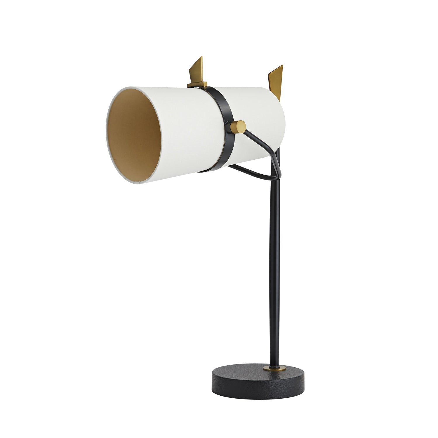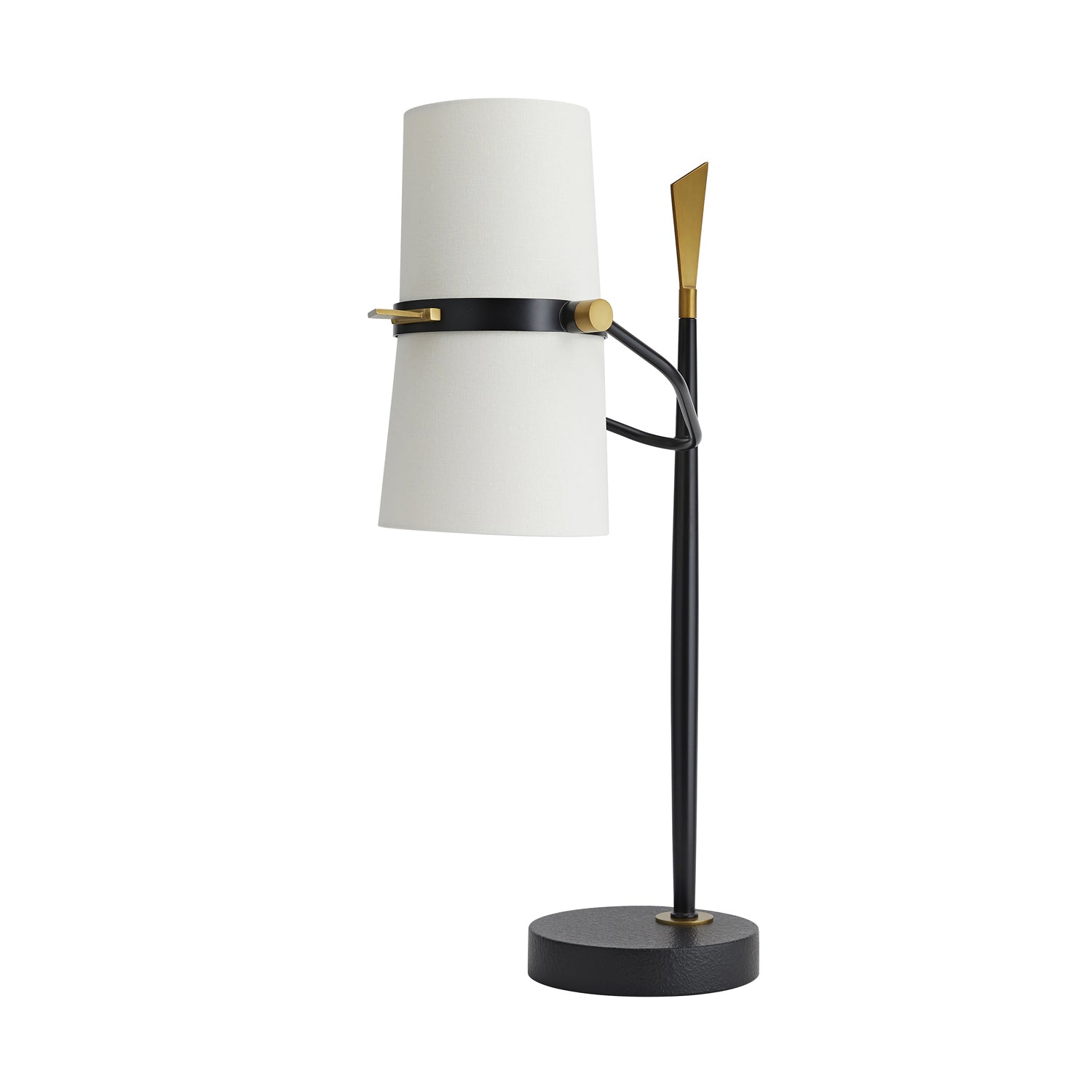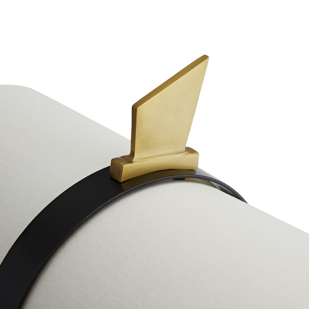 The Yasmin Table Lamp from Arteriors emulates a rustic version of studio fare, mixing motifs to perfection. Careful detailing features a tapered black iron rod with a gleaming vintage brass finish finial adding a romantic shape. Attached with a strap and cable, its long cylinder double shade is this lamp’s standout feature, as it sends ambient lighting with the mood-enhancing power of dimming.