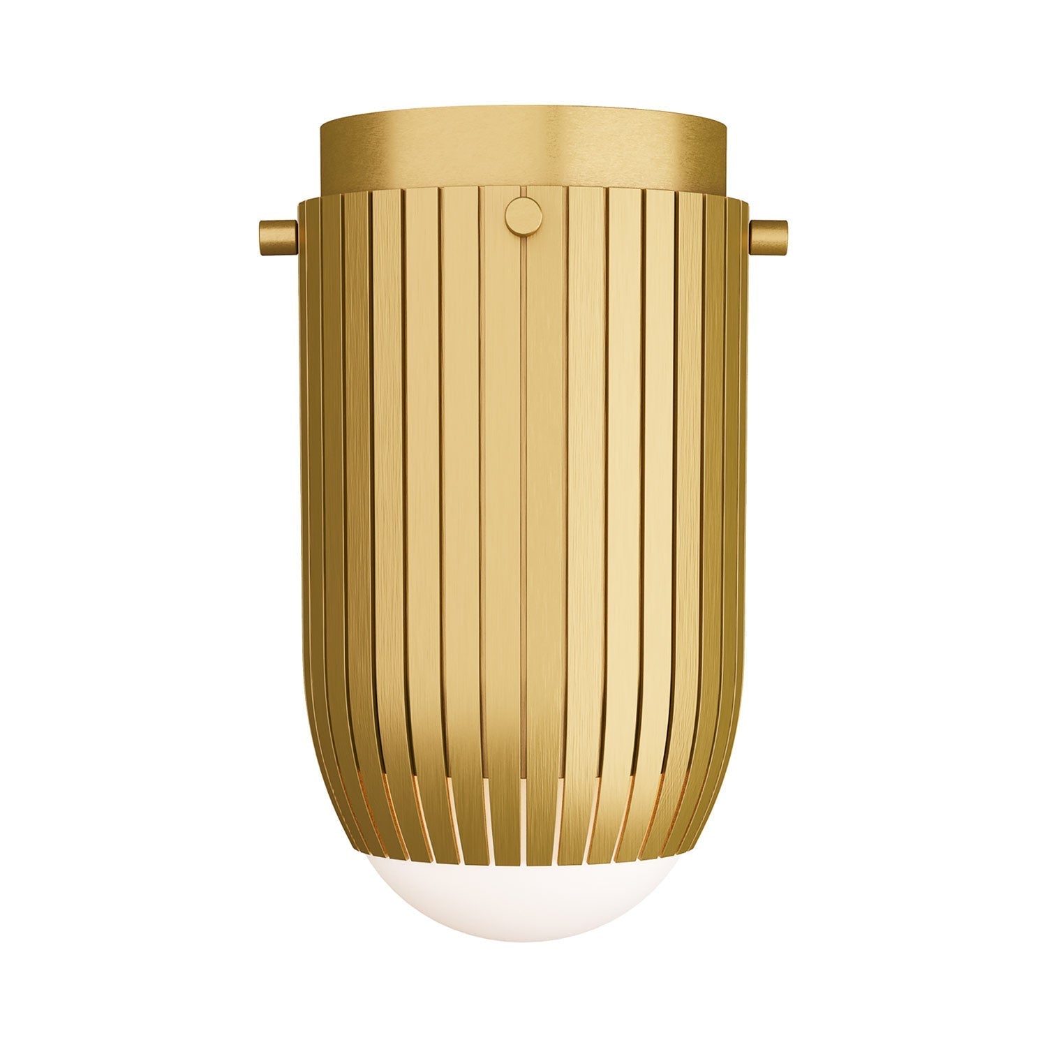 A striking example of drama in design, the York Flush Mount Ceiling Light from Arteriors embodies the power of accent elements with functional utility. Chic industrial flavor is also quite delicate as it slices slender ribs of antique brass finish steel and shapes them into a capsule silhouette. Subtle accents and a curved opal glass diffuser wrap up a host of individual pieces merging to form a sophisticated and elegant fixture.