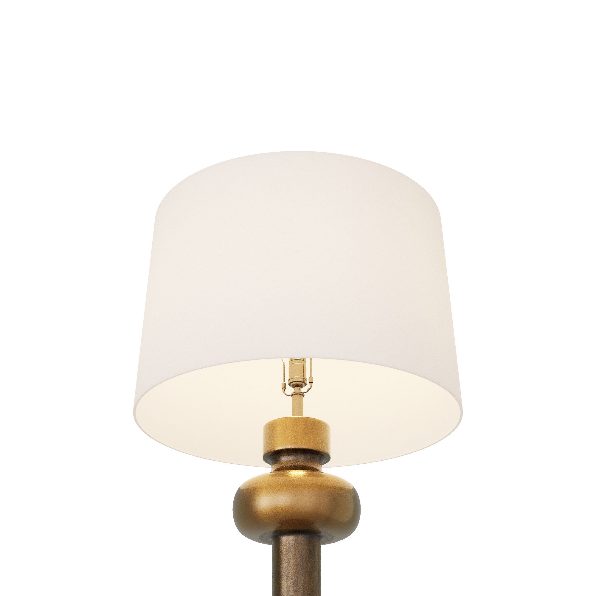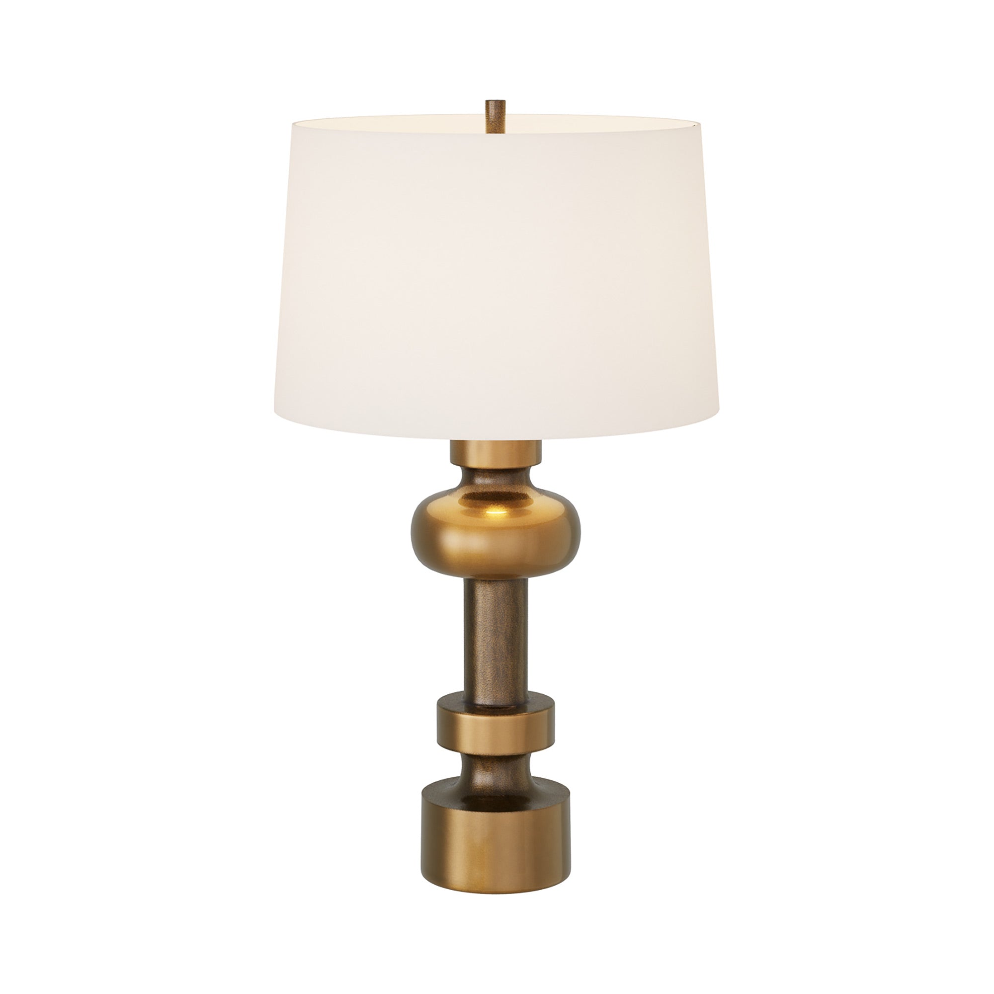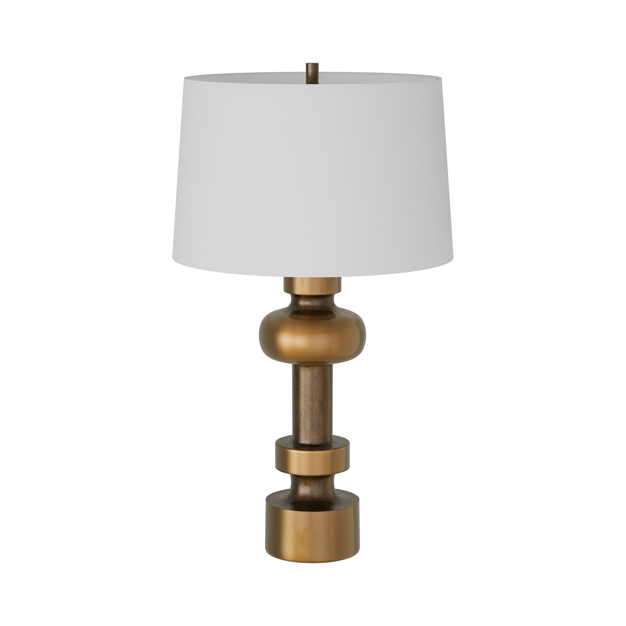 The Zamir Table Lamp from Arteriors exploits optical intrigue with a body of stacked geometric shapes, all fashioned of rich antique brass finish cast aluminum. A curious repackaging of mid-century fare is unapologetically modern as it complements bedrooms and living rooms with timeless beauty. A tapered ivory microfiber shade allows soft, energy-efficient lighting to accomplish its task.