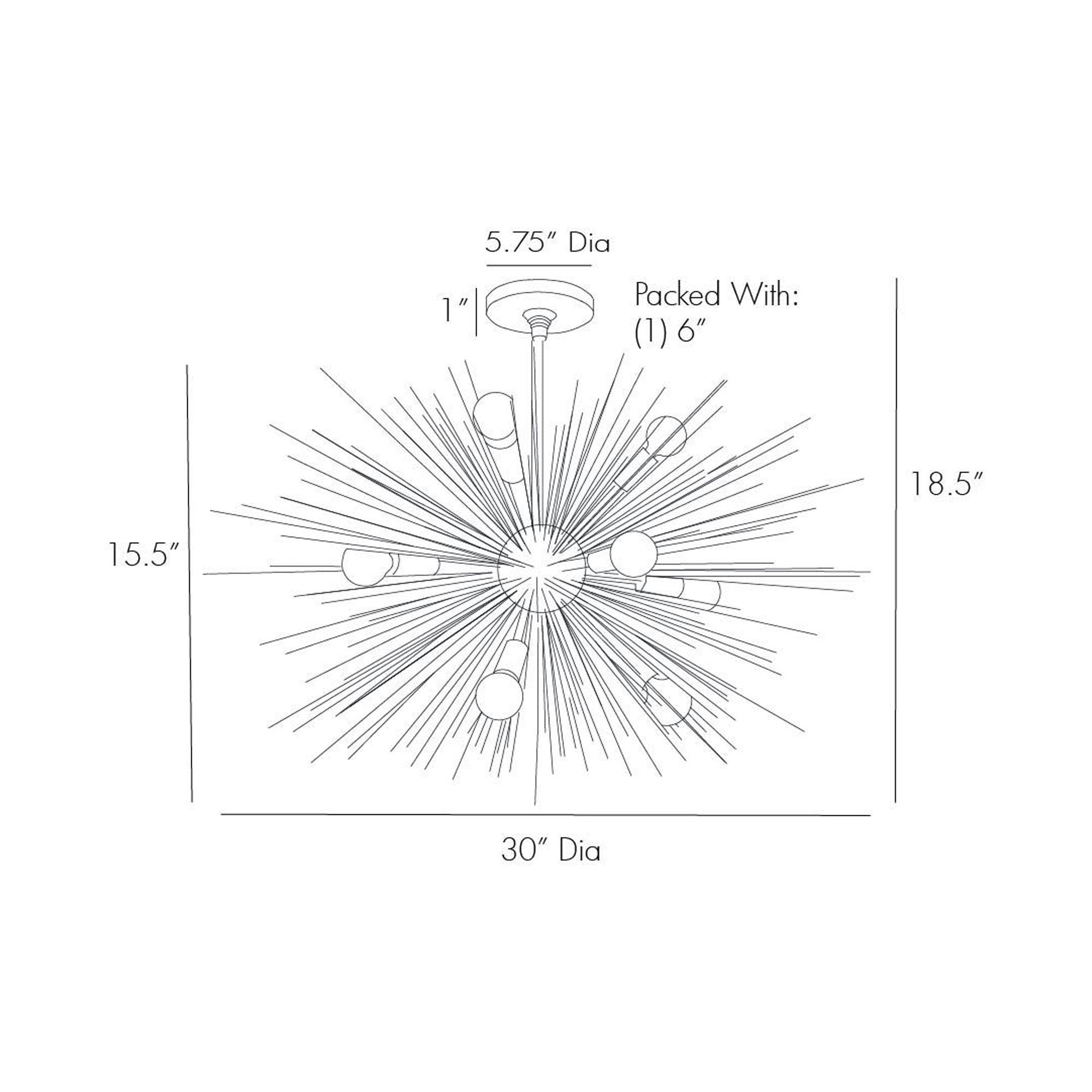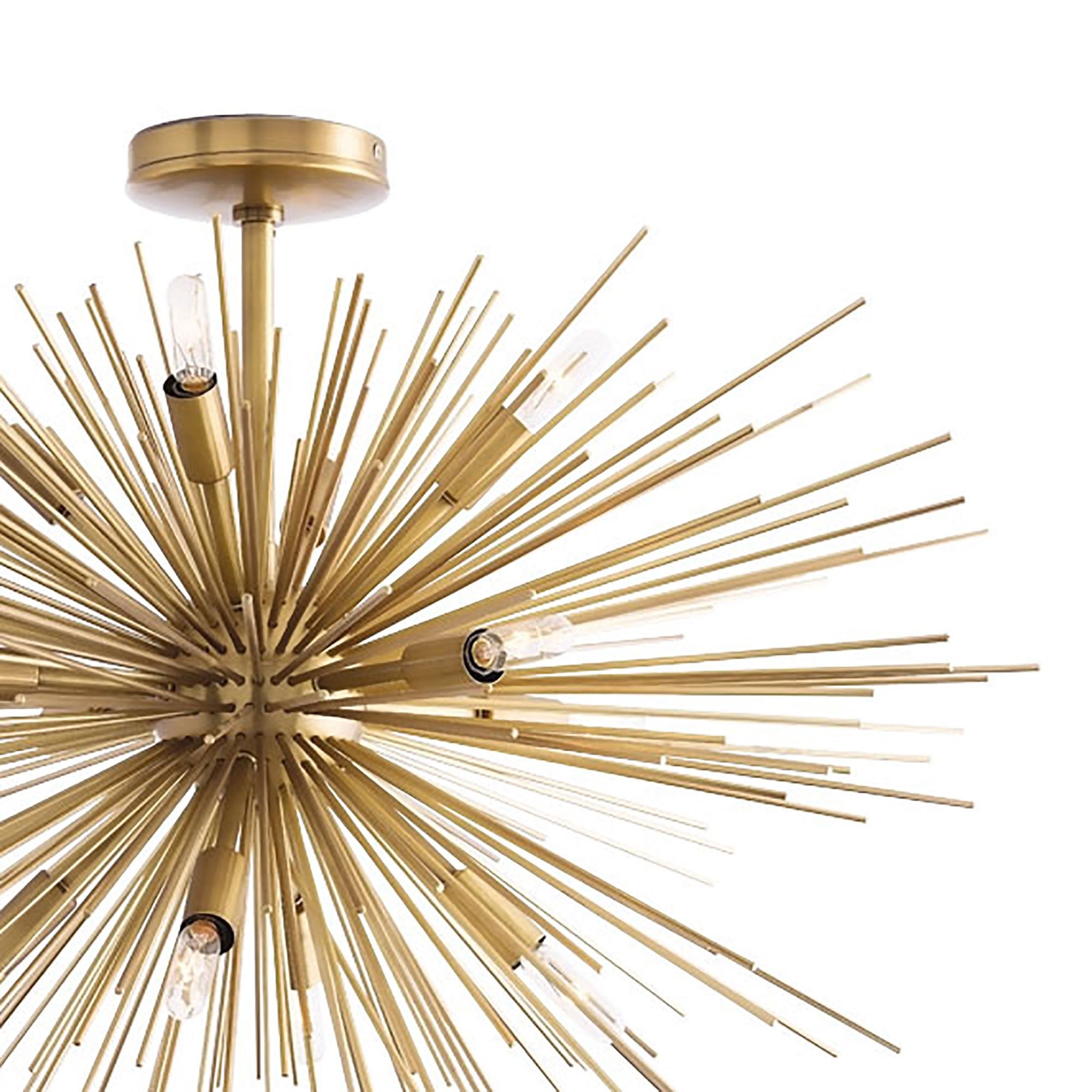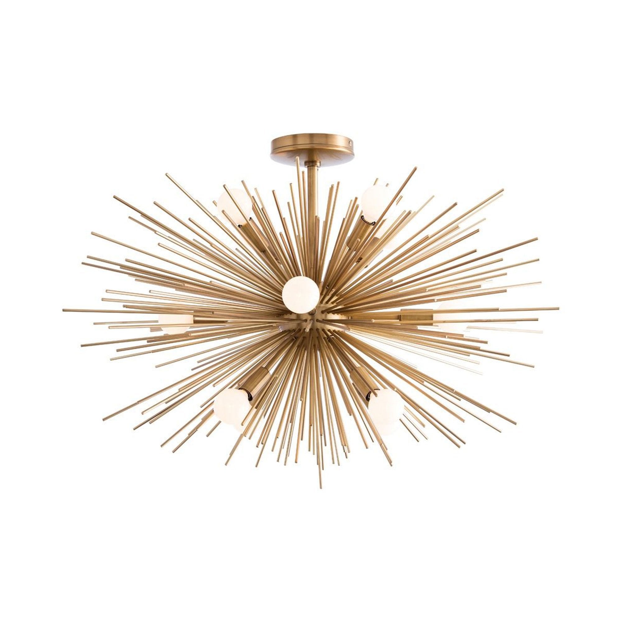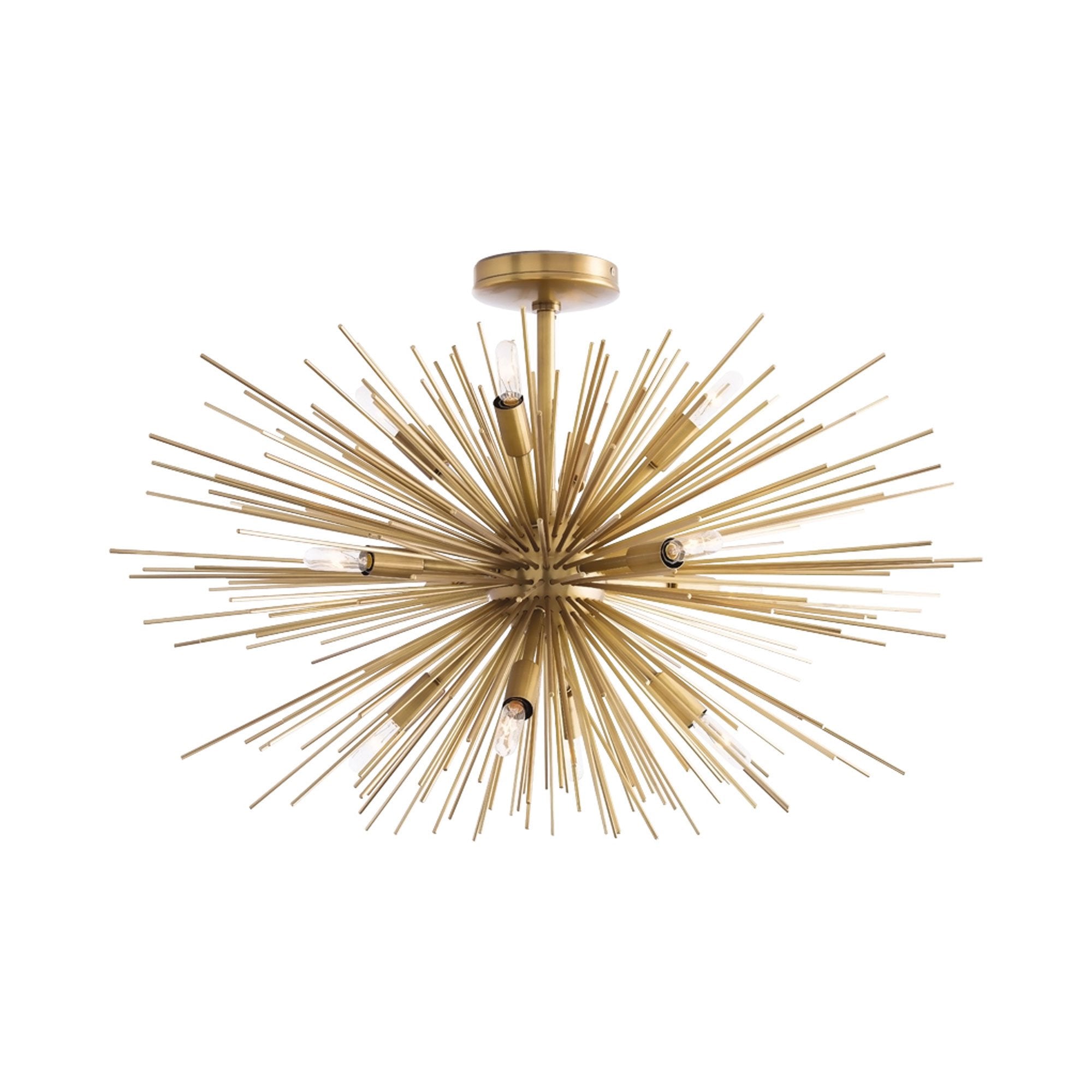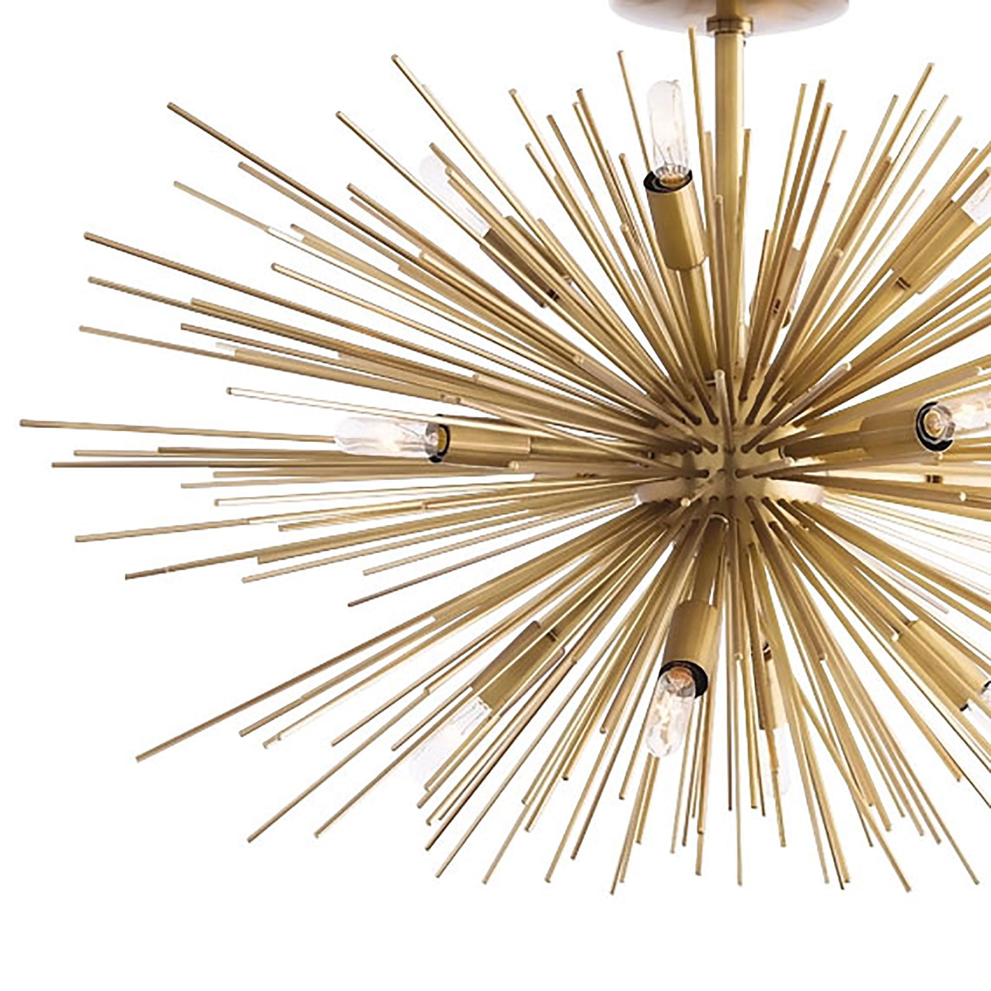 Especially designed for spaces with lower ceilings this new addition to our signature starburst Zanadoo collection has 12-lights. When installed with the 6" pipe it hangs 18.5 from the ceiling. Its steel frame is finished in antique brass. Shown with both frosted globe bulbs and small tubular bulbs. Damp rated: Approved for use in covered outdoor areas or bathrooms.