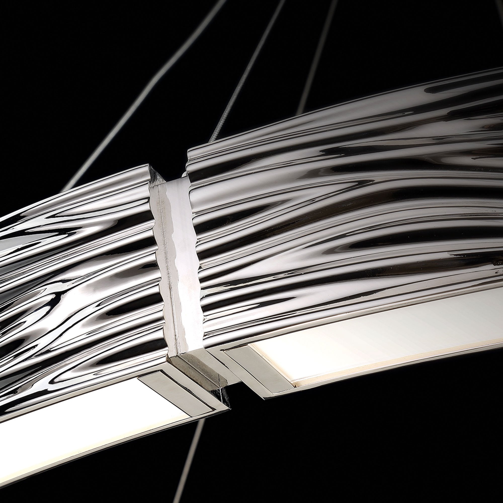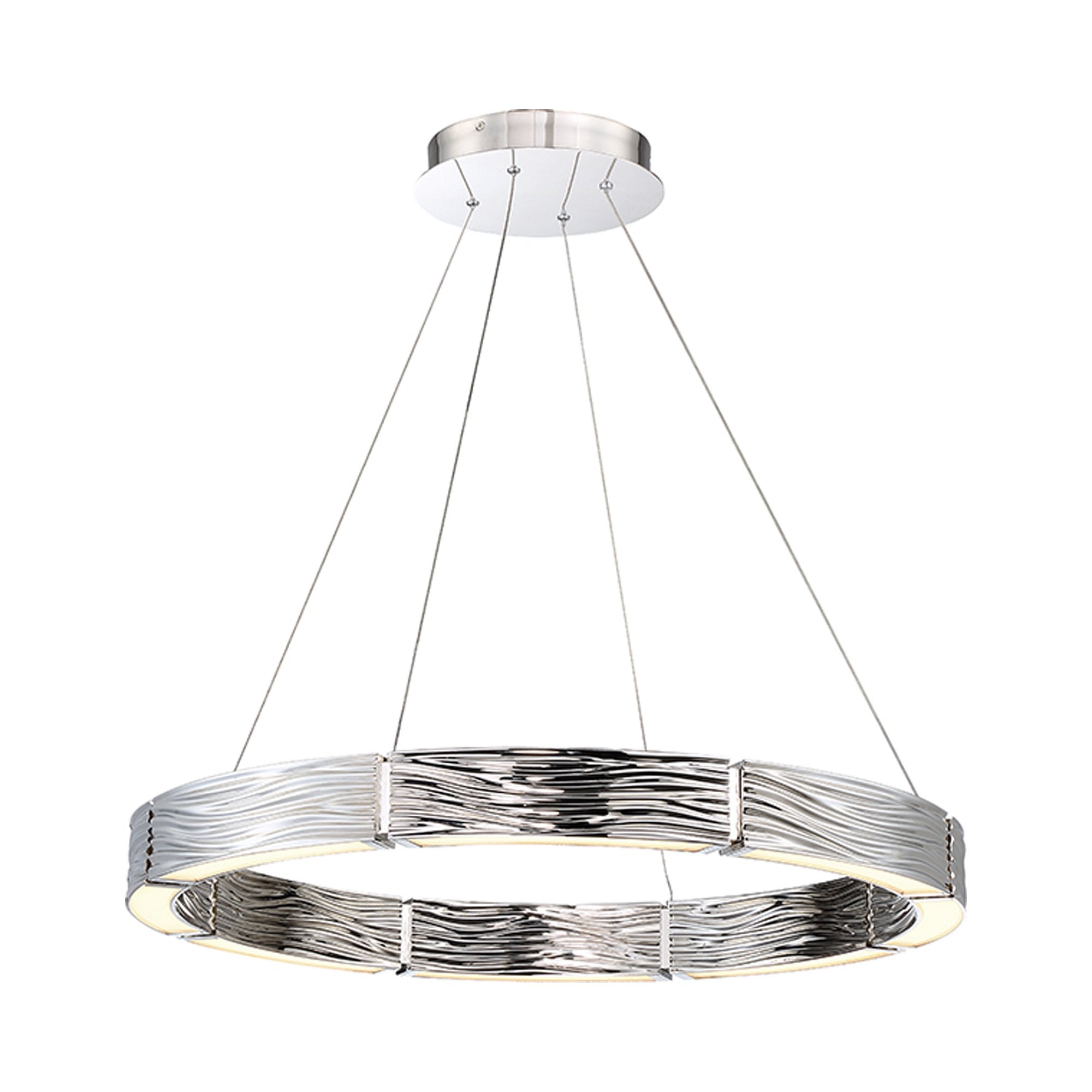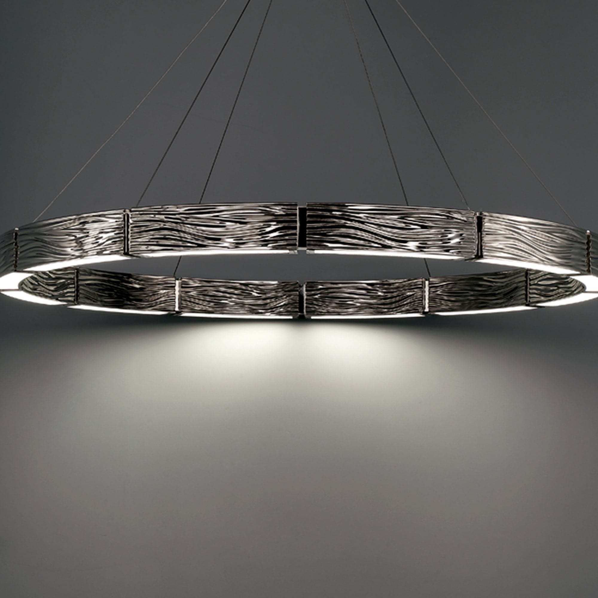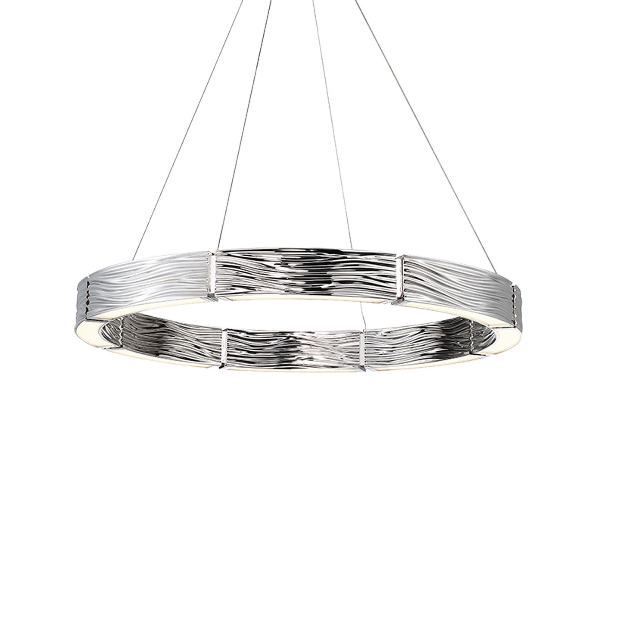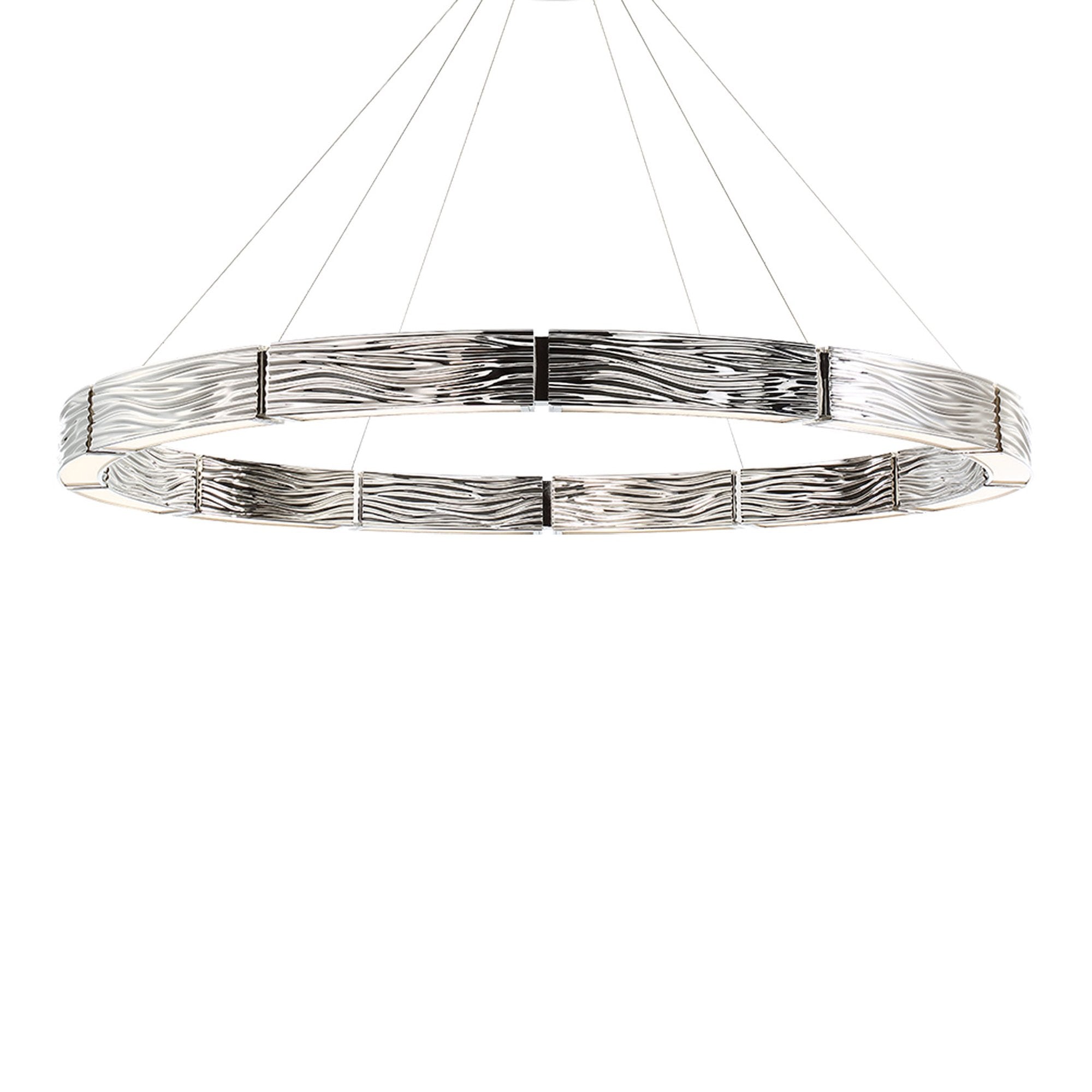 Cast Aluminum ripples in a mirror shine command attention on this regal chandelier, an elegant and glamorous addition to medium and large modern interiors across residential, hospitality and commercial applications. Downward illumination from high-performance, energy-efficient, highly rated LEDs casts excellent functional lighting at just the right warmth and brightness. Finished in polished nickel.