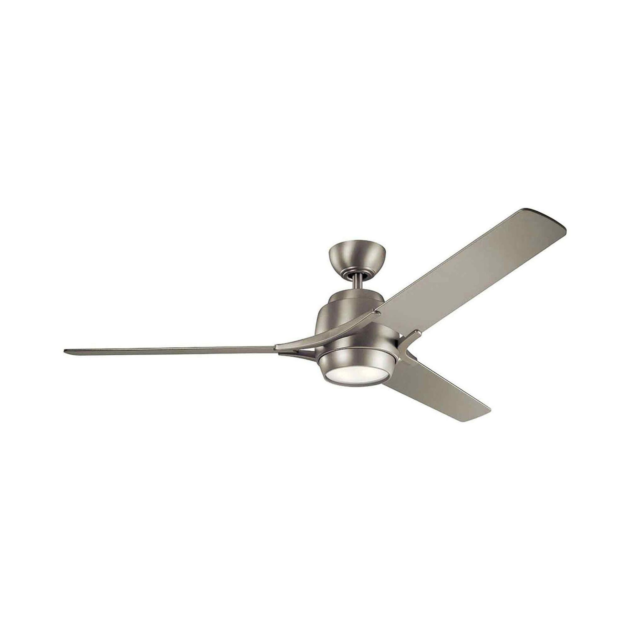 The 60 inch ceiling fan from the Zeus collection touts simple, yet powerful lines, a Brushed Nickel, Polished Nickel and White finish and sleek blade arm design, perfect for a contemporary setting. Its three interconnected blades feature a Silver finish and also include two irons per blade. Zeus features an LED focal light with transparent polycarbonate diffuser.