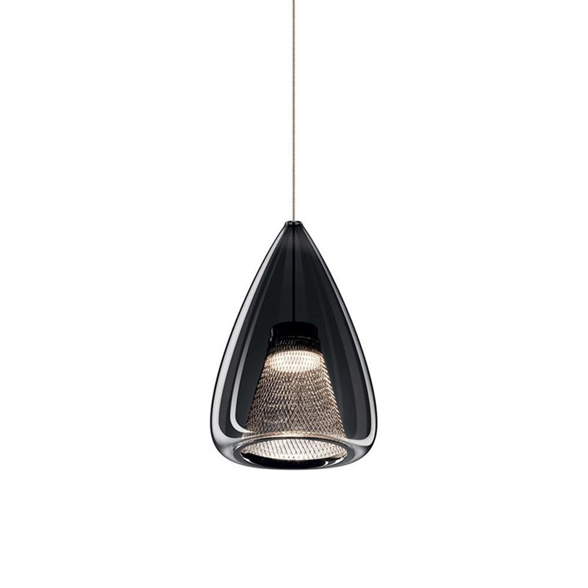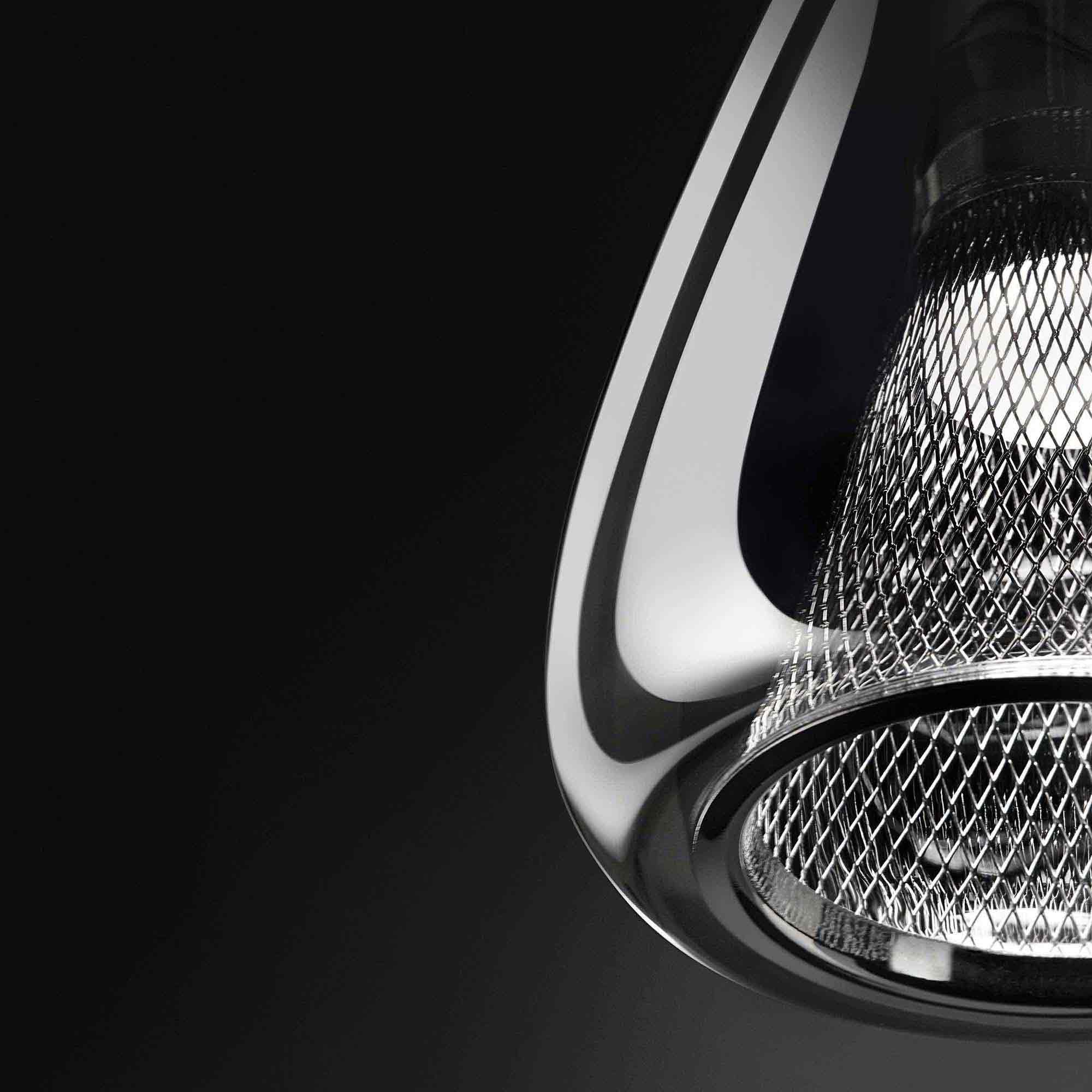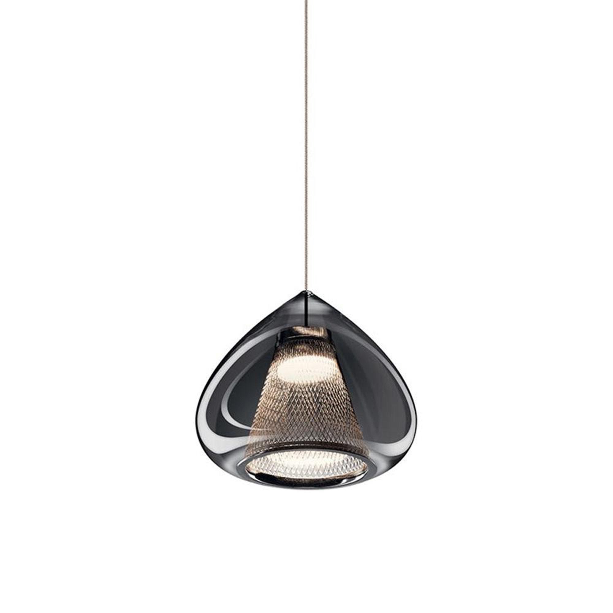 A rich, smoky outer glass nestles a polished chrome mesh shade for a dazzling effect. Choose one pendant or several to create a dramatic focal point in a room.