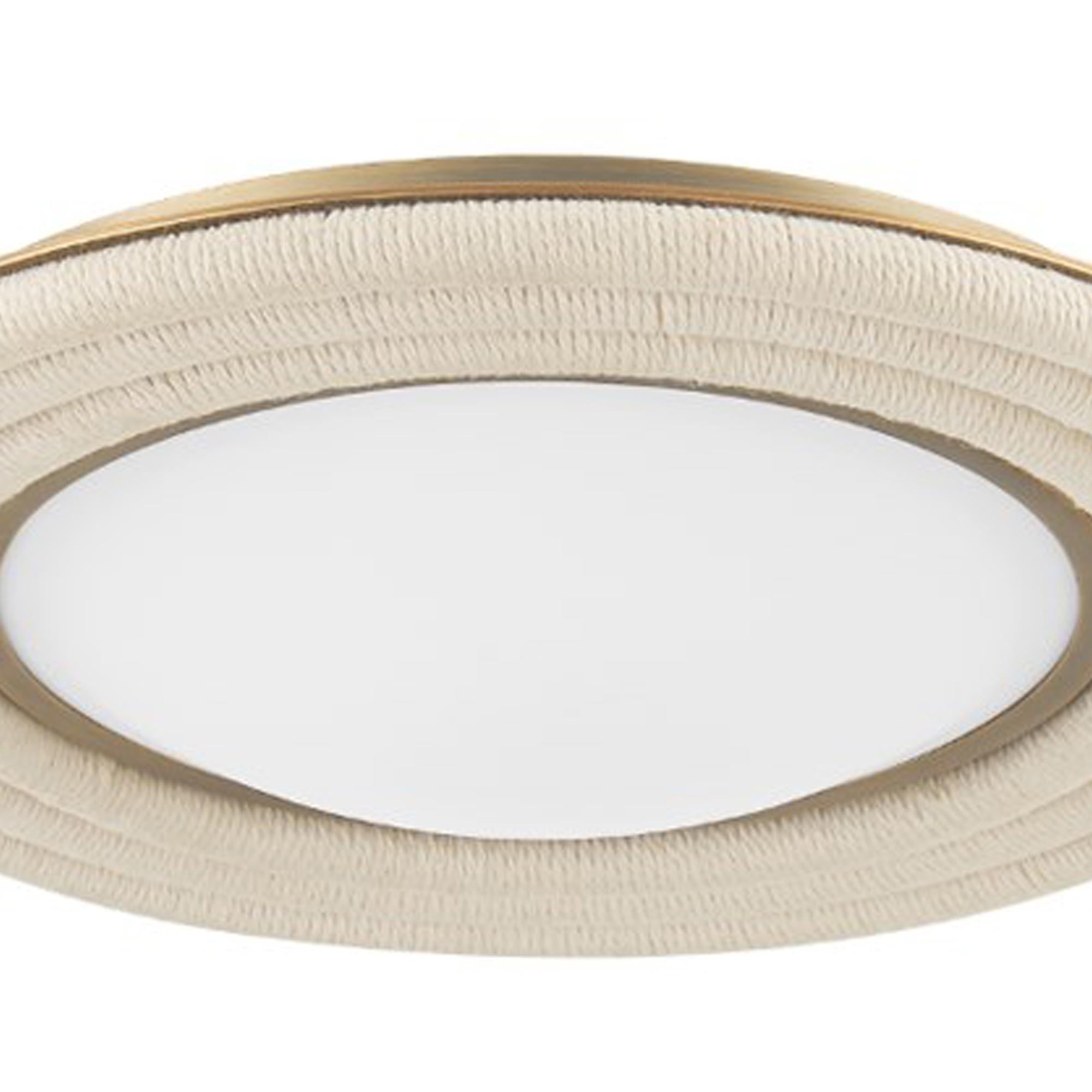 Whimsical style centers on a festive aesthetic as the Zion LED Flush Mount Ceiling Light from Troy Lighting becomes the center of attention in a contemporary living space. Natural intrigue follows concentric circles made of white cotton rope that surrounds a sleek opal matte shade, offering an interestingly glam version of coastal casual. This irreplaceable ceiling light sends energy-efficient lighting around a kitchen, hallway, or entryway.