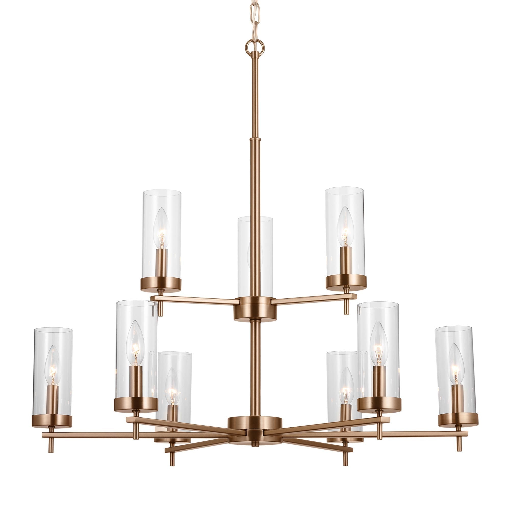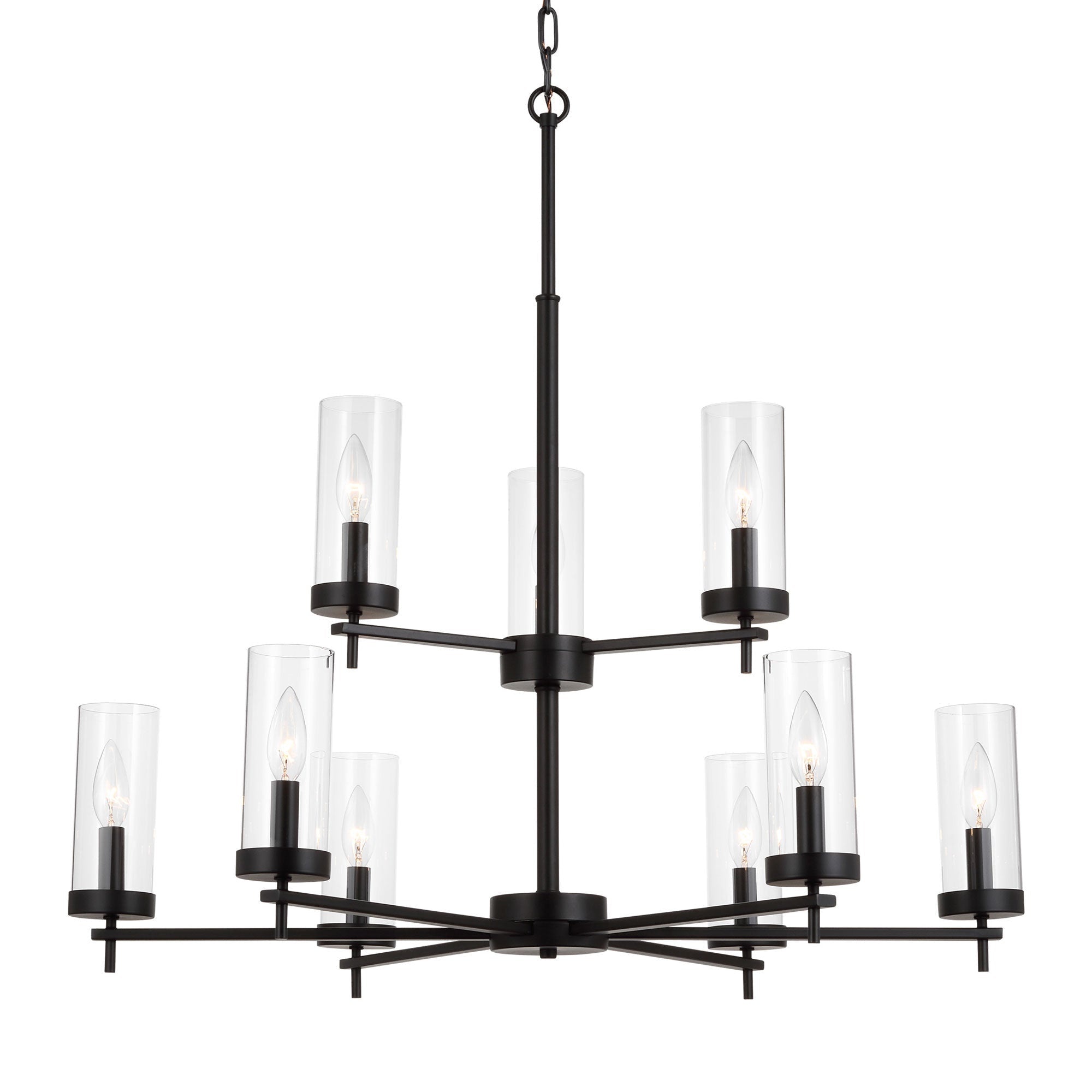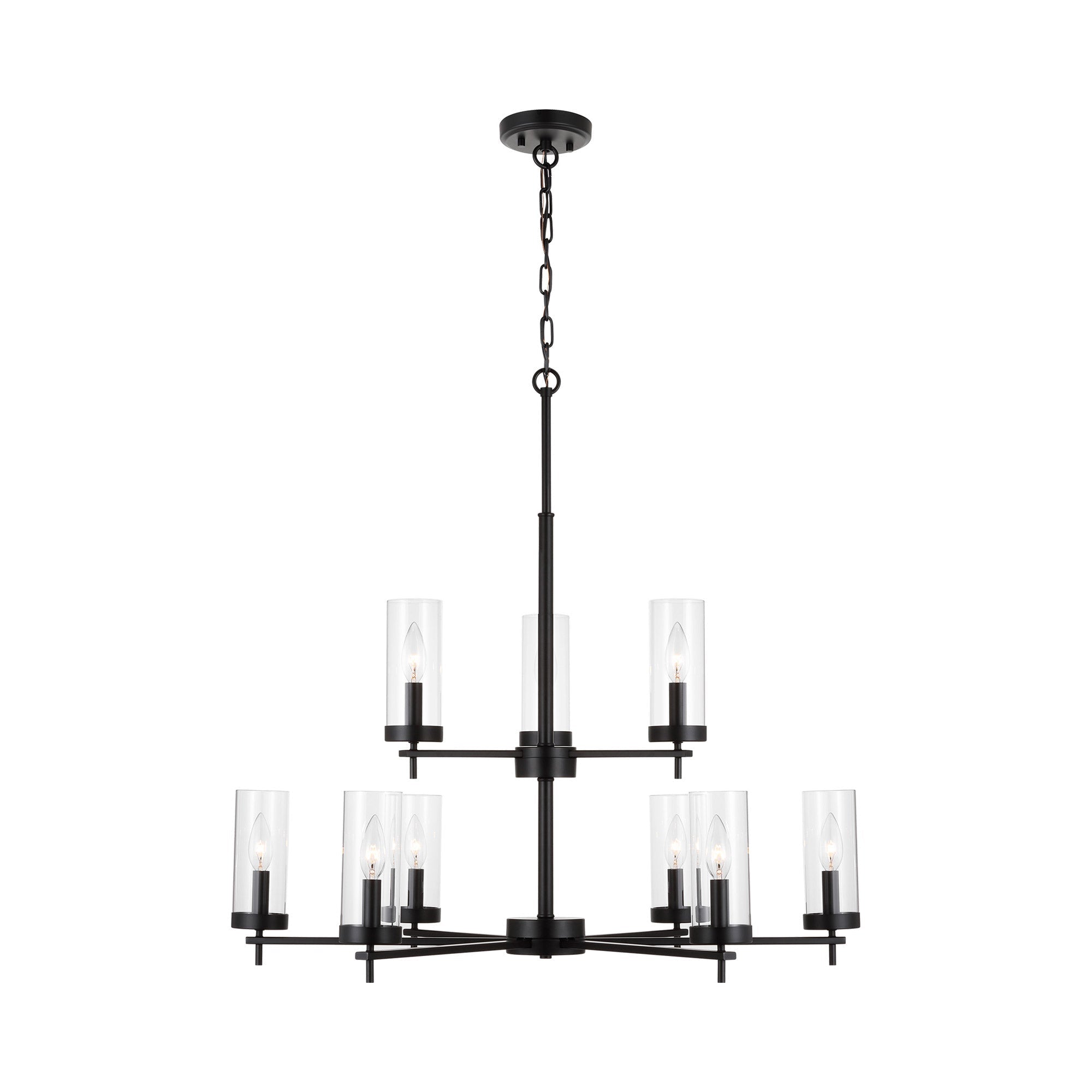 A tasteful modern look blends glass and metal with a symmetrical silhouette, adding a sophisticated light source to a dining or living space. This glam-inspired Zire Multi Tiered Chandelier from Visual Comfort Studio offers nine clear glass cylinder shades carefully spaced and mounted to a gleaming metal frame with a web base, delivering glowing illumination and a chic artisan effect.