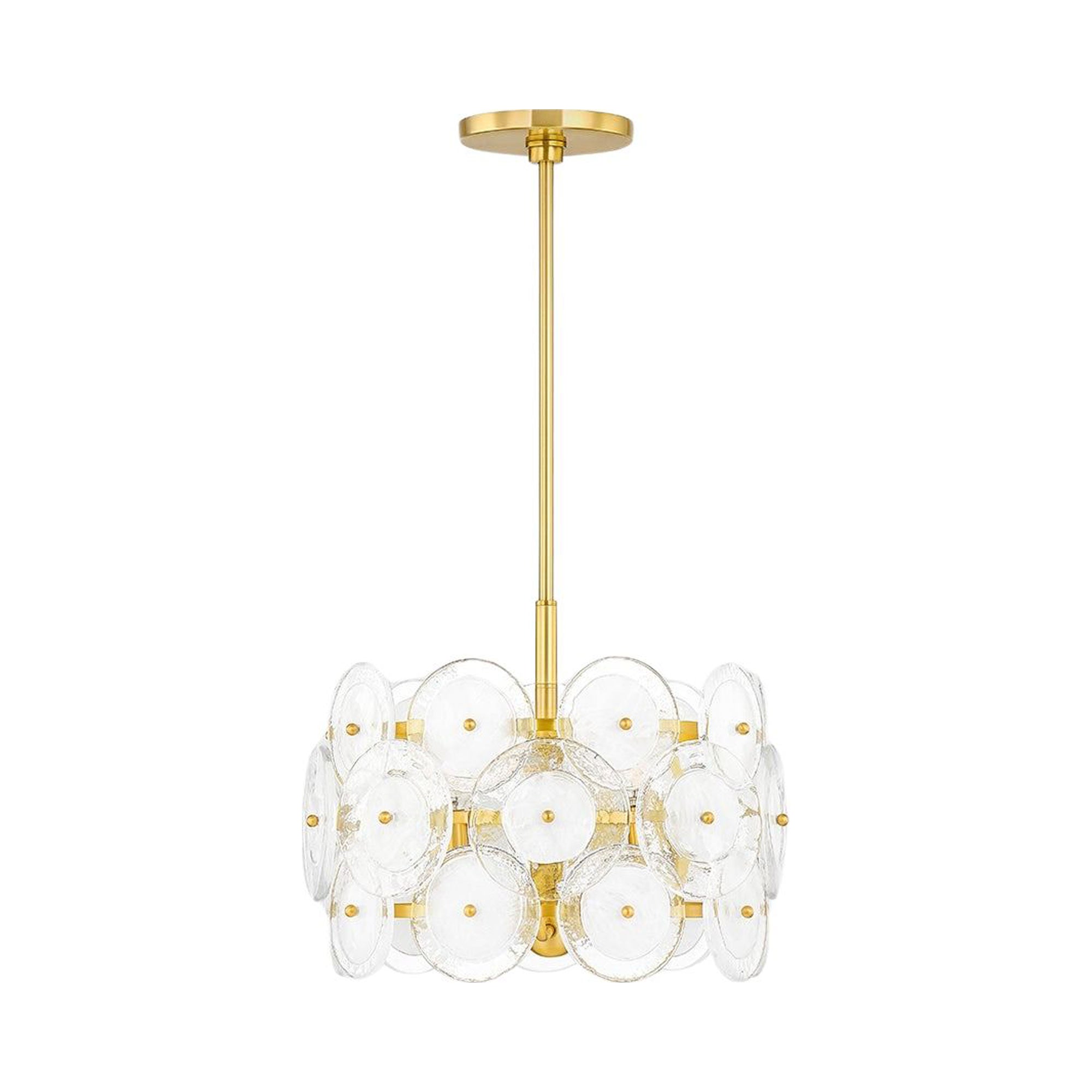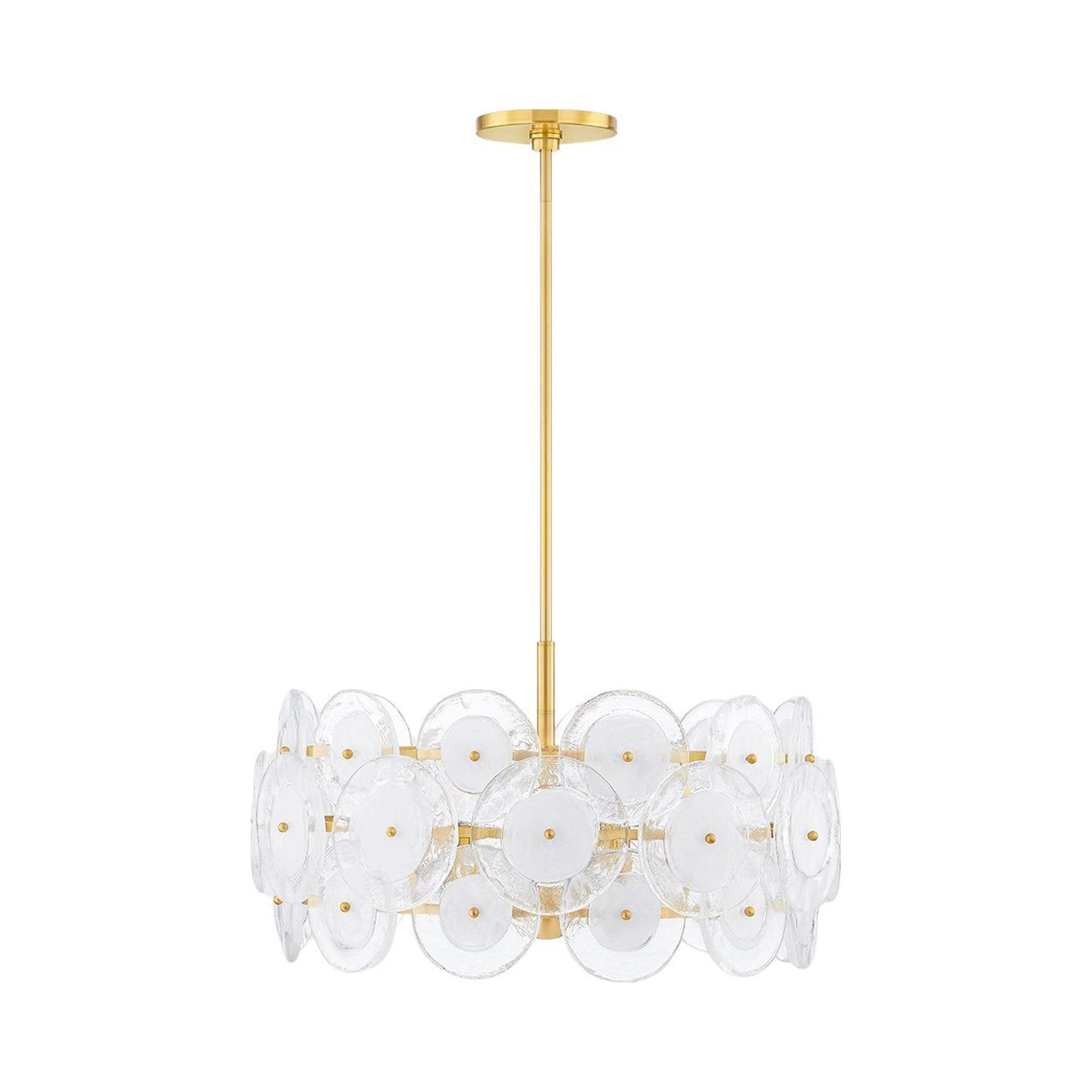 Opaque Blonchino details pair with discs of clear cast glass to create a stunning drum shade for the Zoella Pendant Light from Mitzi. A striking arrangement of glass shades the light within, assuring a soft, glowing ambiance in your home. An aged brass accent finish complements to perfection with a sense of warmth and glamour.